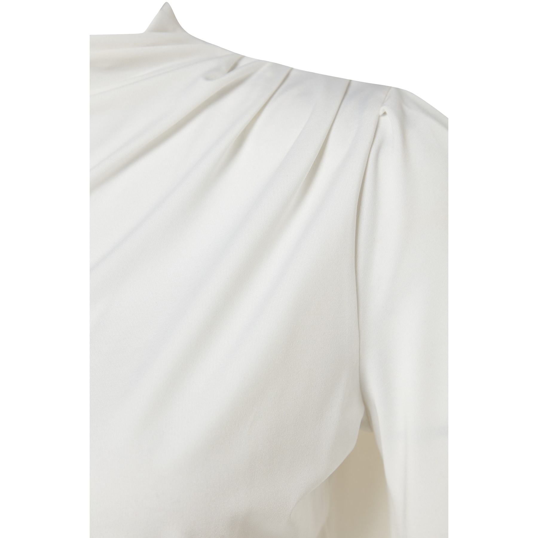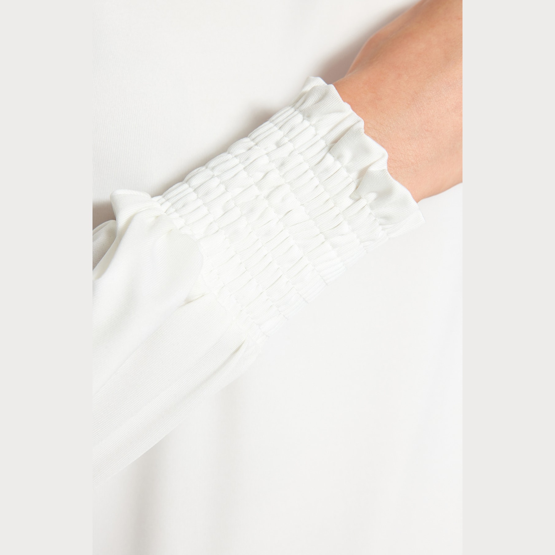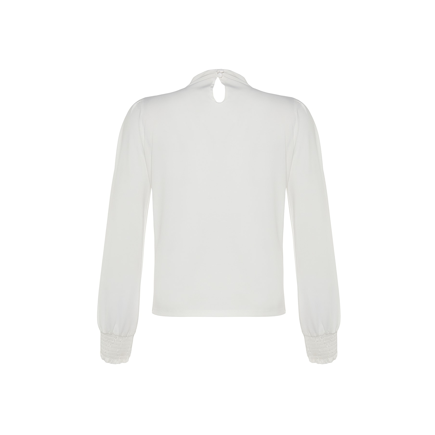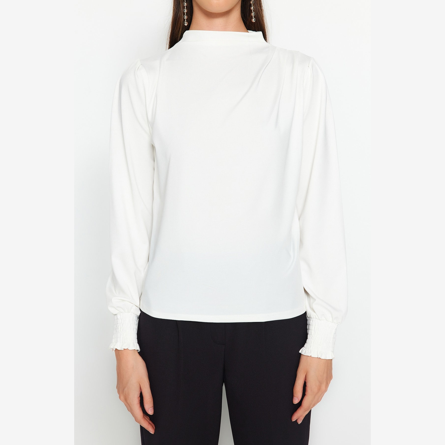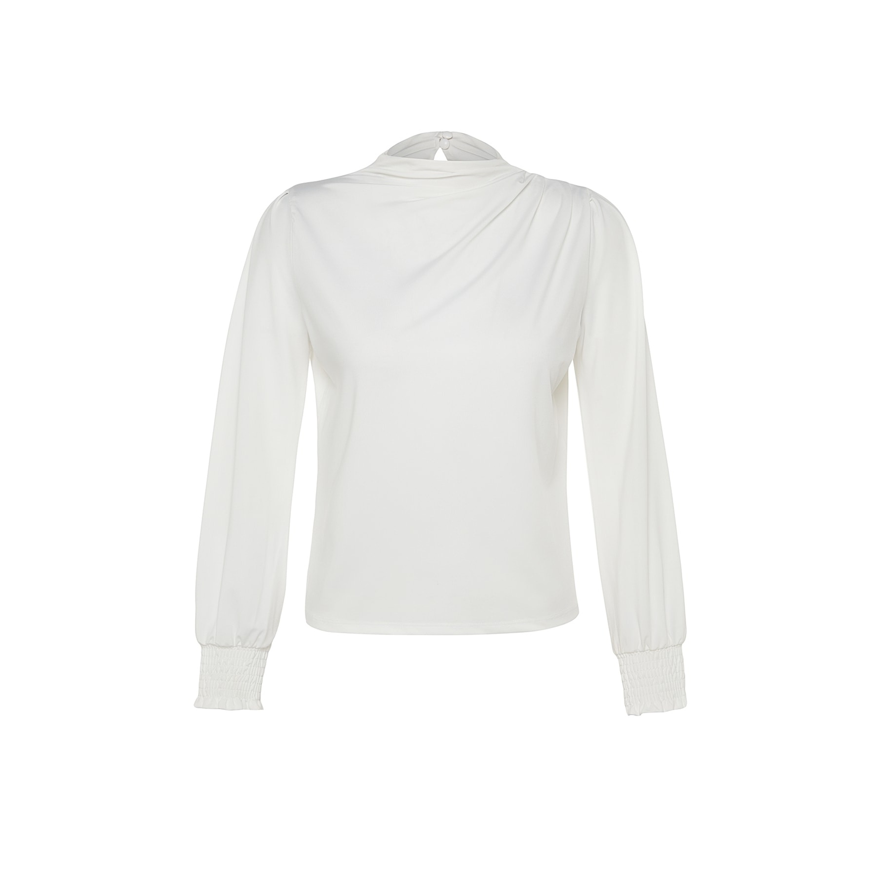 بلوزة نسائية – أوف وايت بياقة مرتفعة وتفاصيل مطاطية (إطلالة ناعمة بخامة مرنة مريحة)