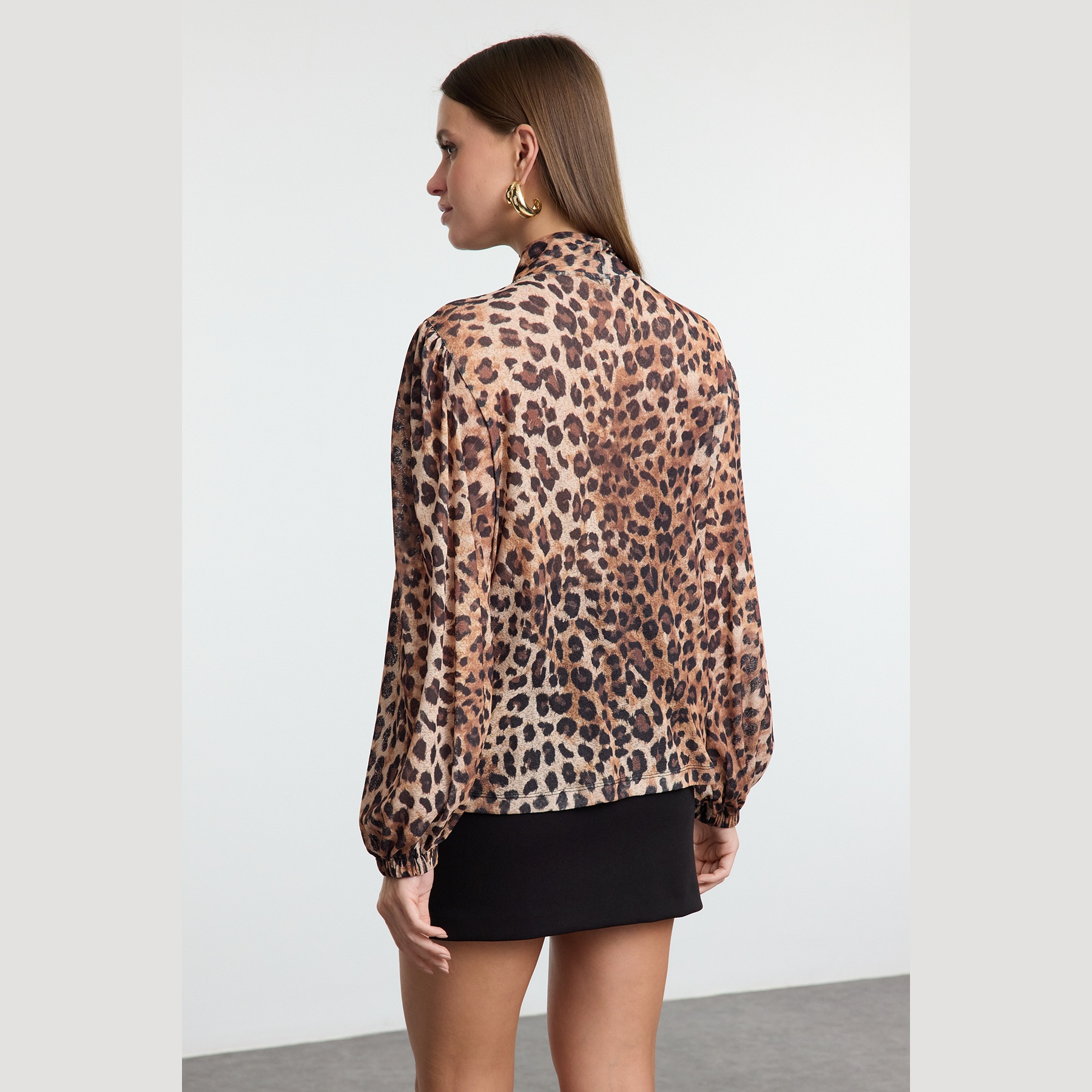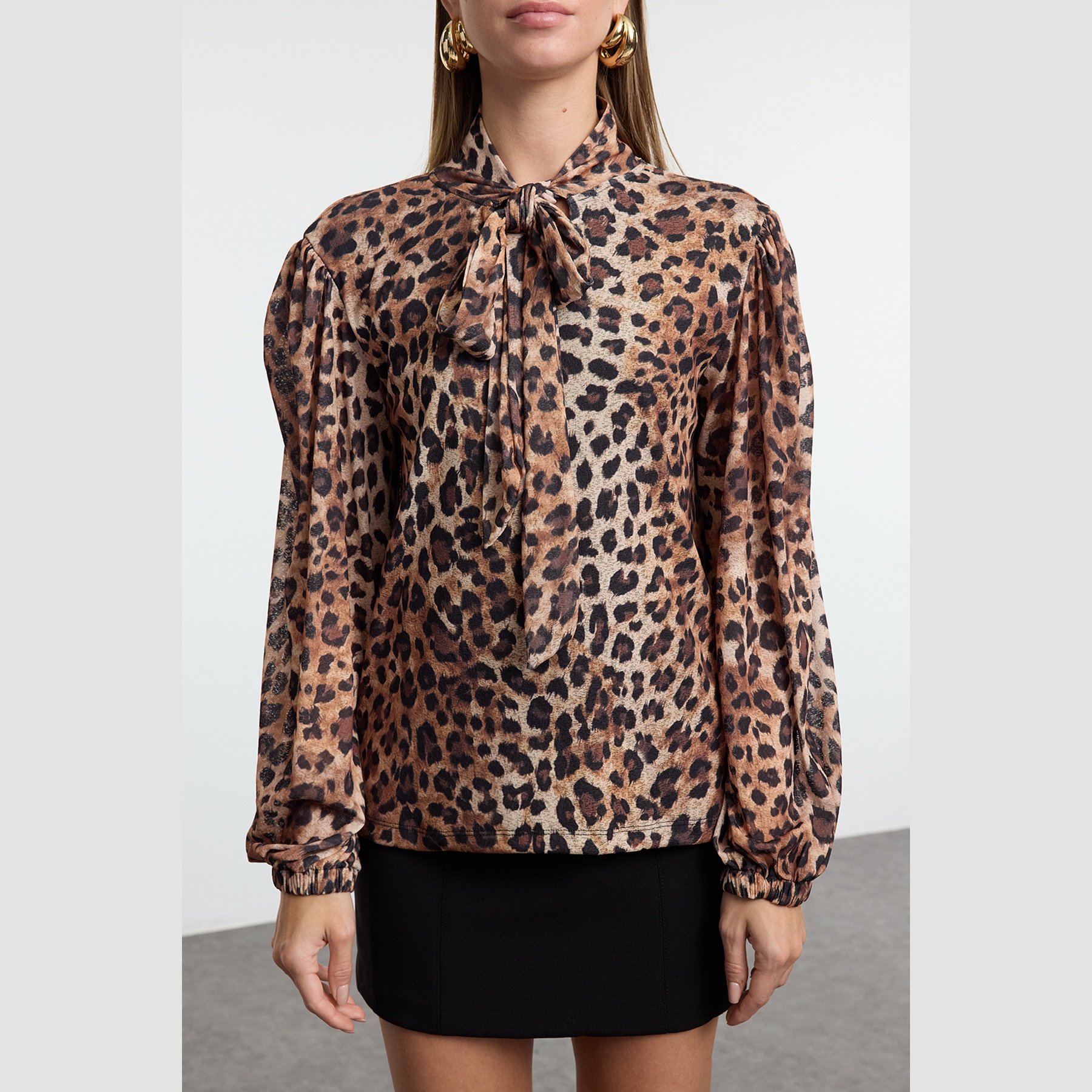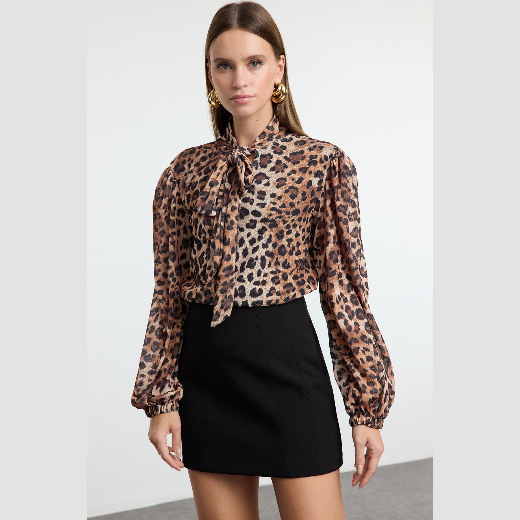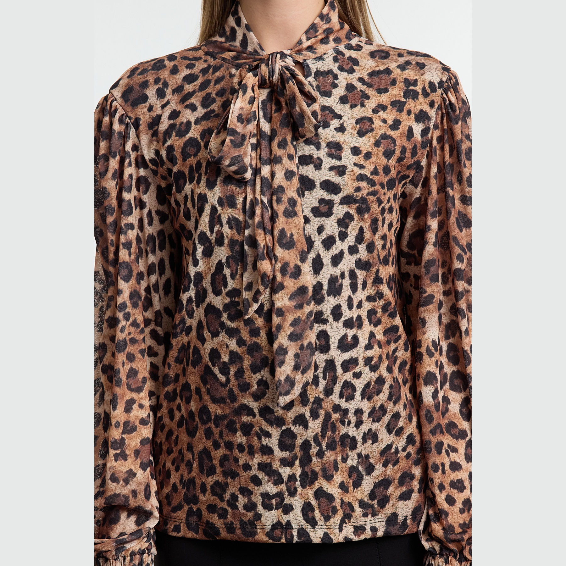 بلوزة نسائية – متعددة الألوان بطبعة ليوبارد وياقة فولار (إطلالة جريئة بخامة خفيفة مريحة)