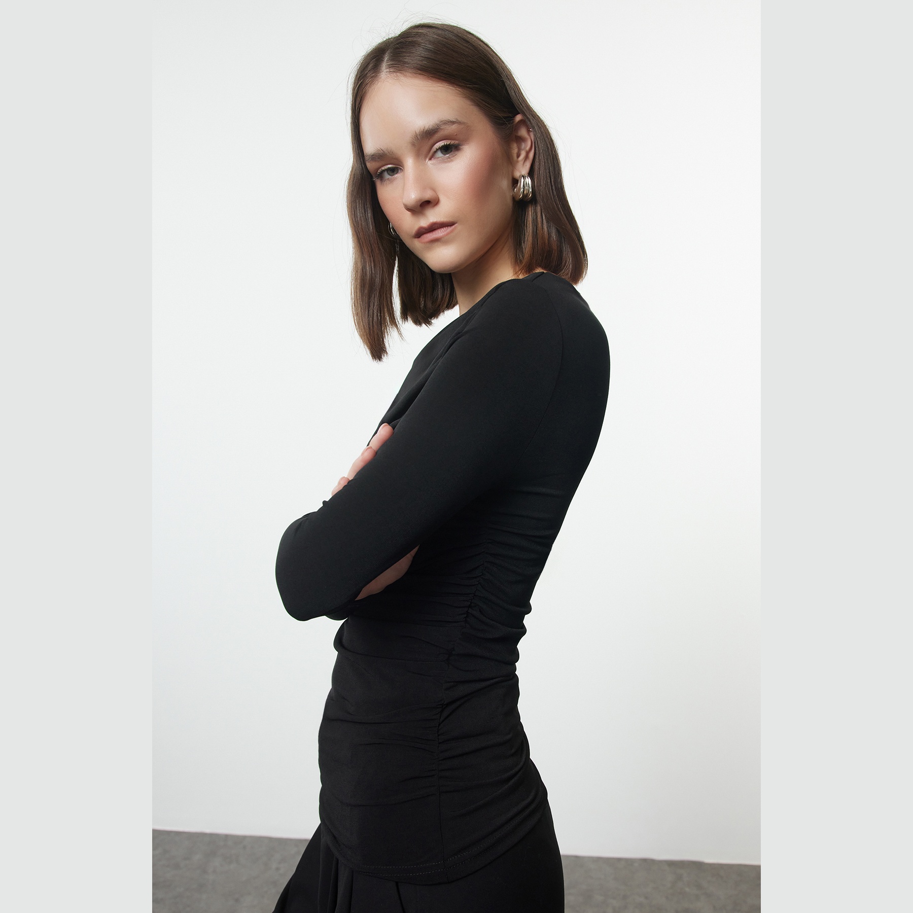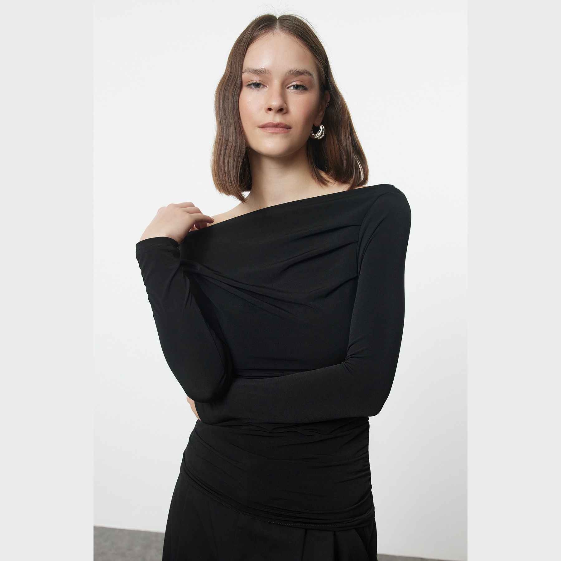 بلوزة نسائية بلون أسود، مصنوعة من خامة محاكة مرنة بتركيبة من البوليستر والإيلاستان، تمنح راحة مثالية وملمسًا ناعمًا على البشرة. تأتي بقصة ضيقة وياقة غير متماثلة وأكمام طويلة، وتتميز بتفاصيل بُزُوغ/دِرَابِيه تضيف لمسة أنثوية أنيقة على الإطلالة.