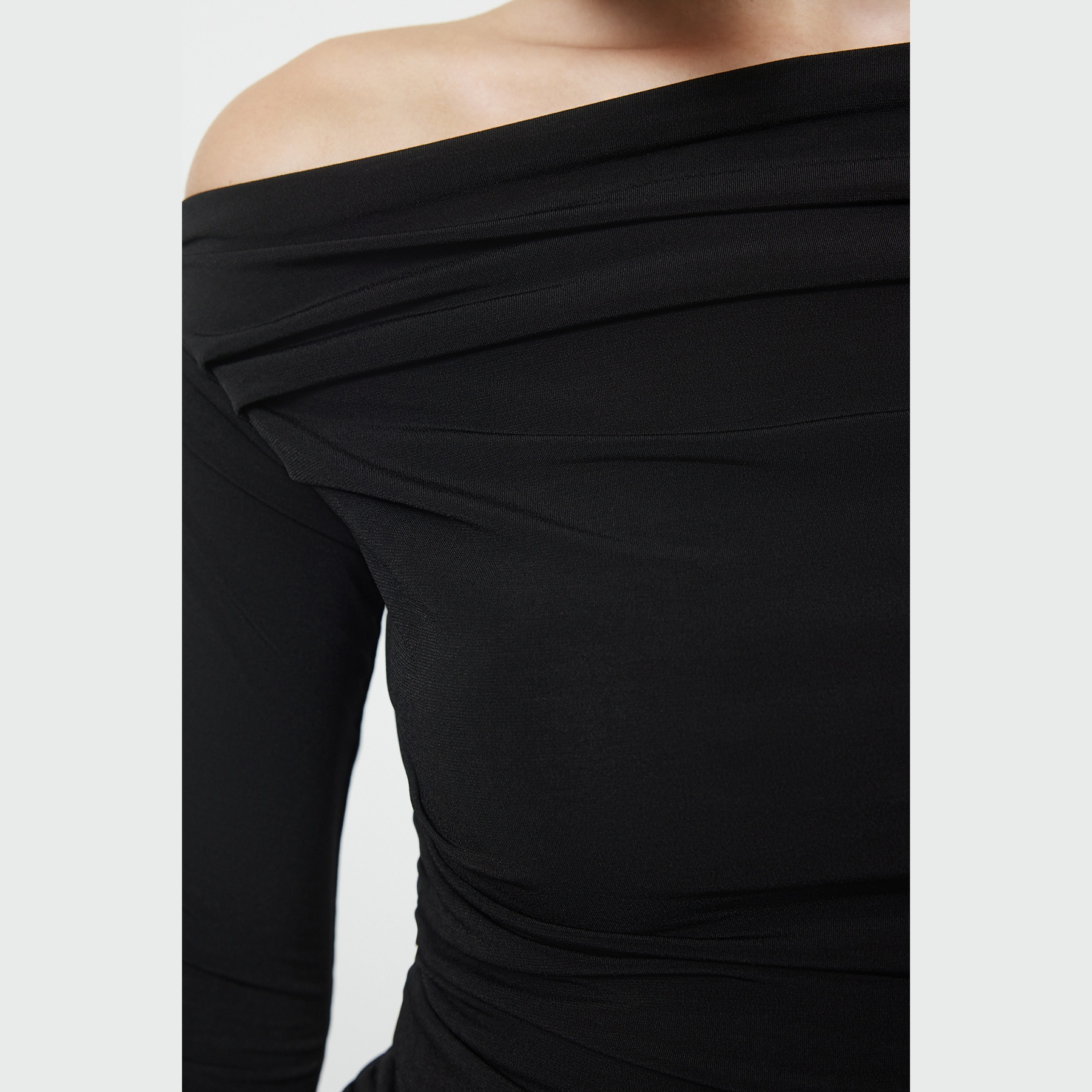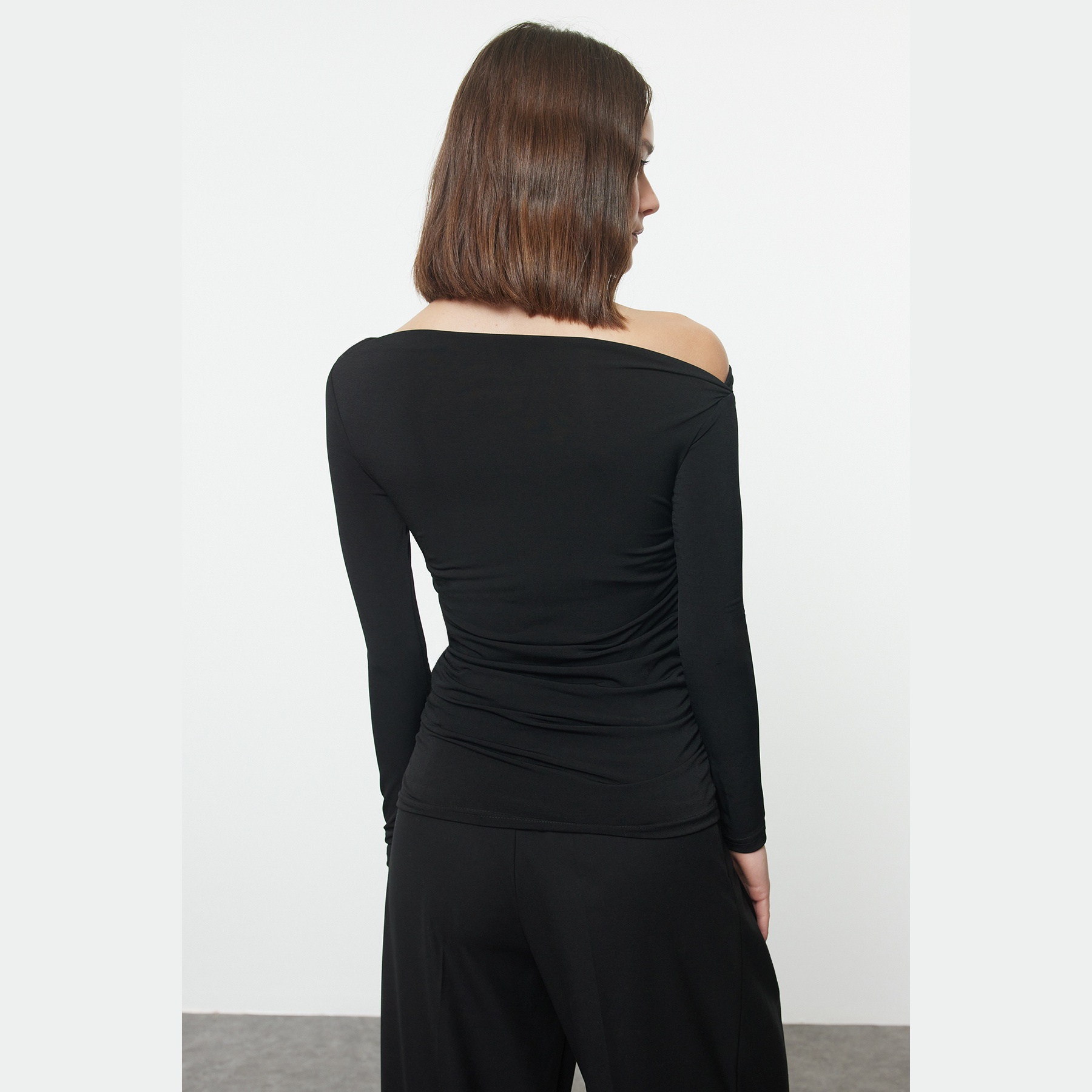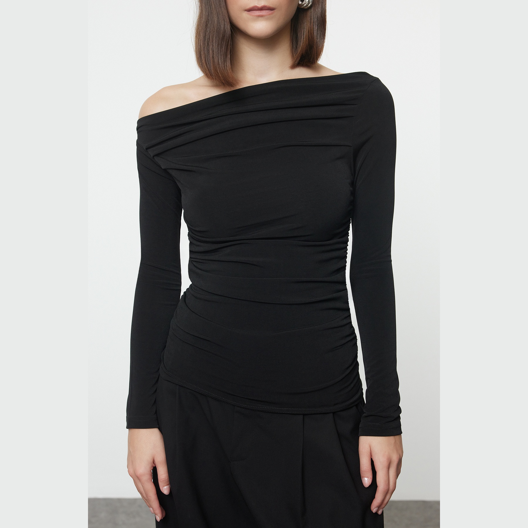 بلوزة نسائية – أسود بتفاصيل بُزُوغ وياقة غير متماثلة (إطلالة أنثوية ضيقة بخامة مرنة ناعمة)