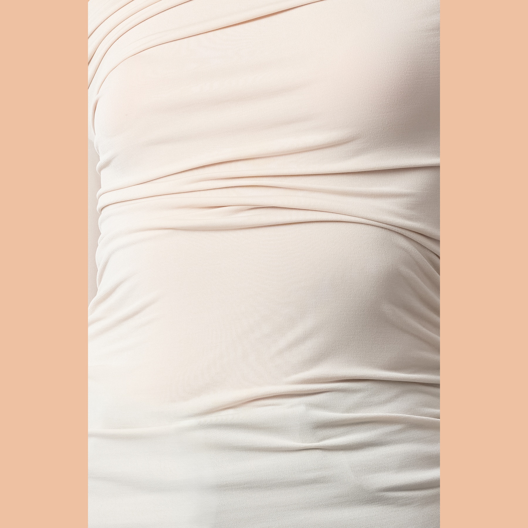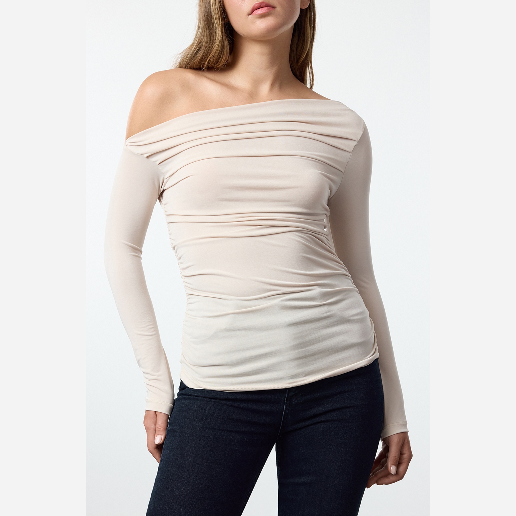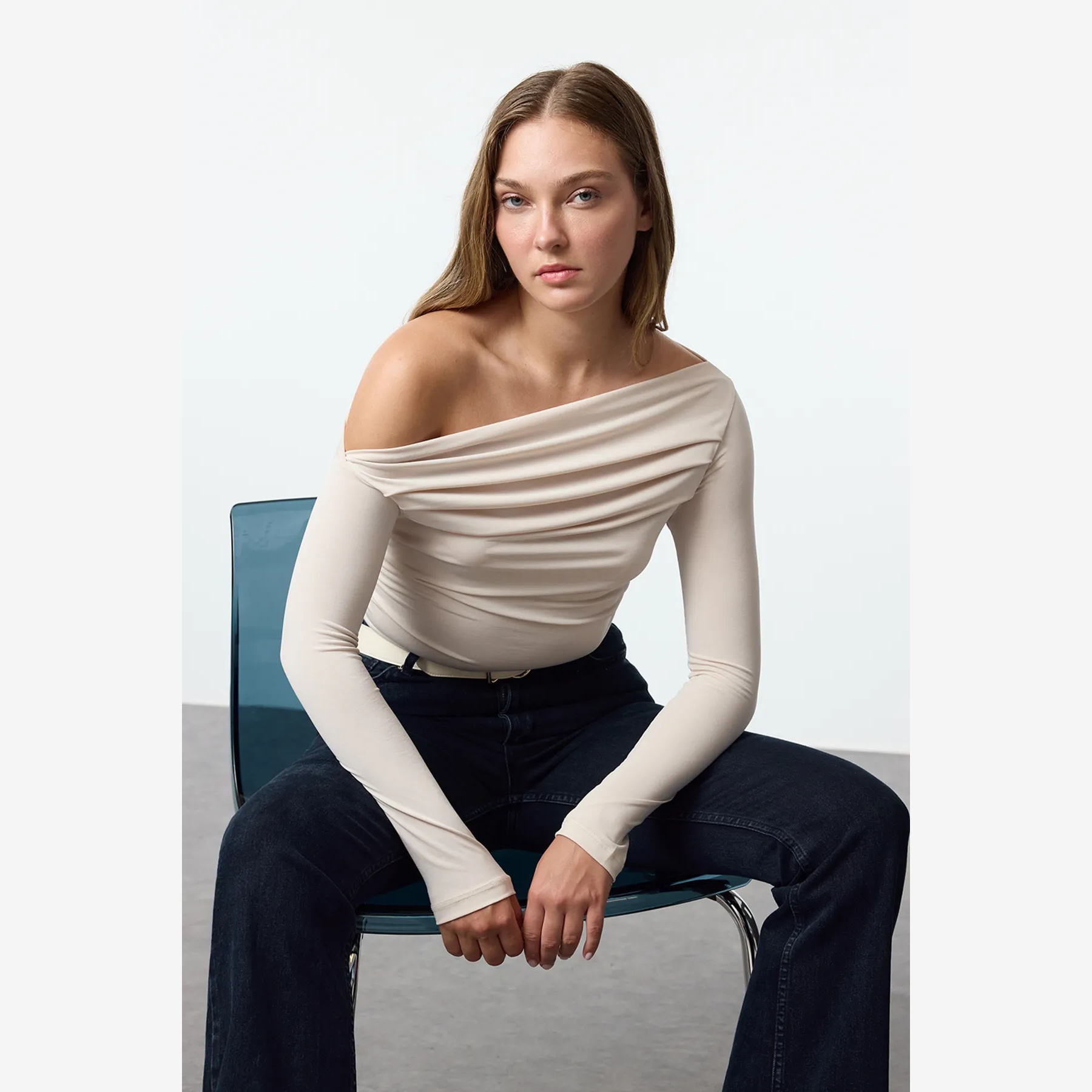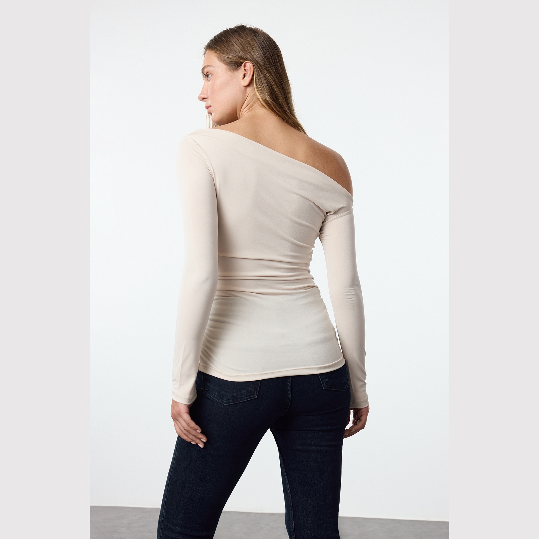 بلوزة نسائية – رملي بتفاصيل بُزُوغ وياقة غير متماثلة (إطلالة أنثوية ضيقة بخامة مرنة ناعمة)