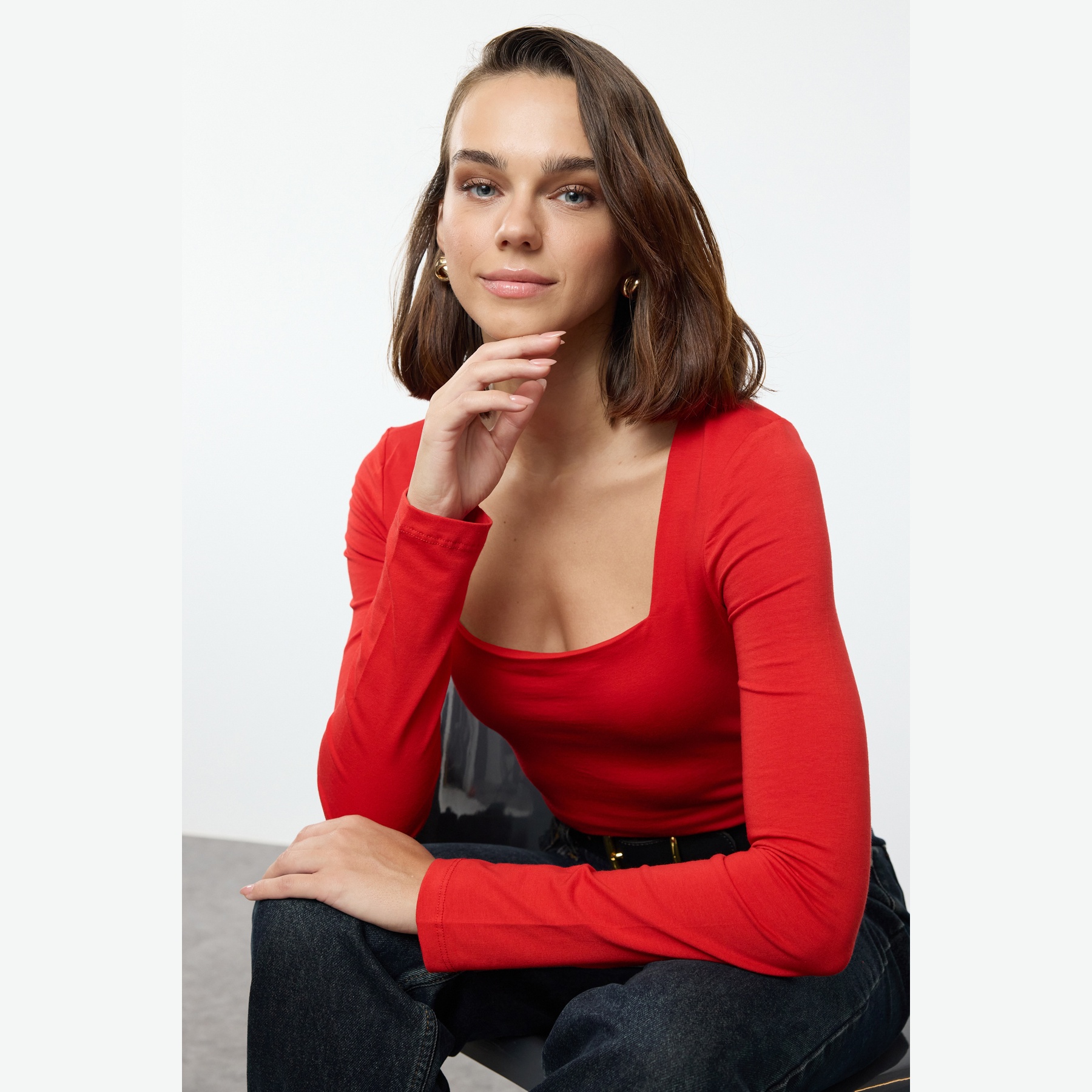 بلوزة نسائية – أحمر بياقة مربعة وقصة منتظمة (إطلالة أساسية بخامة قطنية مرنة)