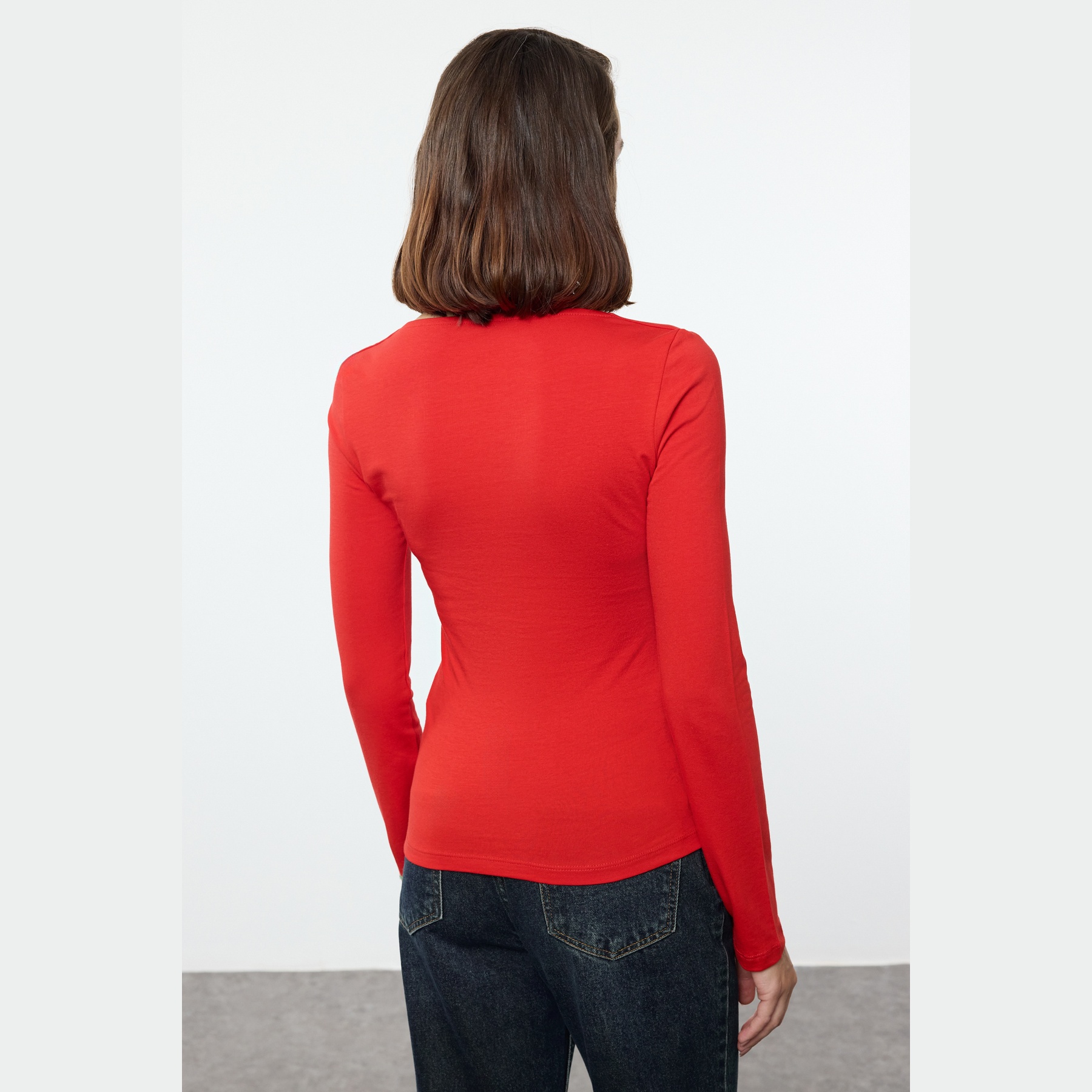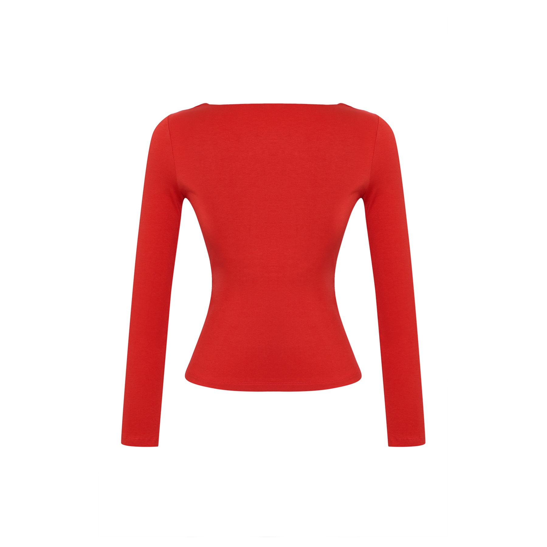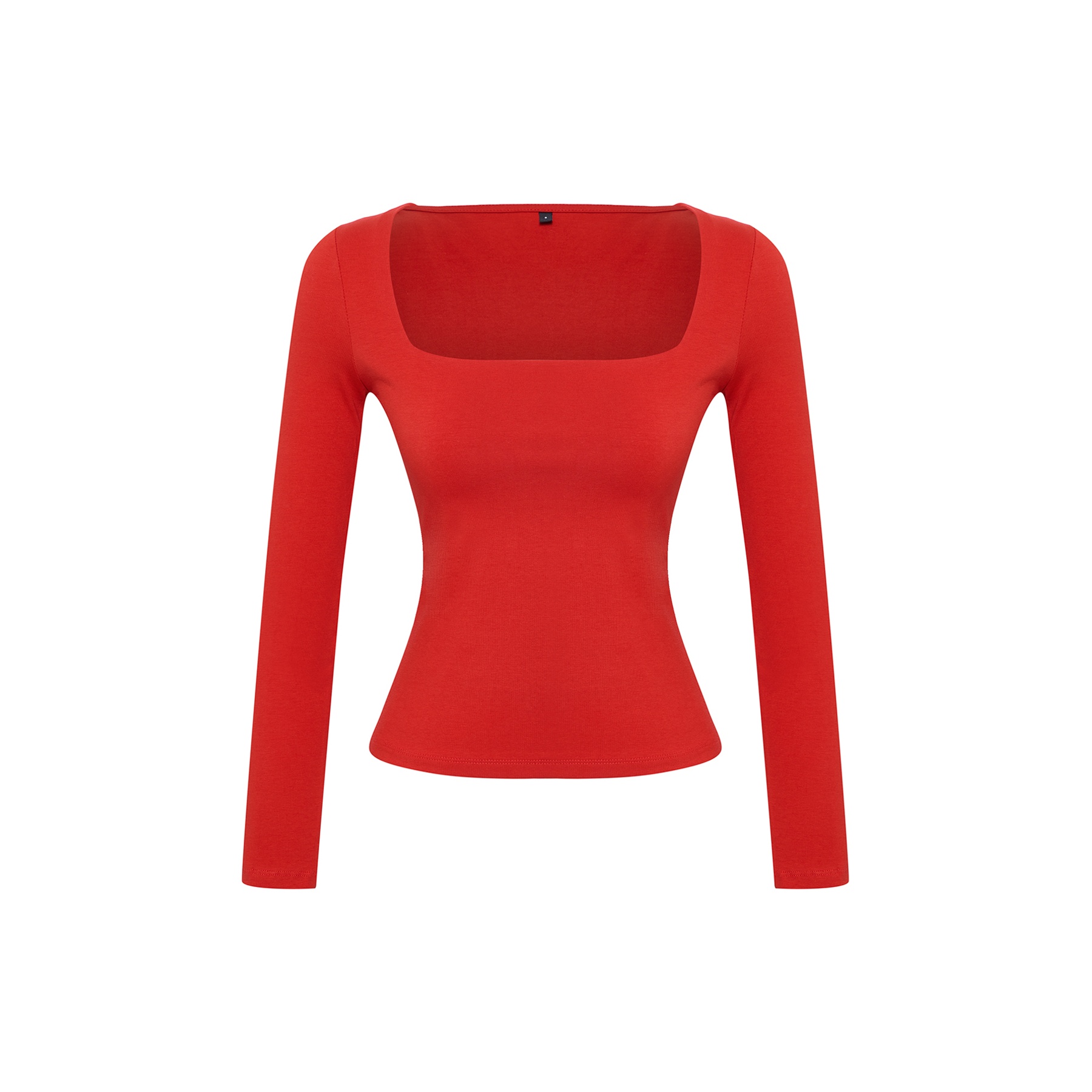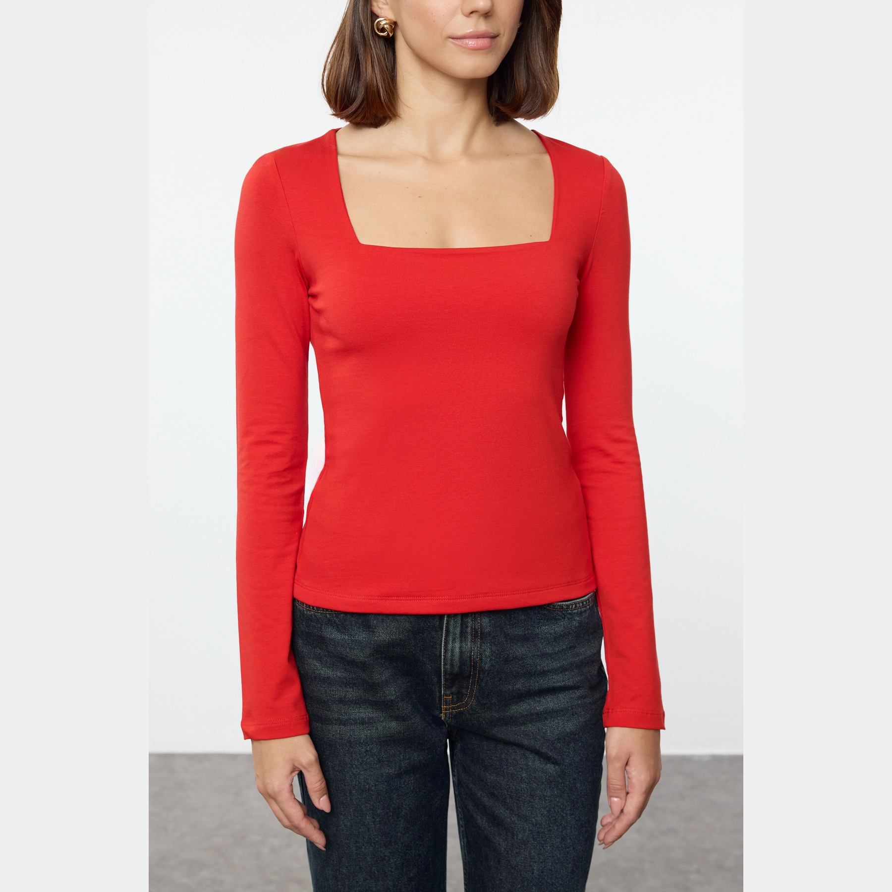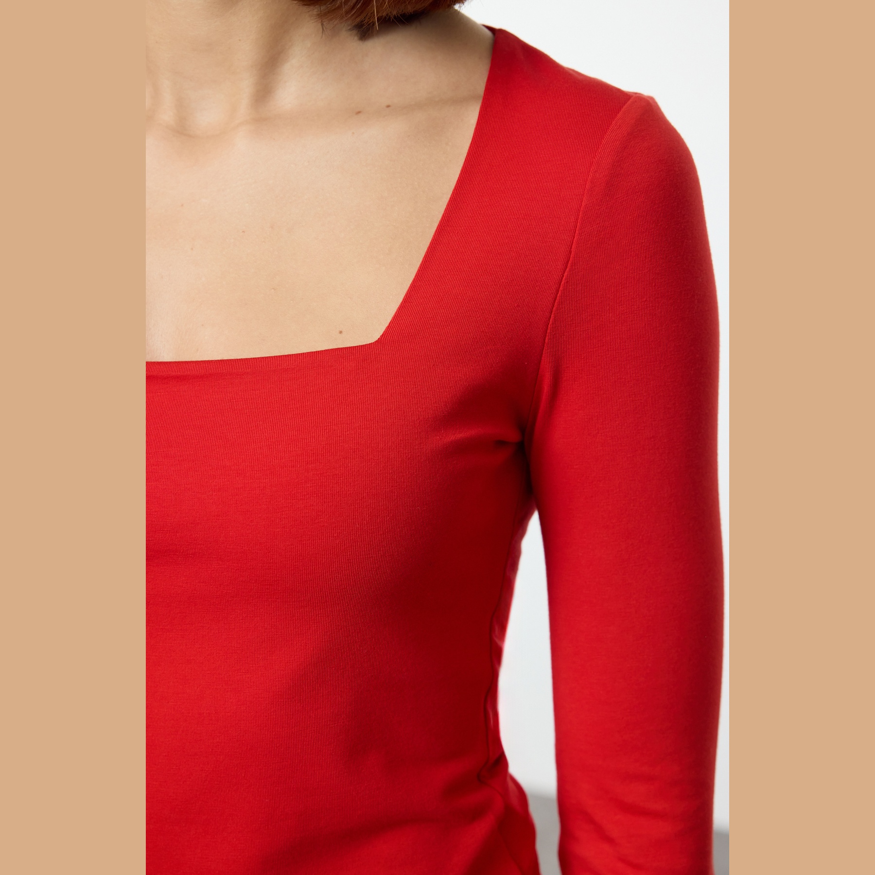 بلوزة نسائية بلون أحمر، مصنوعة من خامة محاكة مرنة بتركيبة قطنية مريحة، تمنح ملمسًا ناعمًا ومرونة مثالية على الجسم. تأتي بقصة منتظمة وياقة مربعة وأكمام طويلة، وتناسب الاستخدام اليومي كقطعة أساسية أنيقة وسهلة التنسيق.