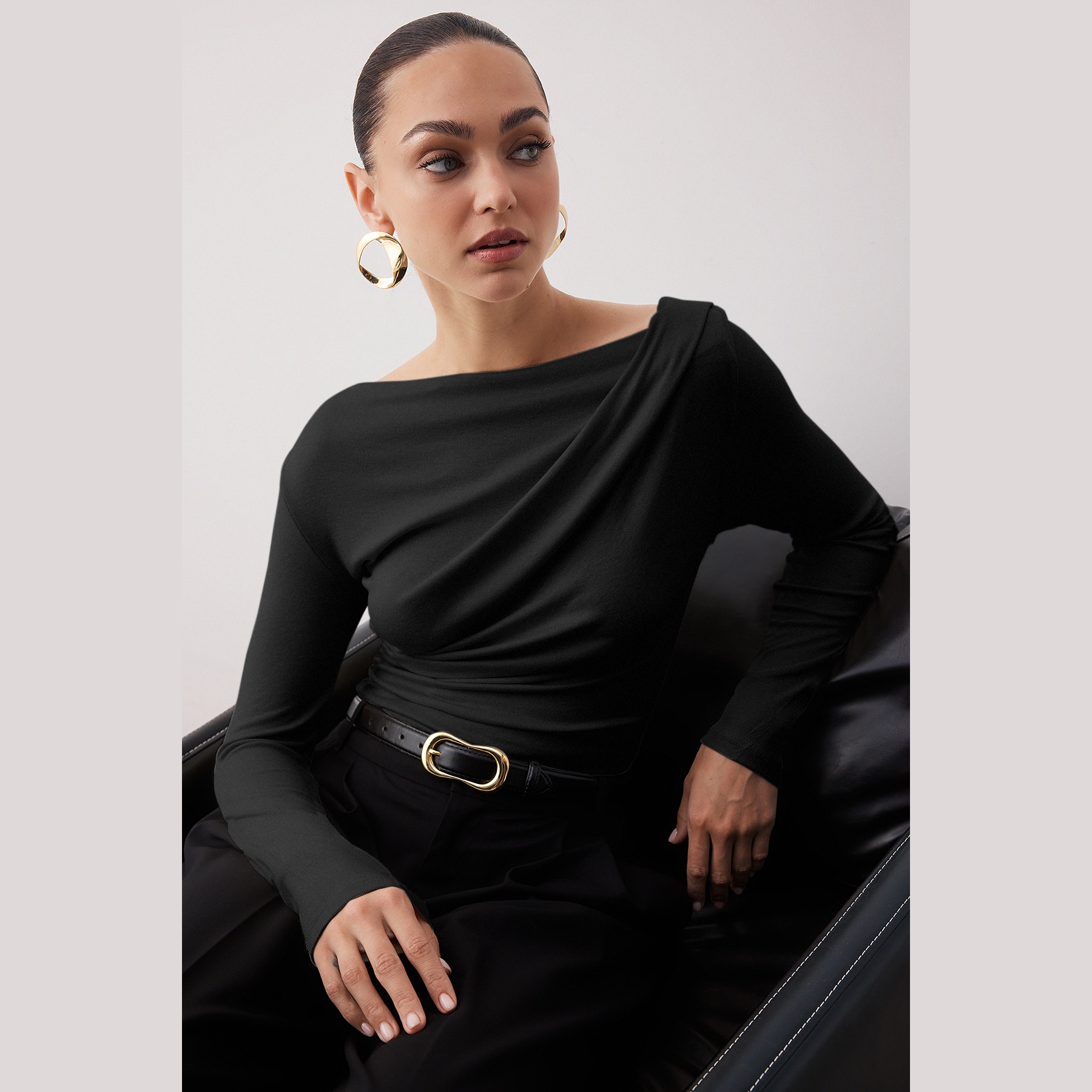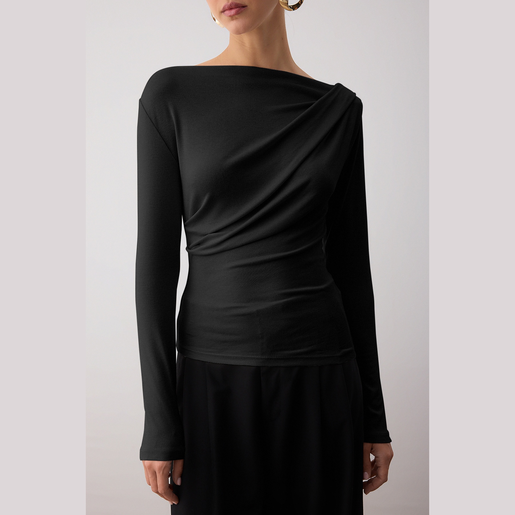 بلوزة نسائية – أسود بياقة غير متماثلة وتفاصيل بُزُوغ (إطلالة أنثوية ناعمة بخامة مرنة)