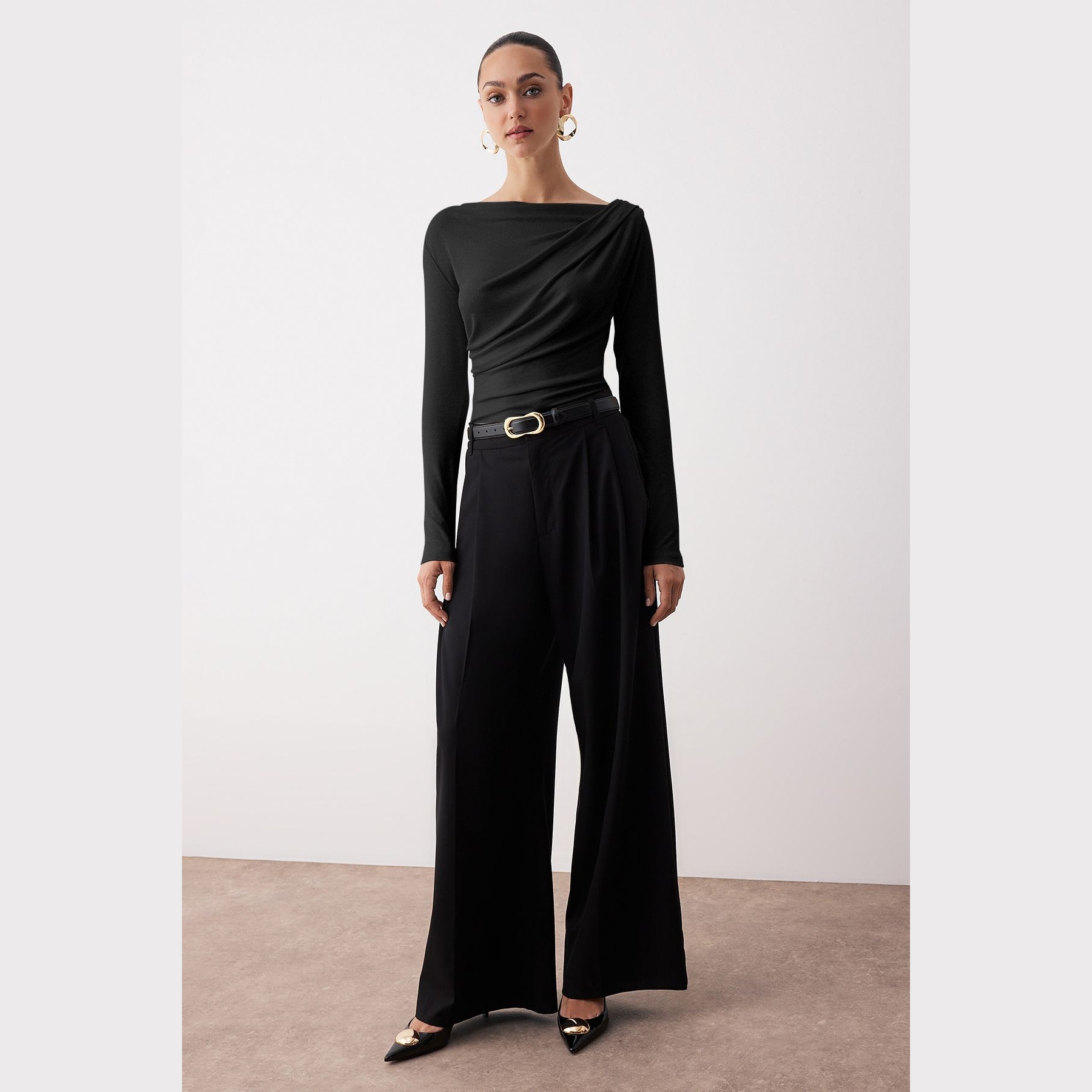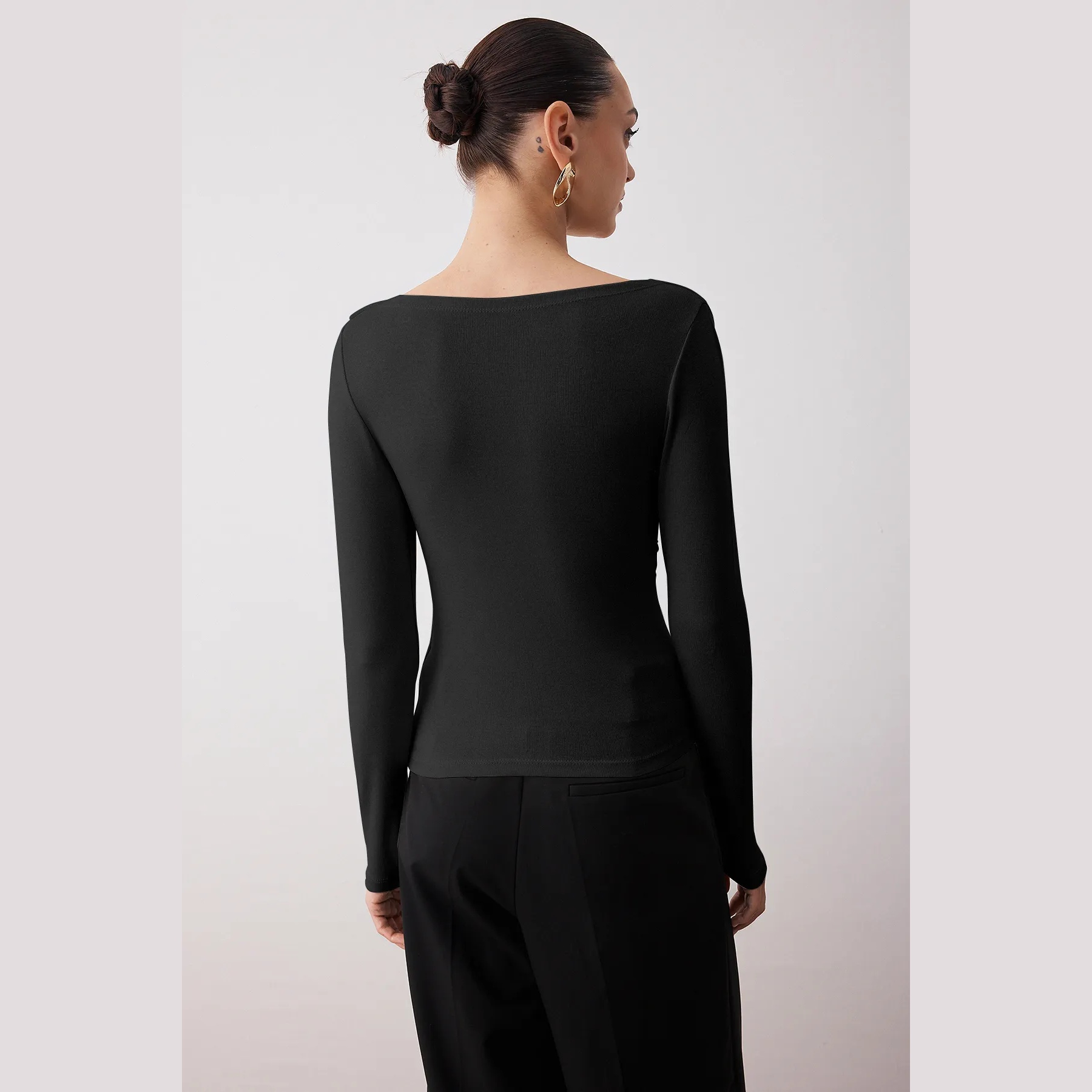 بلوزة نسائية بلون أسود، مصنوعة من خامة محاكة ناعمة ومرنة بتركيبة فيسكوز وإيلاستان، تمنح راحة مثالية وملمسًا لطيفًا على البشرة. تأتي بقصة ضيقة وياقة غير متماثلة وأكمام طويلة، وتتميز بتفاصيل بُزُوغ/دِرَابِيه تضيف لمسة أنثوية أنيقة على الإطلالة.
