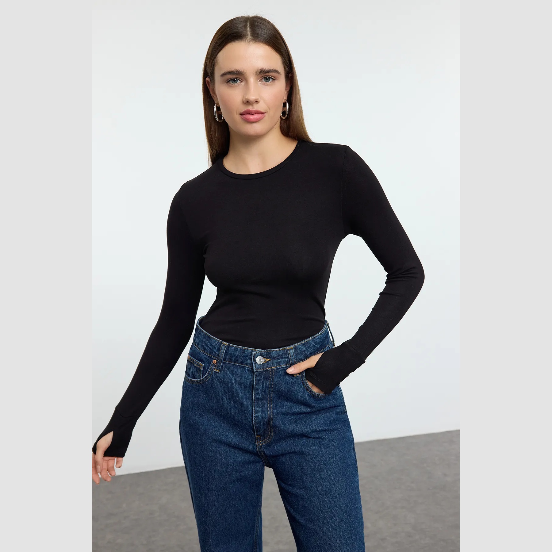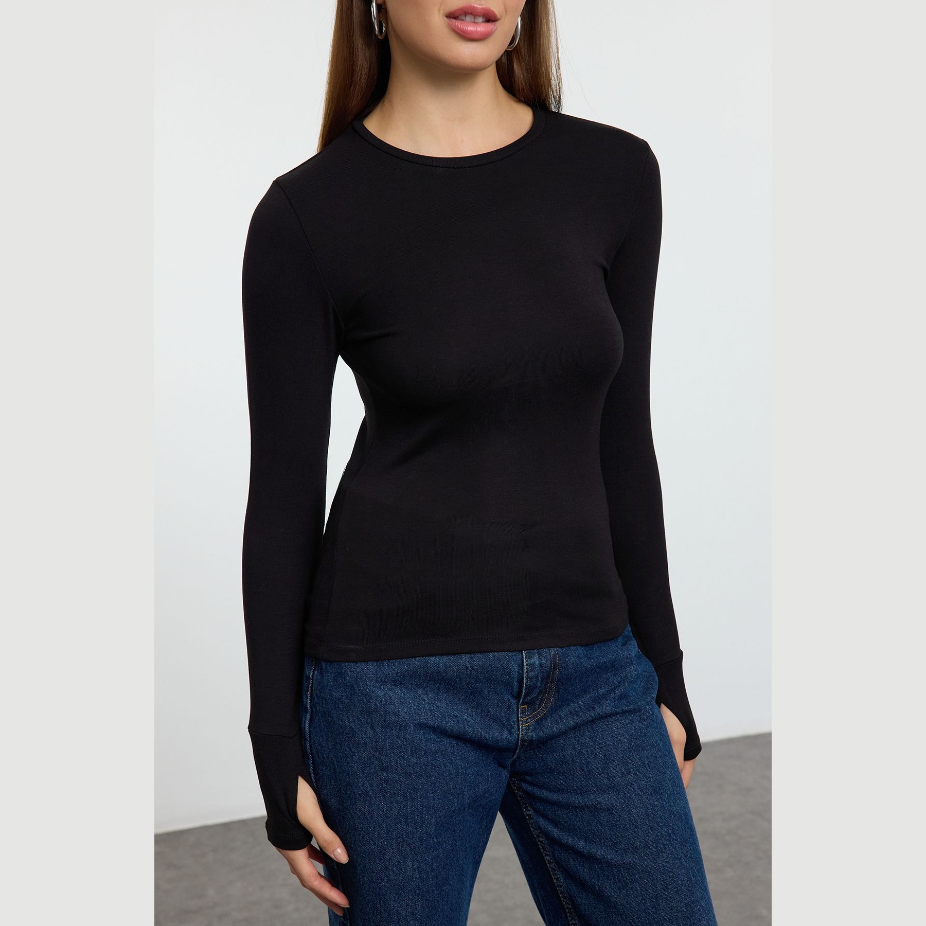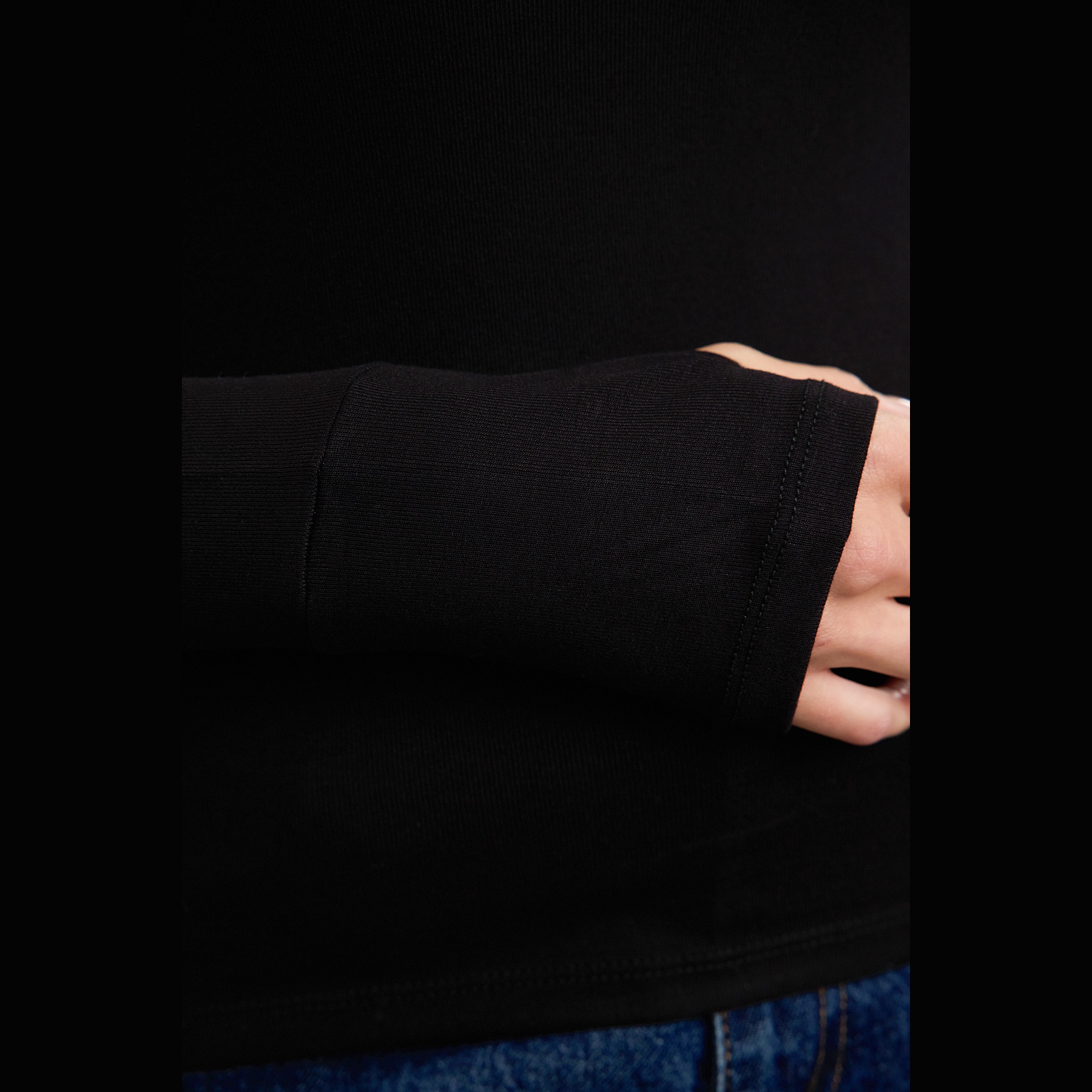بلوزة نسائية بلون أسود، مصنوعة من خامة محاكة ناعمة ومرنة بتركيبة فيسكوز وإيلاستان، تمنح راحة مثالية وملمسًا لطيفًا على البشرة. تأتي بقصة ضيقة وياقة دائرية وأكمام طويلة، وتتميز بتفصيل تمرير الأصابع في نهاية الأكمام، مما يمنح مظهرًا عصريًا عمليًا مثاليًا للإطلالات اليومية.