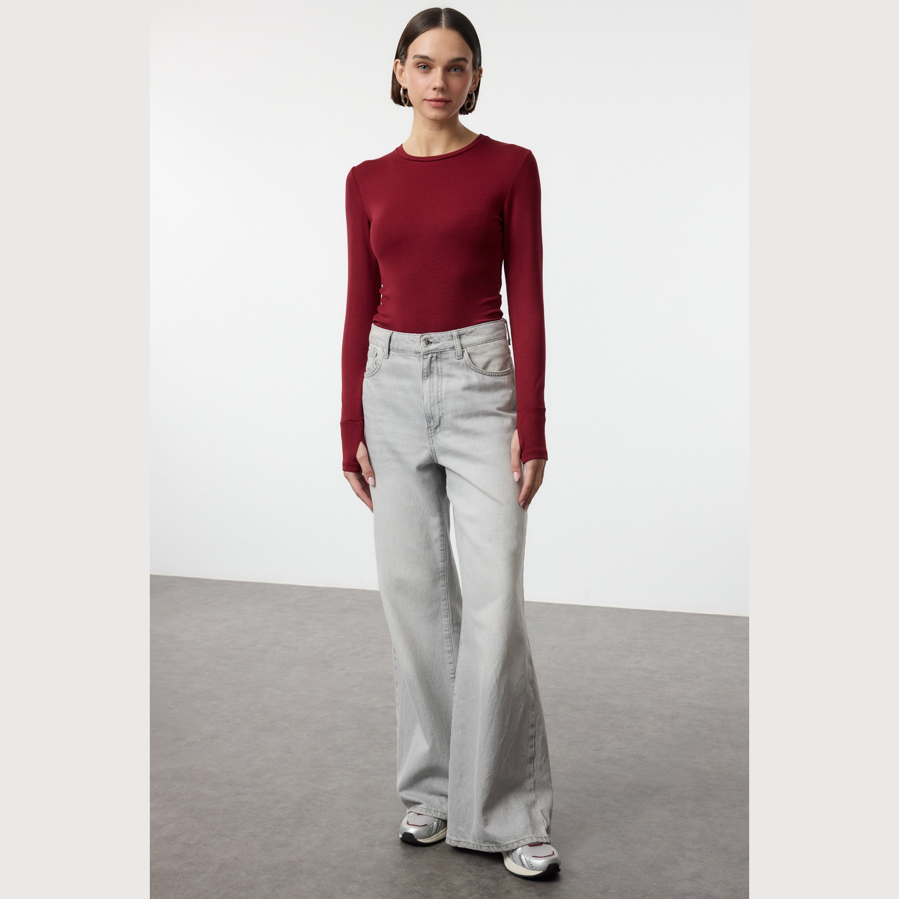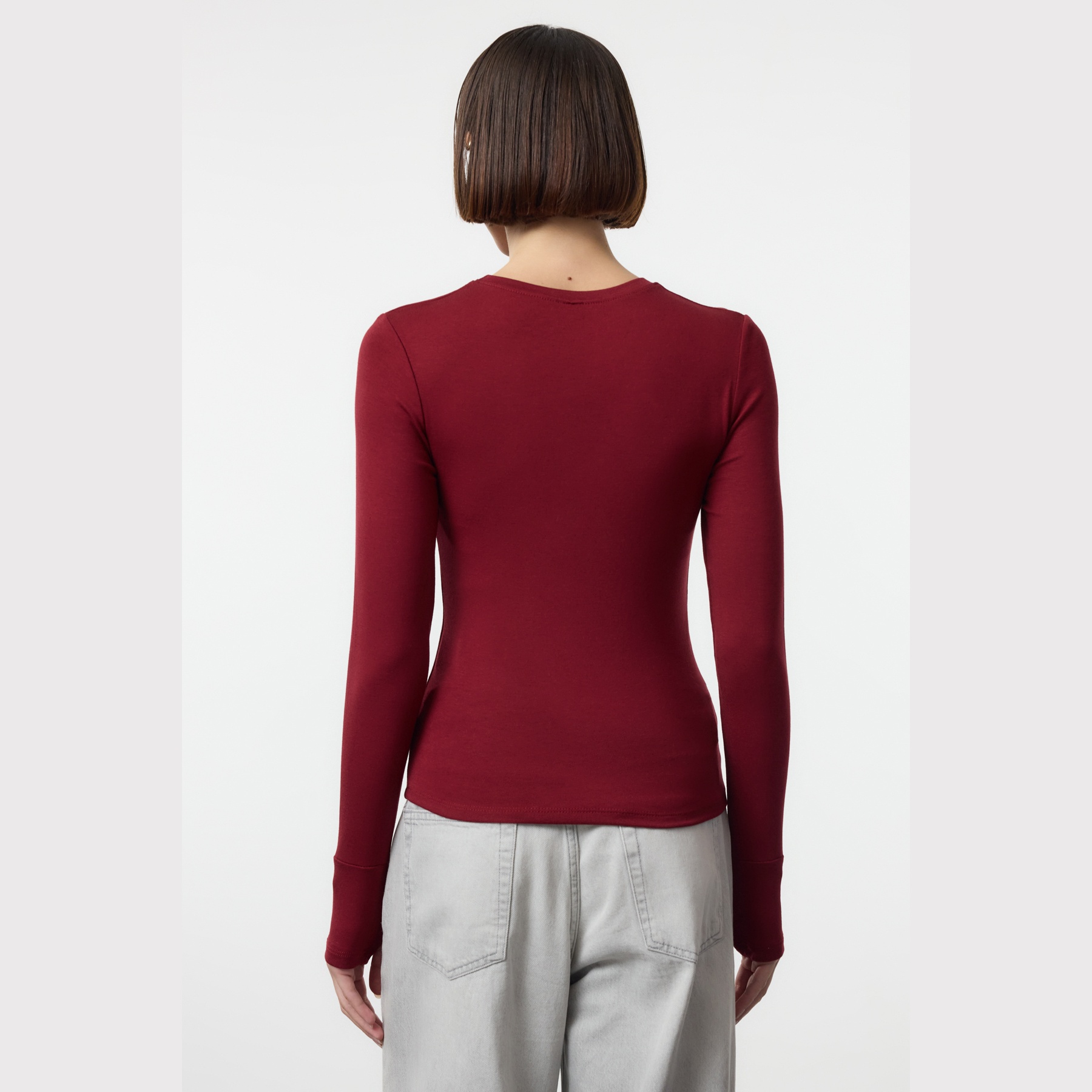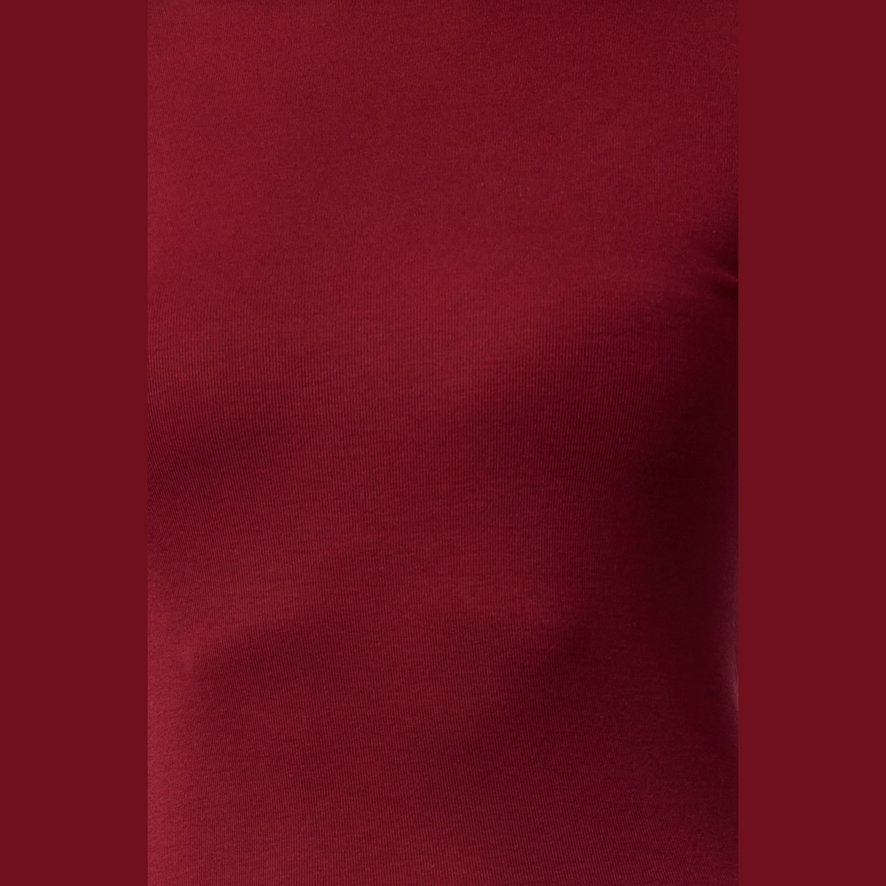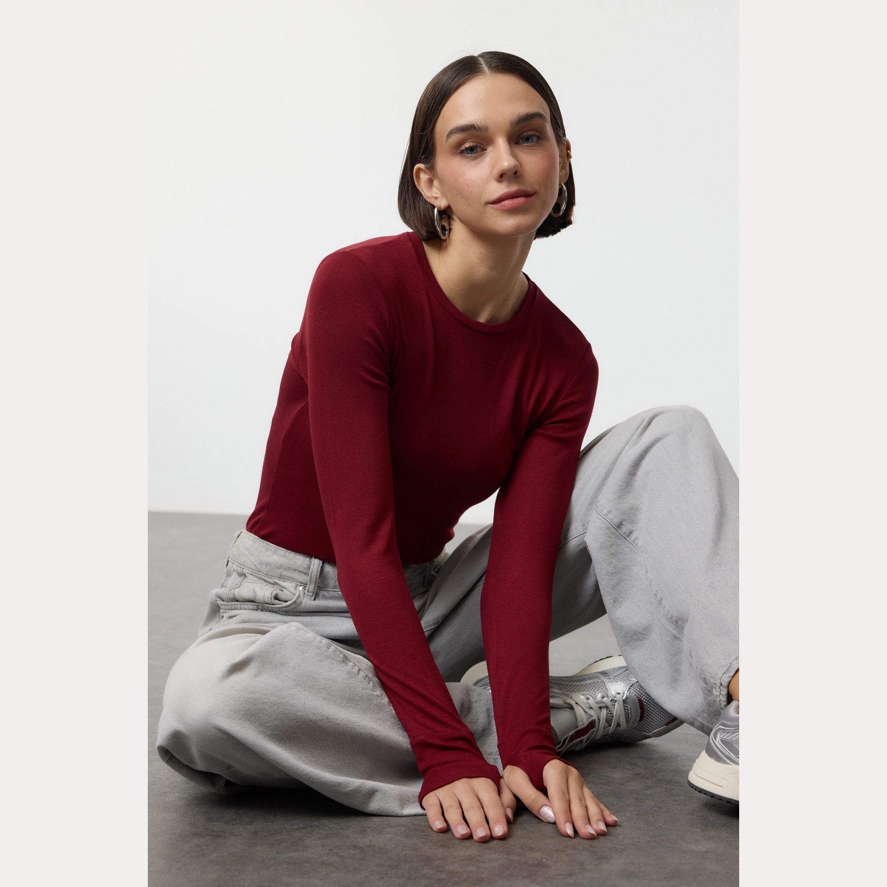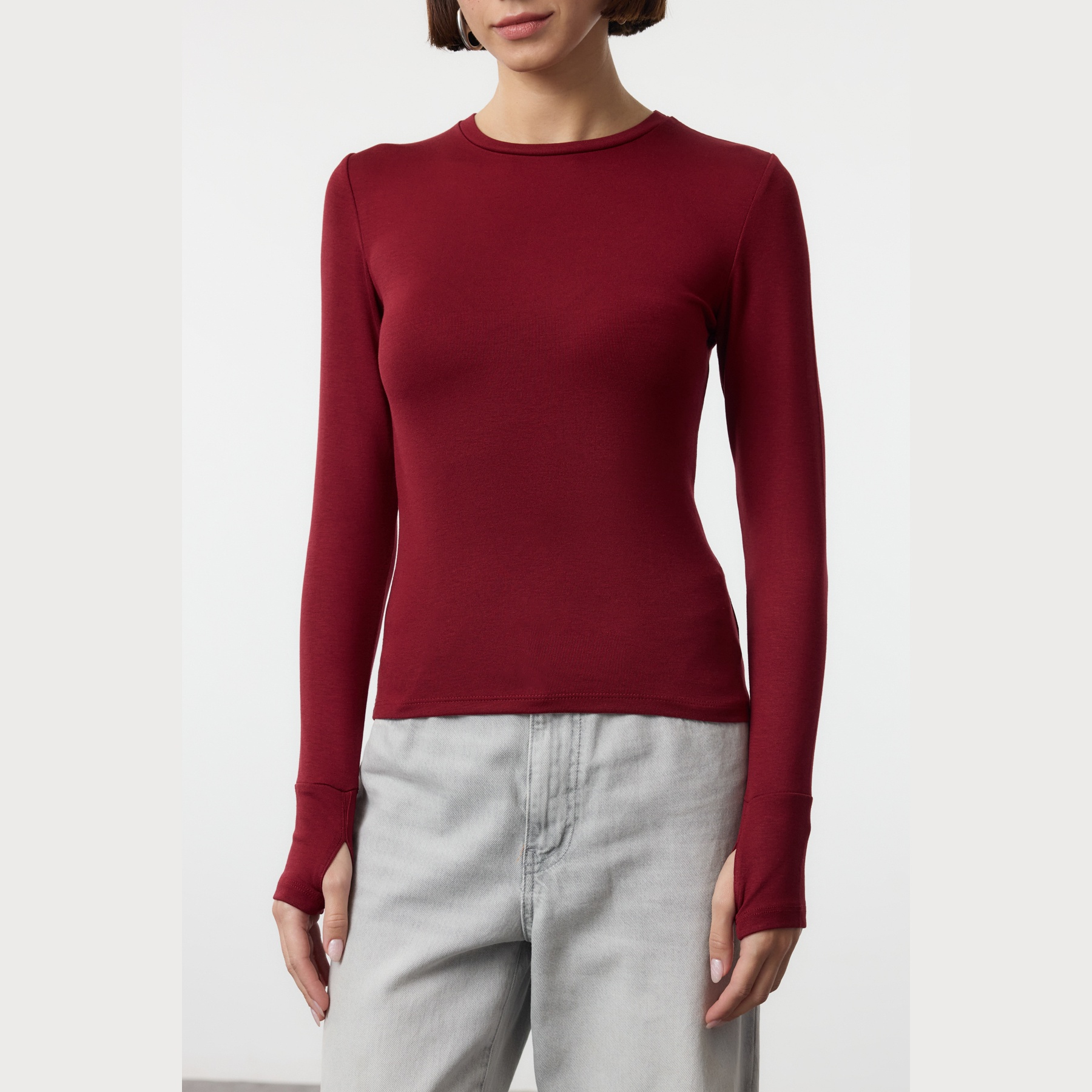 بلوزة نسائية بلون بوردو، مصنوعة من خامة محاكة ناعمة ومرنة بتركيبة فيسكوز وإيلاستان، تمنح راحة مثالية وملمسًا لطيفًا على البشرة. تأتي بقصة ضيقة وياقة دائرية وأكمام طويلة، وتتميز بتفصيل تمرير الأصابع في نهاية الأكمام، مما يمنح مظهرًا عصريًا عمليًا مثاليًا للإطلالات اليومية.