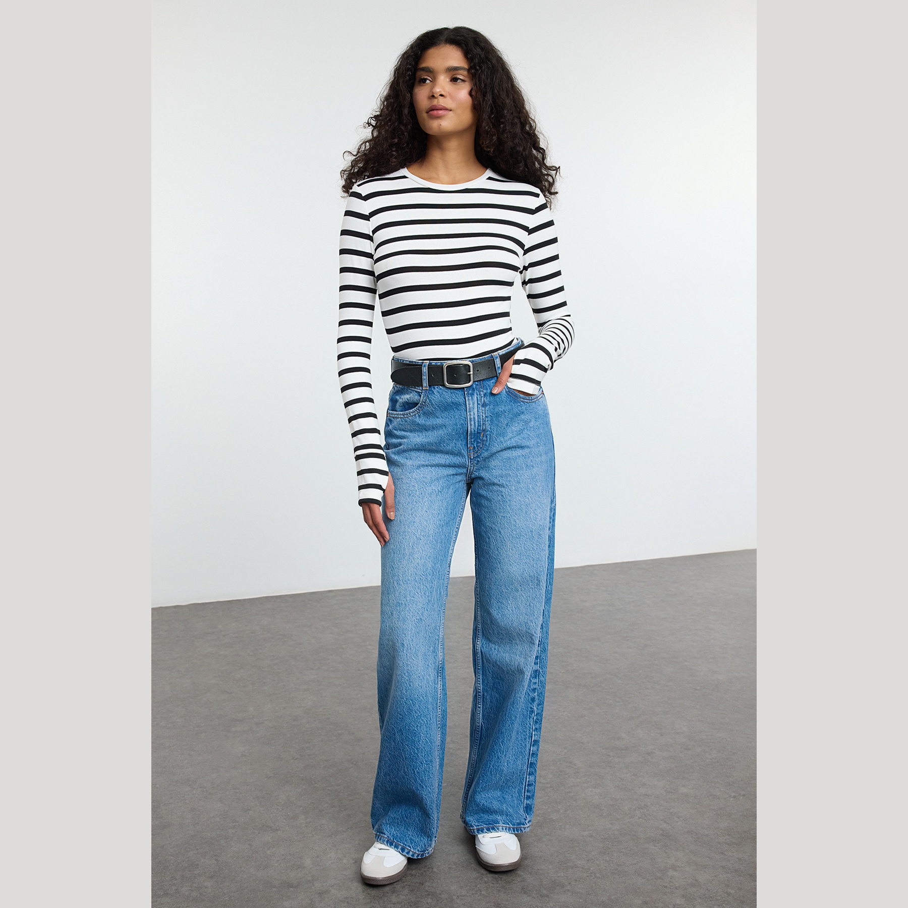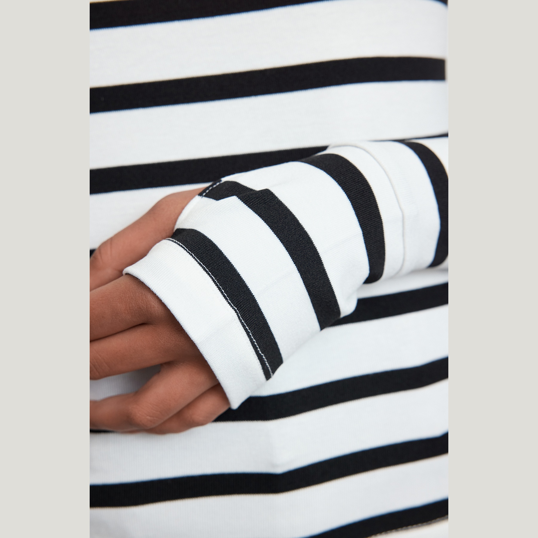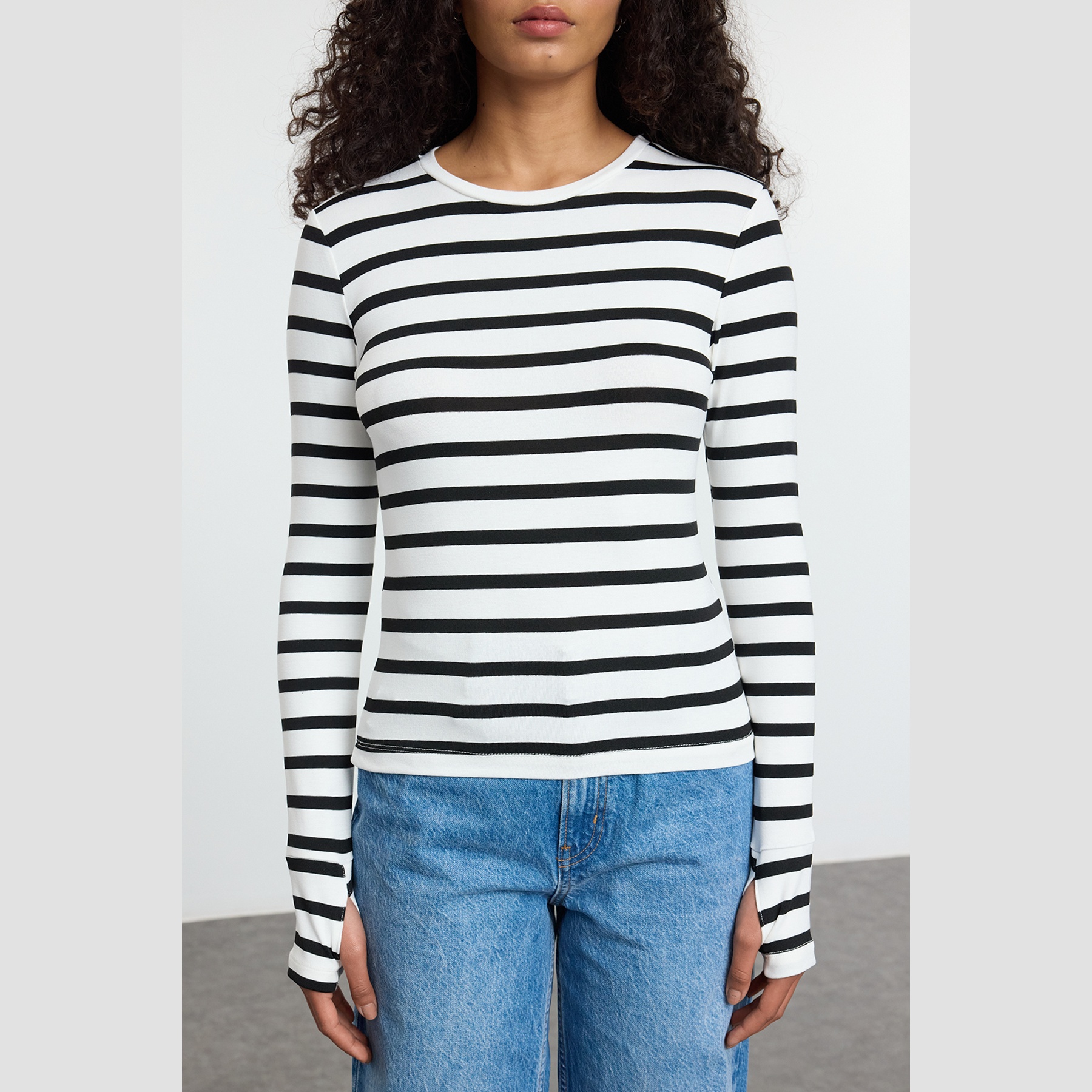 بلوزة نسائية بنمط مخطط يجمع بين الأسود والإكرو، مصنوعة من خامة محاكة ناعمة ومرنة بتركيبة فيسكوز وإيلاستان، تمنح راحة مثالية وملمسًا لطيفًا على البشرة. تأتي بقصة ضيقة وياقة دائرية وأكمام طويلة، وتتميز بتفصيل تمرير الأصابع في نهاية الأكمام، مما يمنح مظهرًا عصريًا عمليًا مثاليًا للإطلالات اليومية.