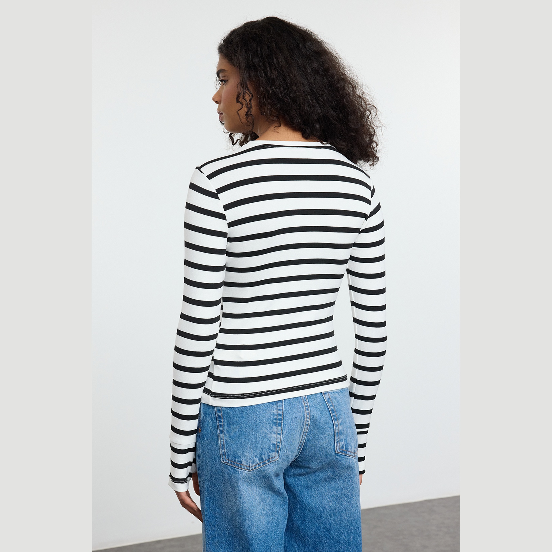 بلوزة نسائية – مخططة أسود/إكرو بتفصيل تمرير الأصابع وخامة ناعمة (إطلالة عملية أنيقة بخامة مرنة)