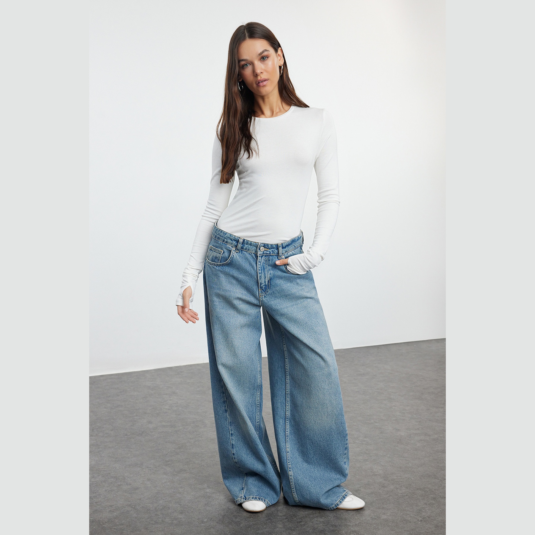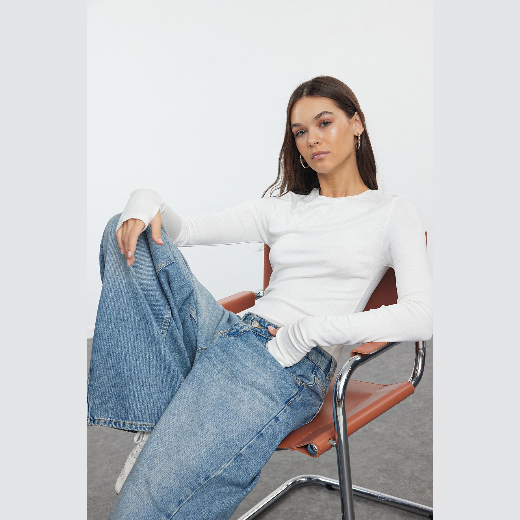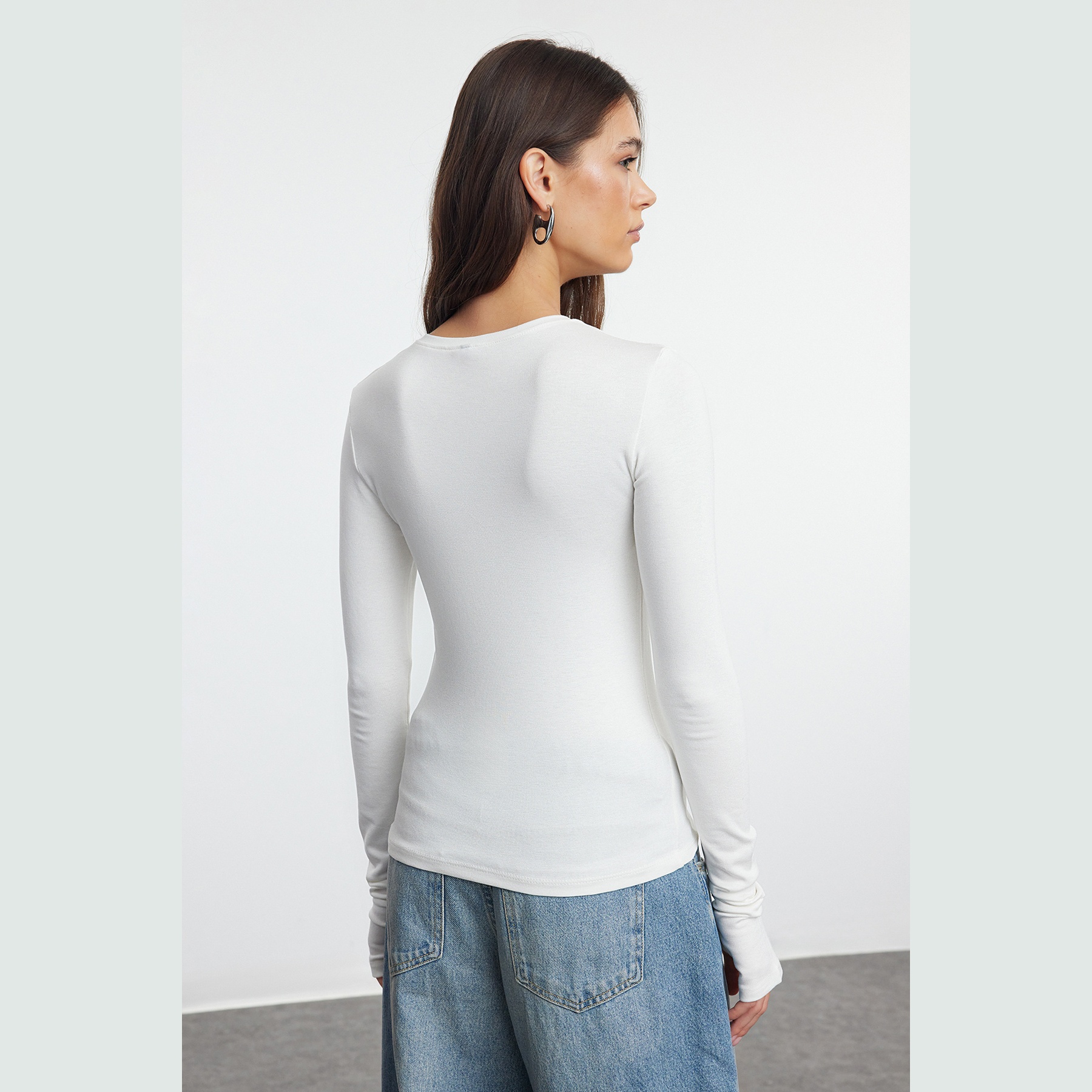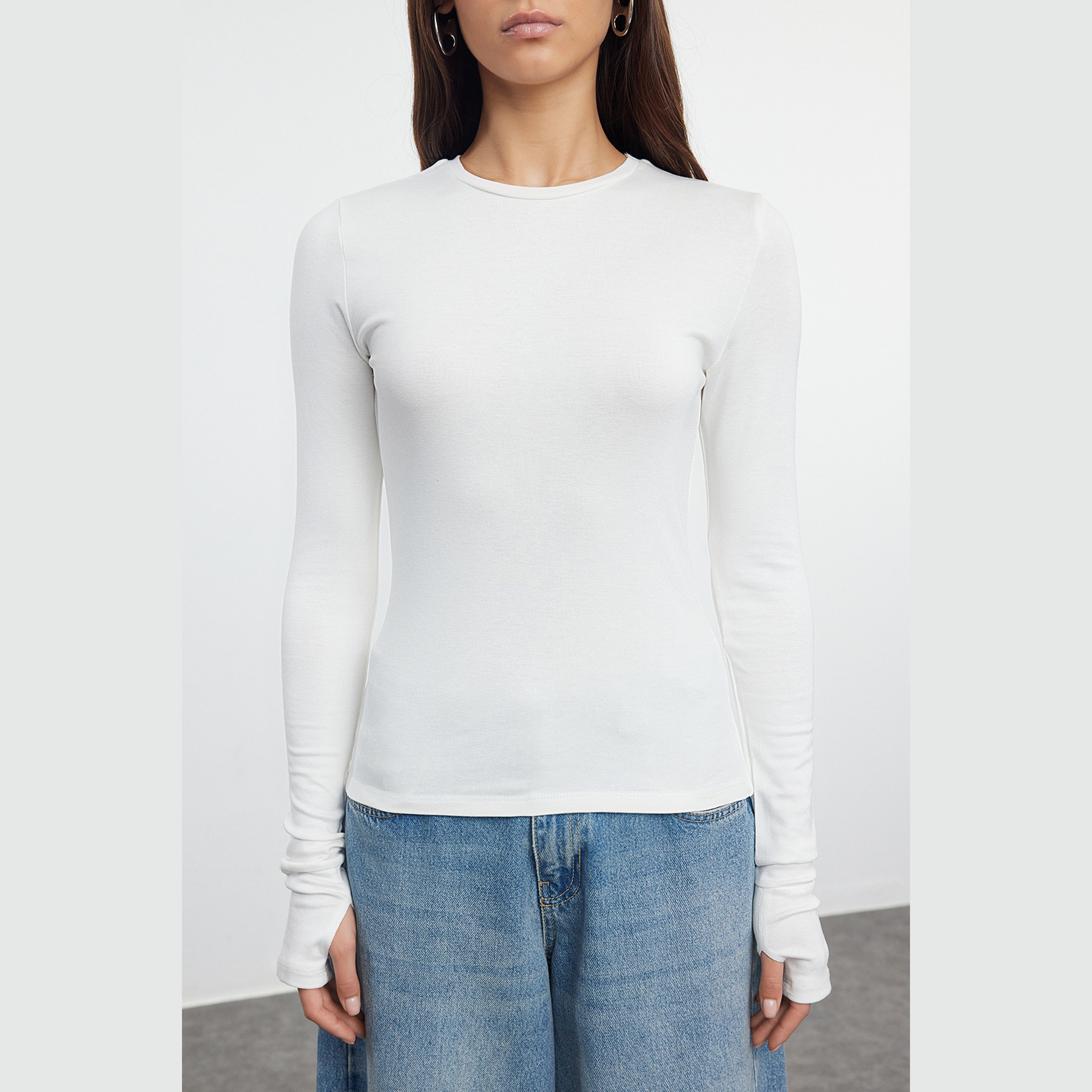 بلوزة نسائية بلون إكرو، مصنوعة من خامة محاكة ناعمة ومرنة بتركيبة فيسكوز وإيلاستان، تمنح راحة مثالية وملمسًا لطيفًا على البشرة. تأتي بقصة ضيقة وياقة دائرية وأكمام طويلة، وتتميز بتفصيل تمرير الأصابع في نهاية الأكمام، مما يمنح مظهرًا عصريًا عمليًا مثاليًا للإطلالات اليومية.