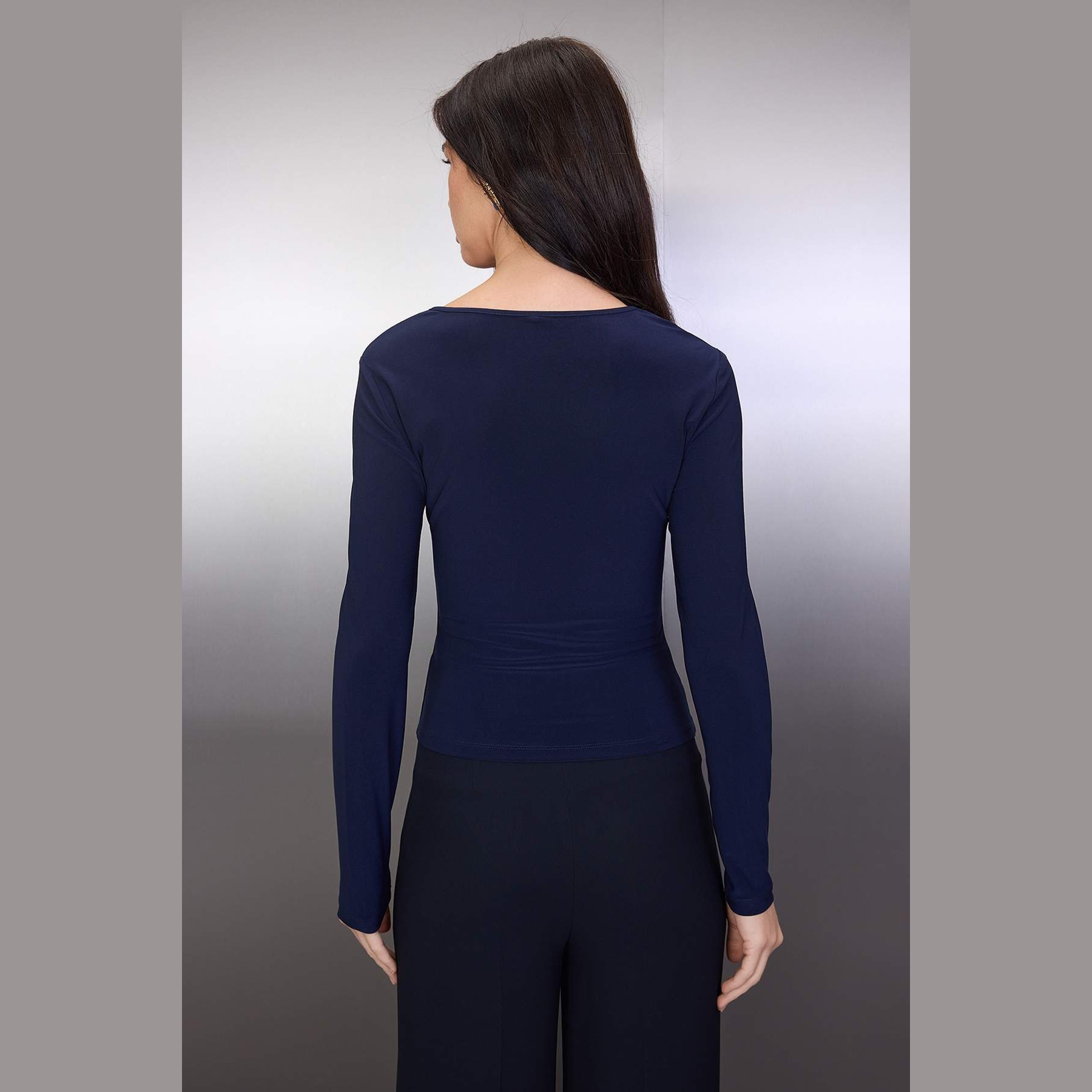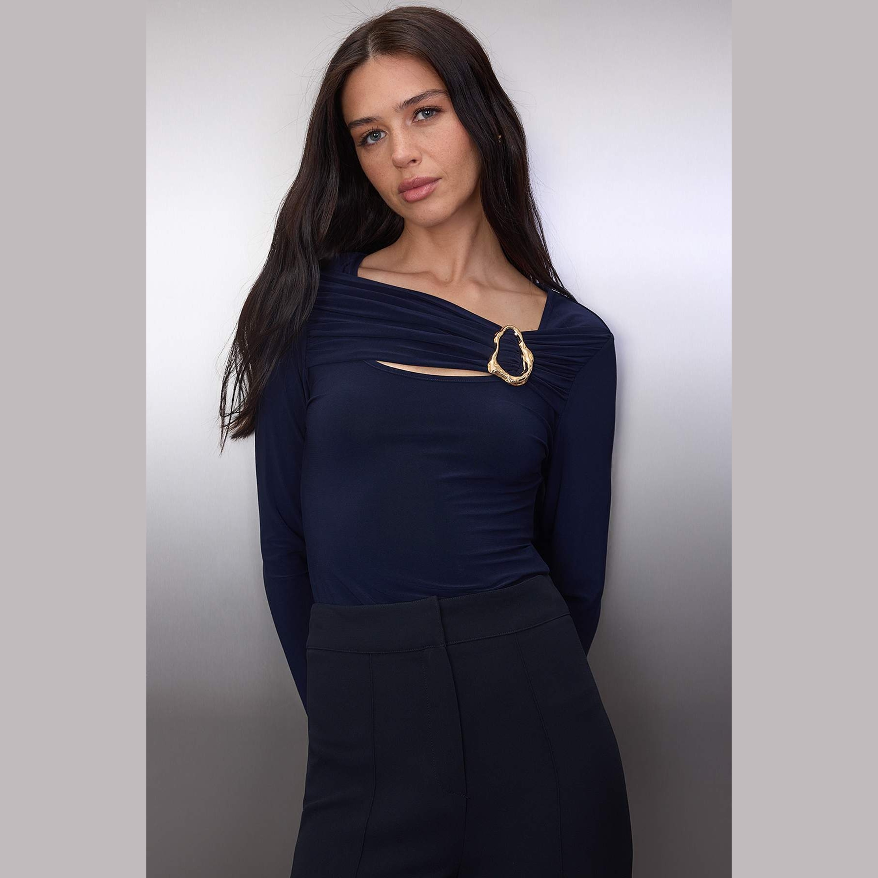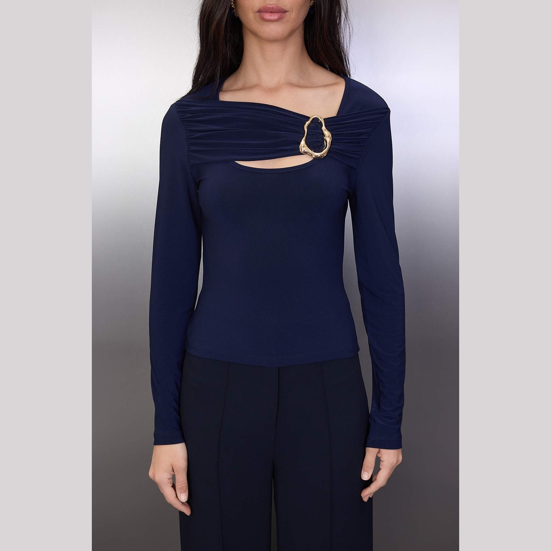 بلوزة نسائية – كحلي بتفصيل Cut-Out وإكسسوار معدني (إطلالة عصرية جريئة بخامة مرنة)