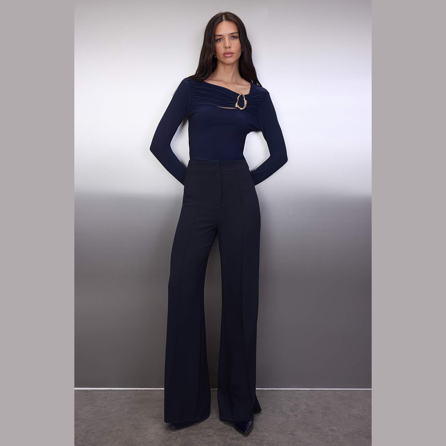 بلوزة نسائية بلون كحلي، مصنوعة من خامة محاكة مرنة بتركيبة بوليستر وإيلاستان، تمنح راحة مثالية وملمسًا ناعمًا على البشرة. تأتي بقصة ضيقة وياقة دائرية وأكمام طويلة، وتبرز بتفصيل Cut-Out عند الصدر مزين بإكسسوار معدني أنيق، يمنح مظهرًا عصريًا جريئًا مثاليًا للسهرات أو الإطلالات المسائية.
