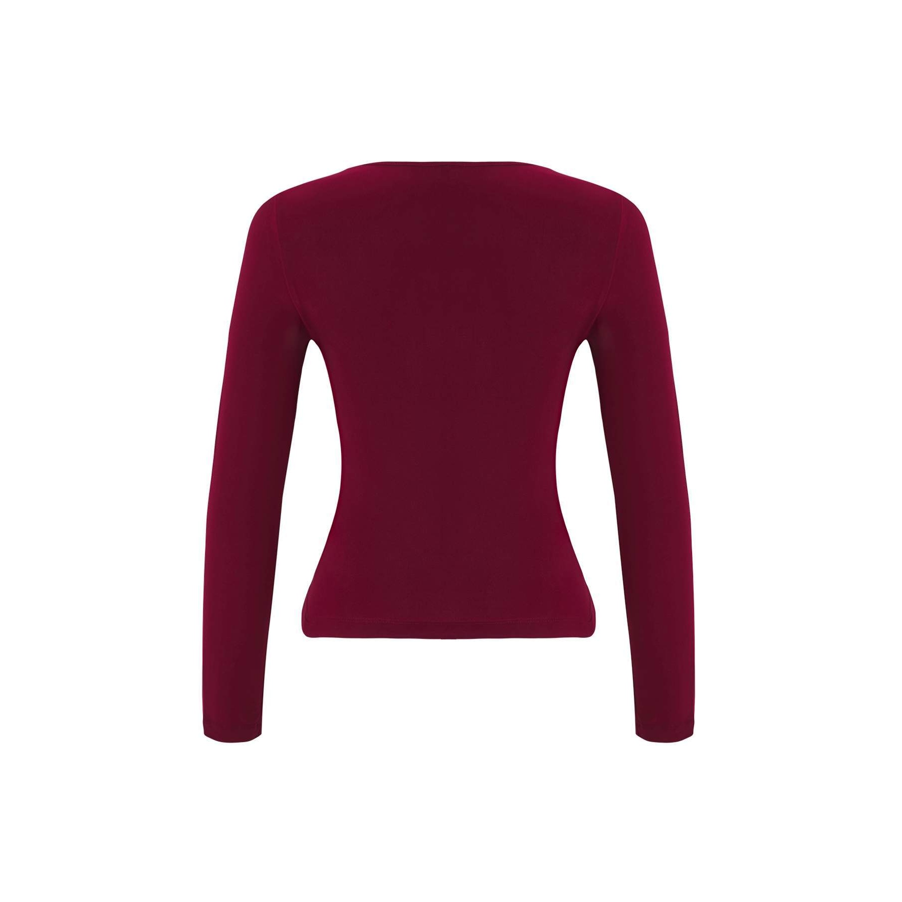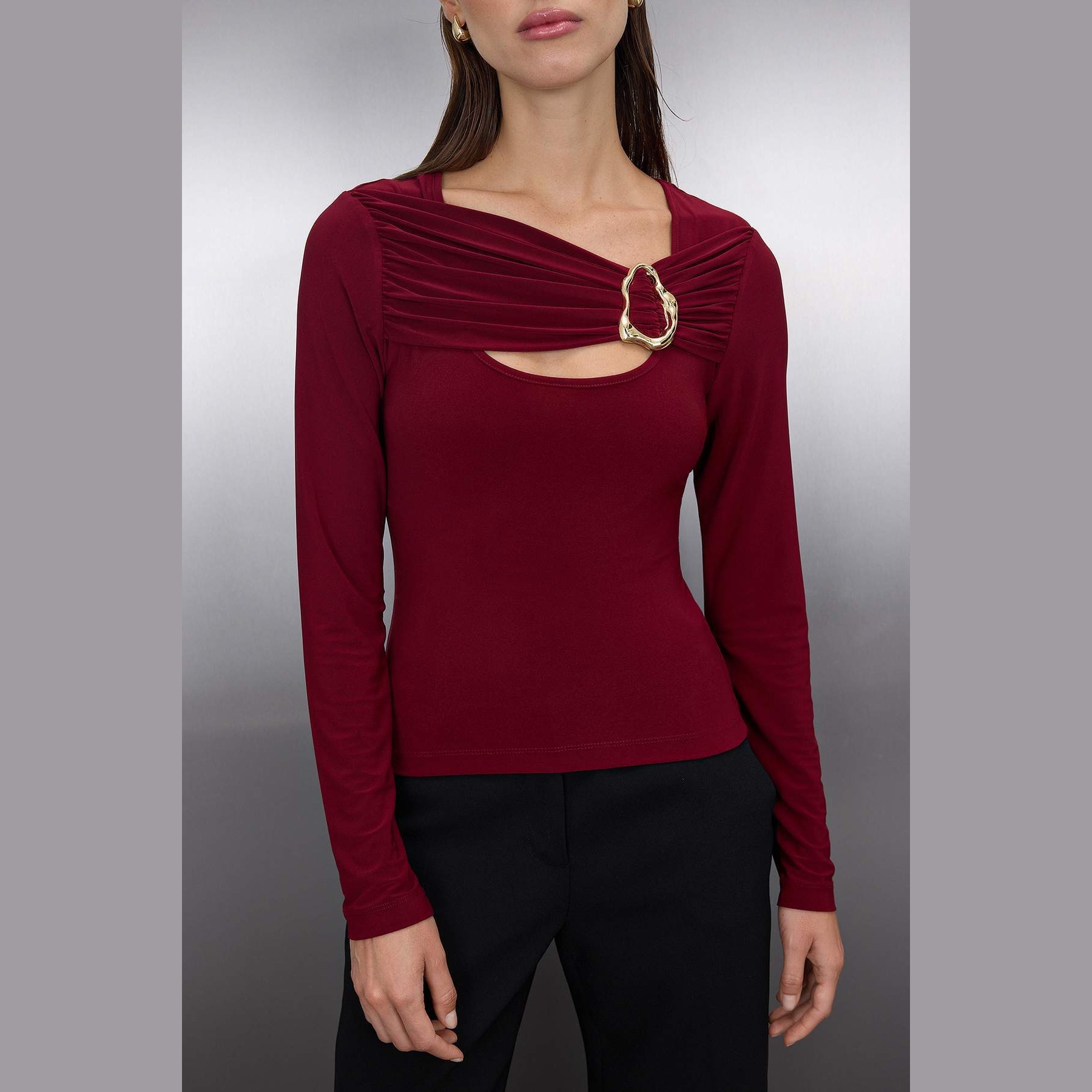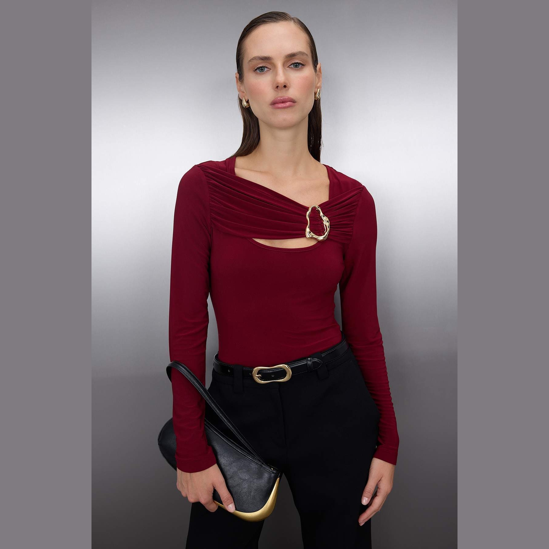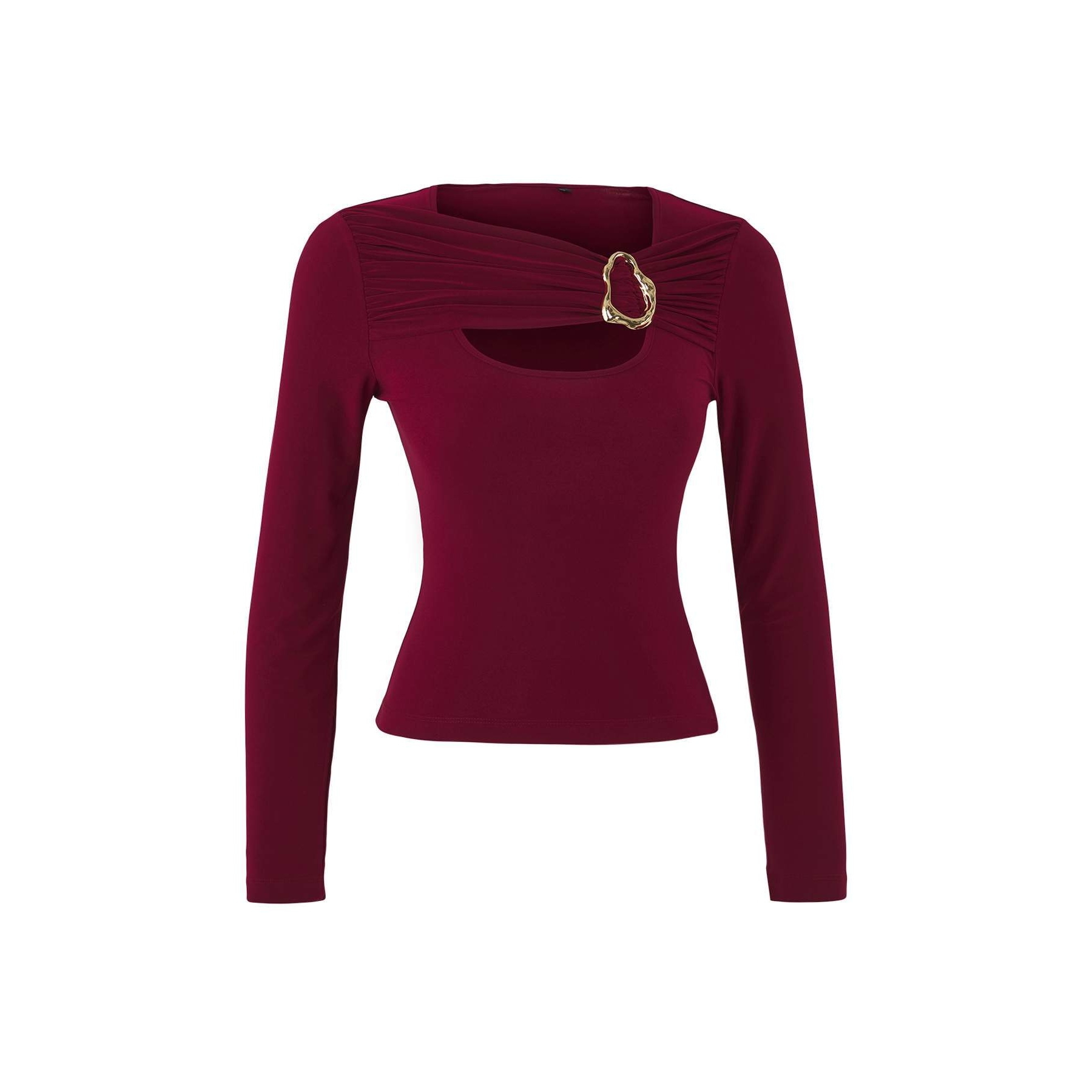 بلوزة نسائية – بوردو بتفصيل Cut-Out وإكسسوار معدني (إطلالة عصرية جريئة بخامة مرنة)