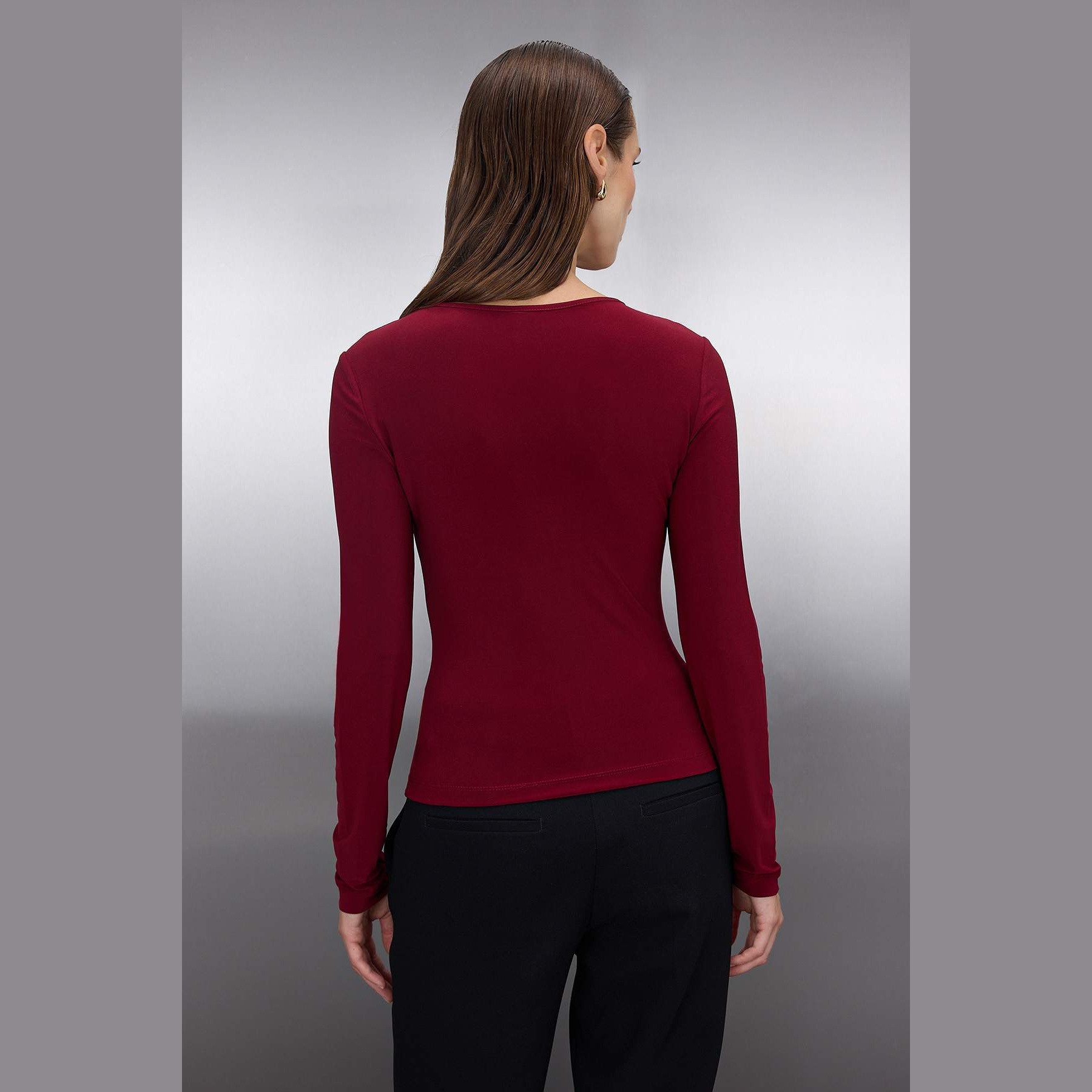 بلوزة نسائية بلون بوردو، مصنوعة من خامة محاكة مرنة بتركيبة بوليستر وإيلاستان، تمنح راحة مثالية وملمسًا ناعمًا على البشرة. تأتي بقصة ضيقة وياقة دائرية وأكمام طويلة، وتبرز بتفصيل Cut-Out عند الصدر مزين بإكسسوار معدني أنيق، يمنح مظهرًا عصريًا جريئًا مثاليًا للسهرات أو الإطلالات المسائية.