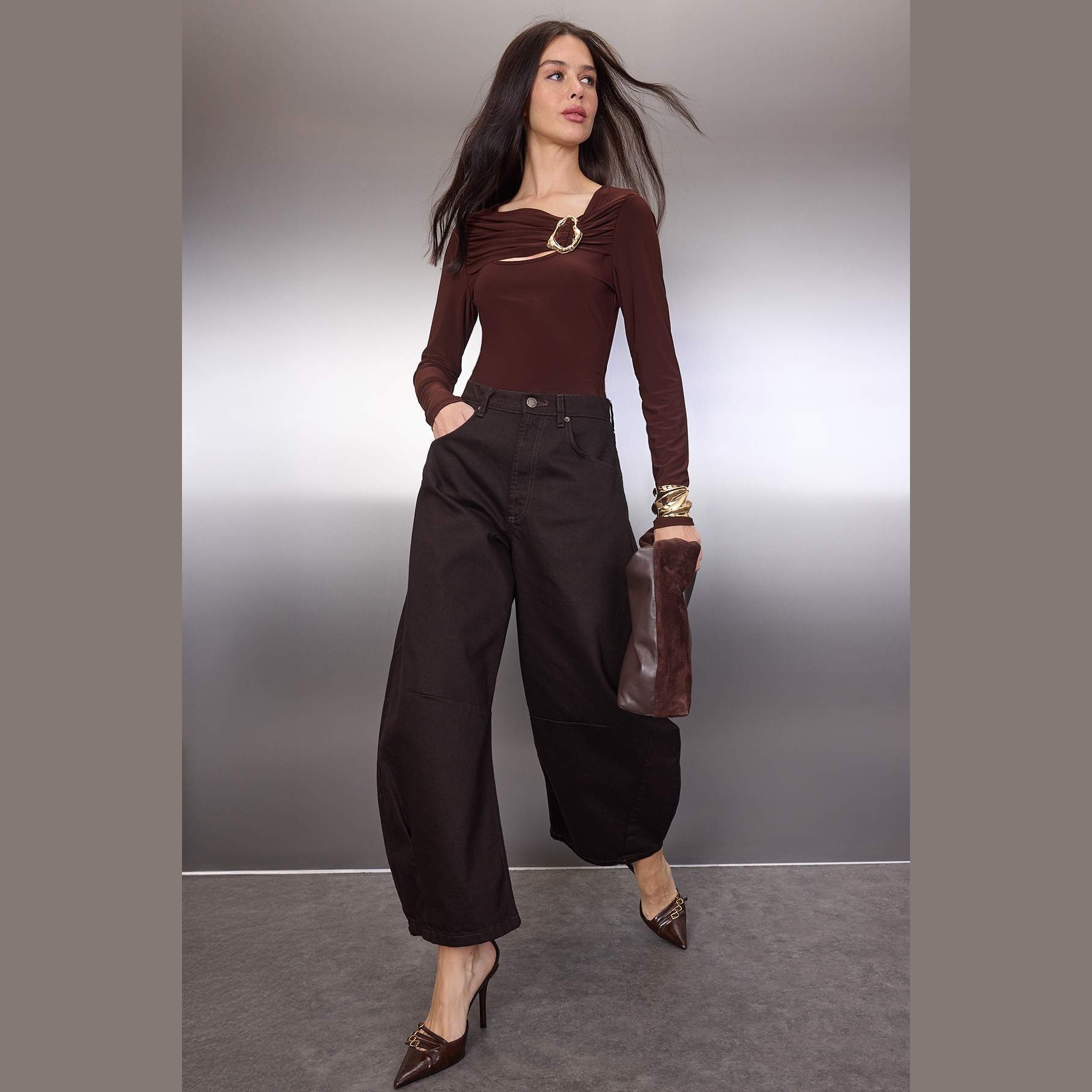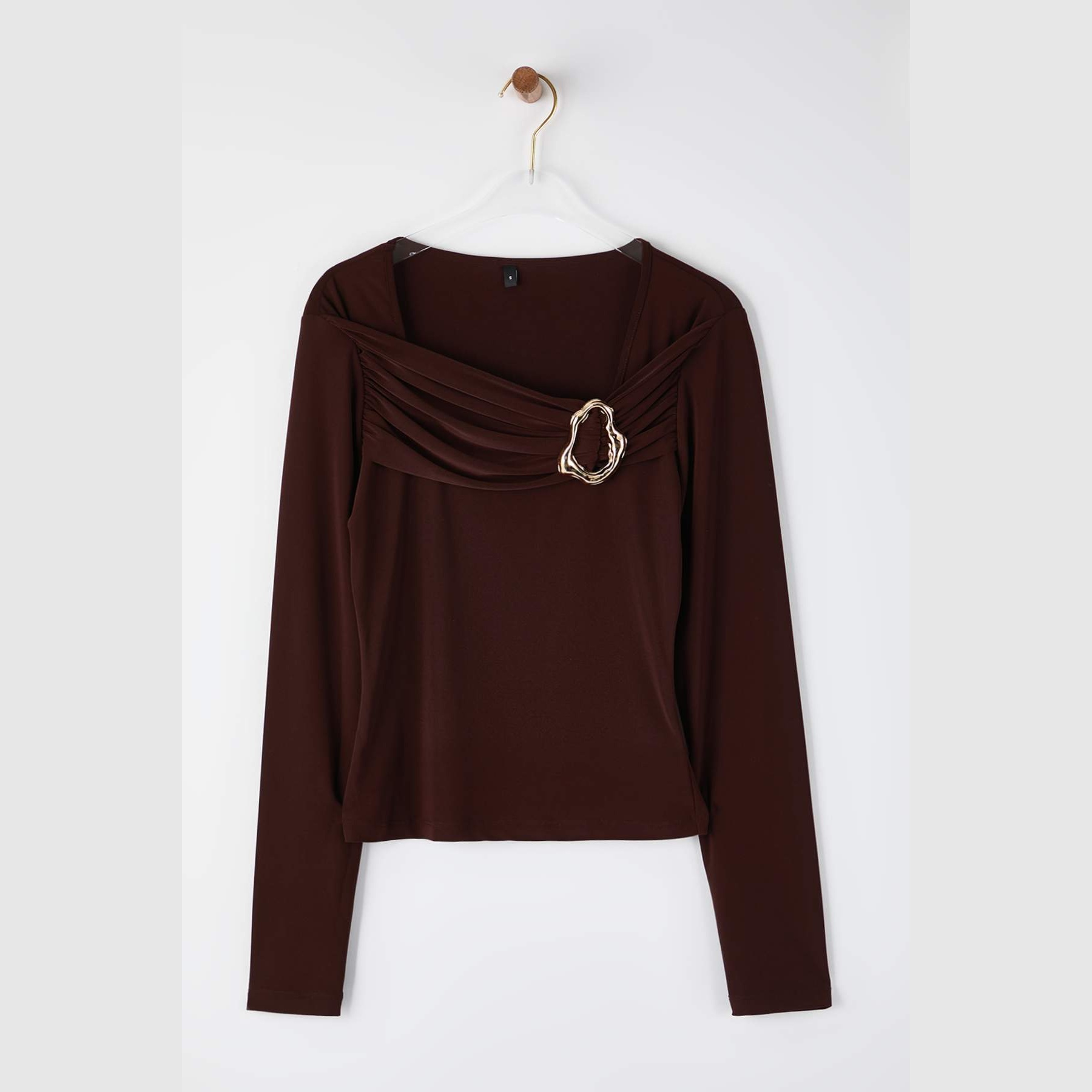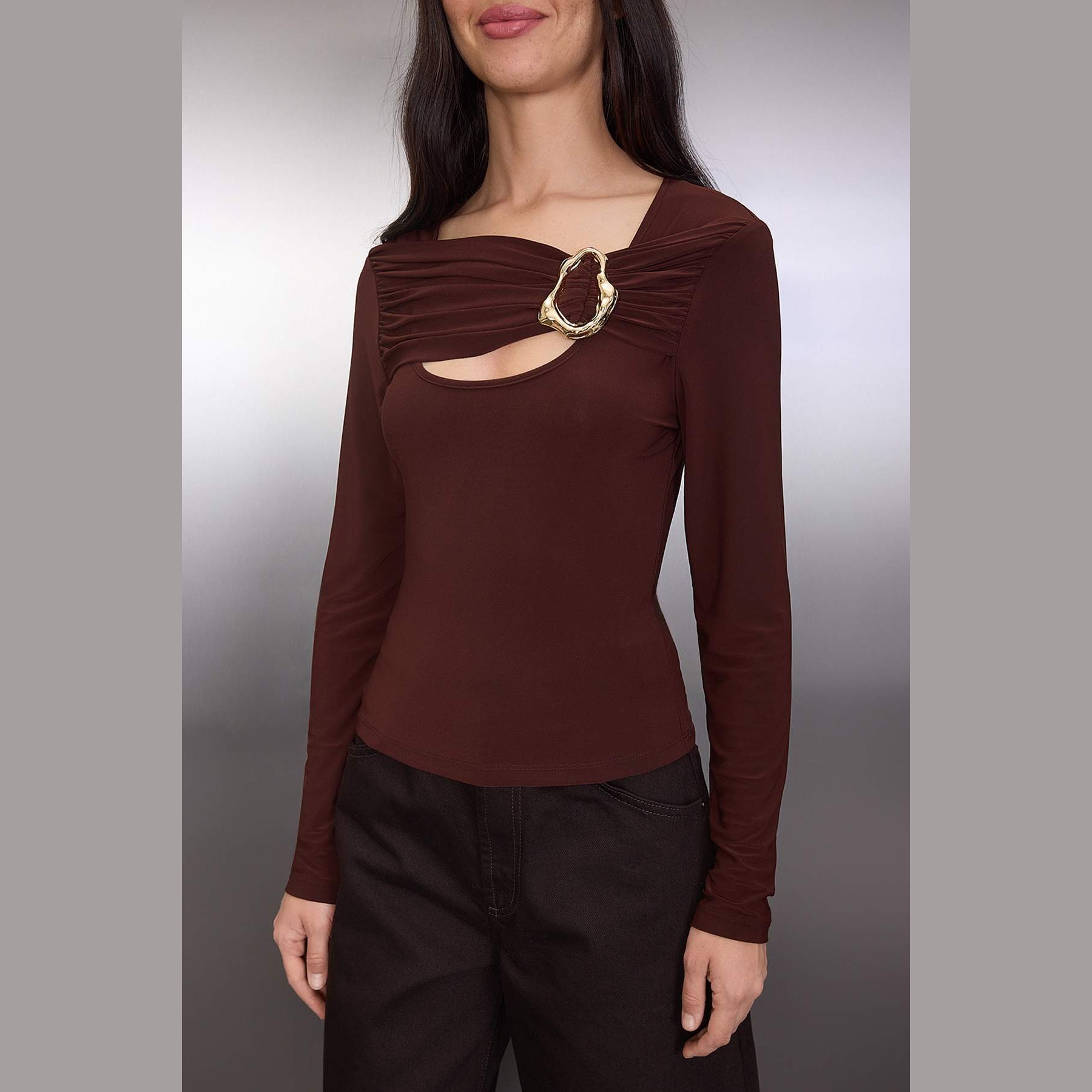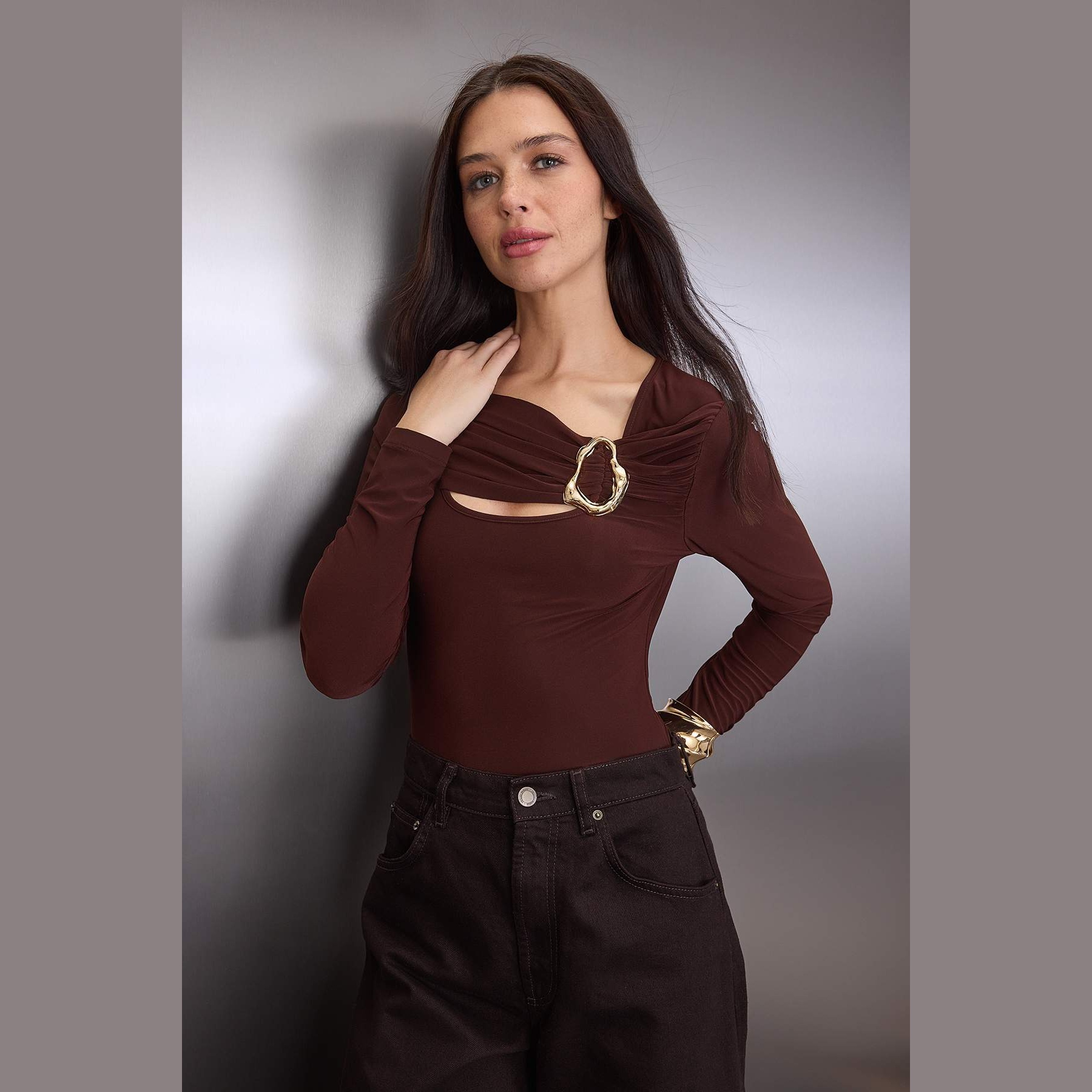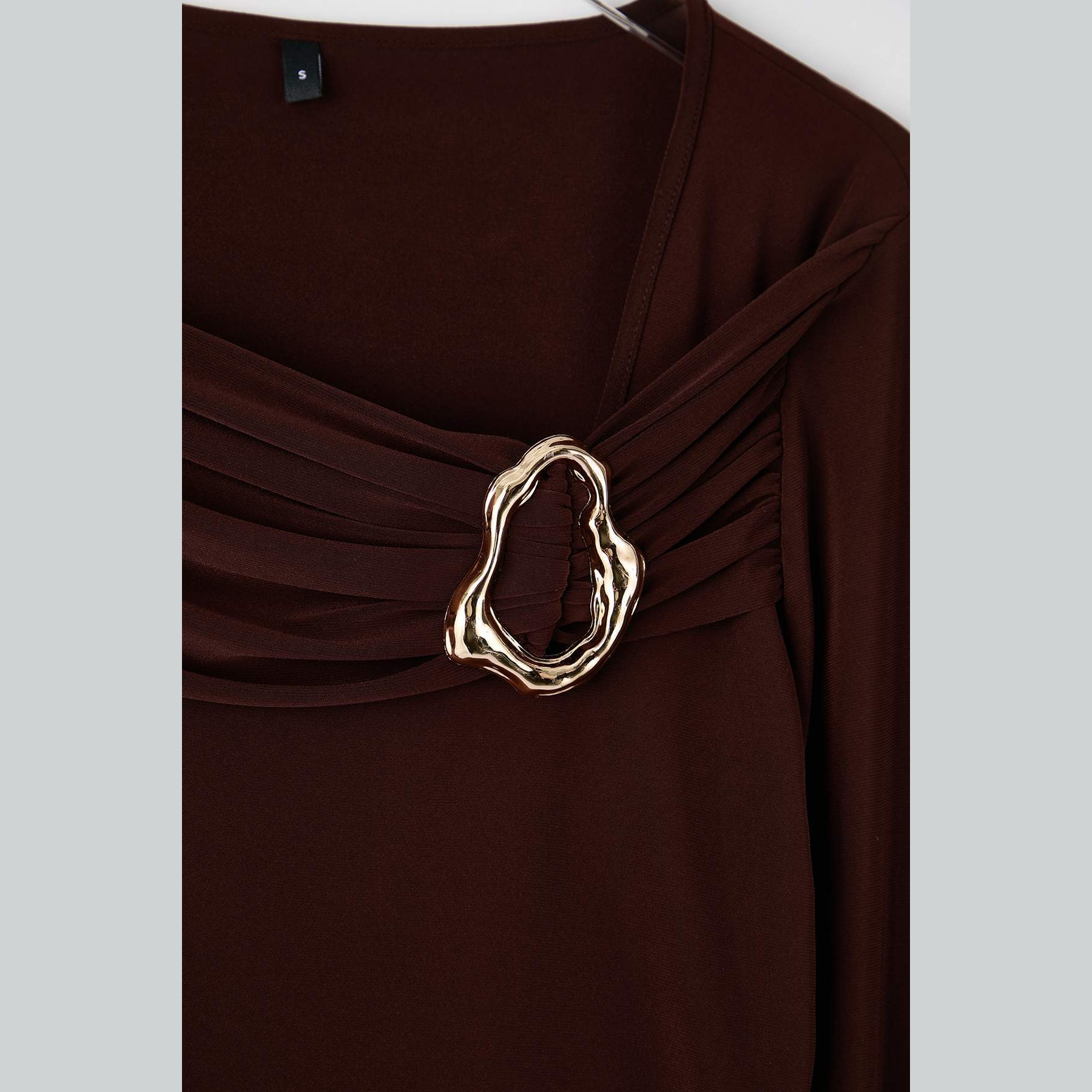 بلوزة نسائية – بني بتفصيل Cut-Out وإكسسوار معدني (إطلالة عصرية جريئة بخامة مرنة)