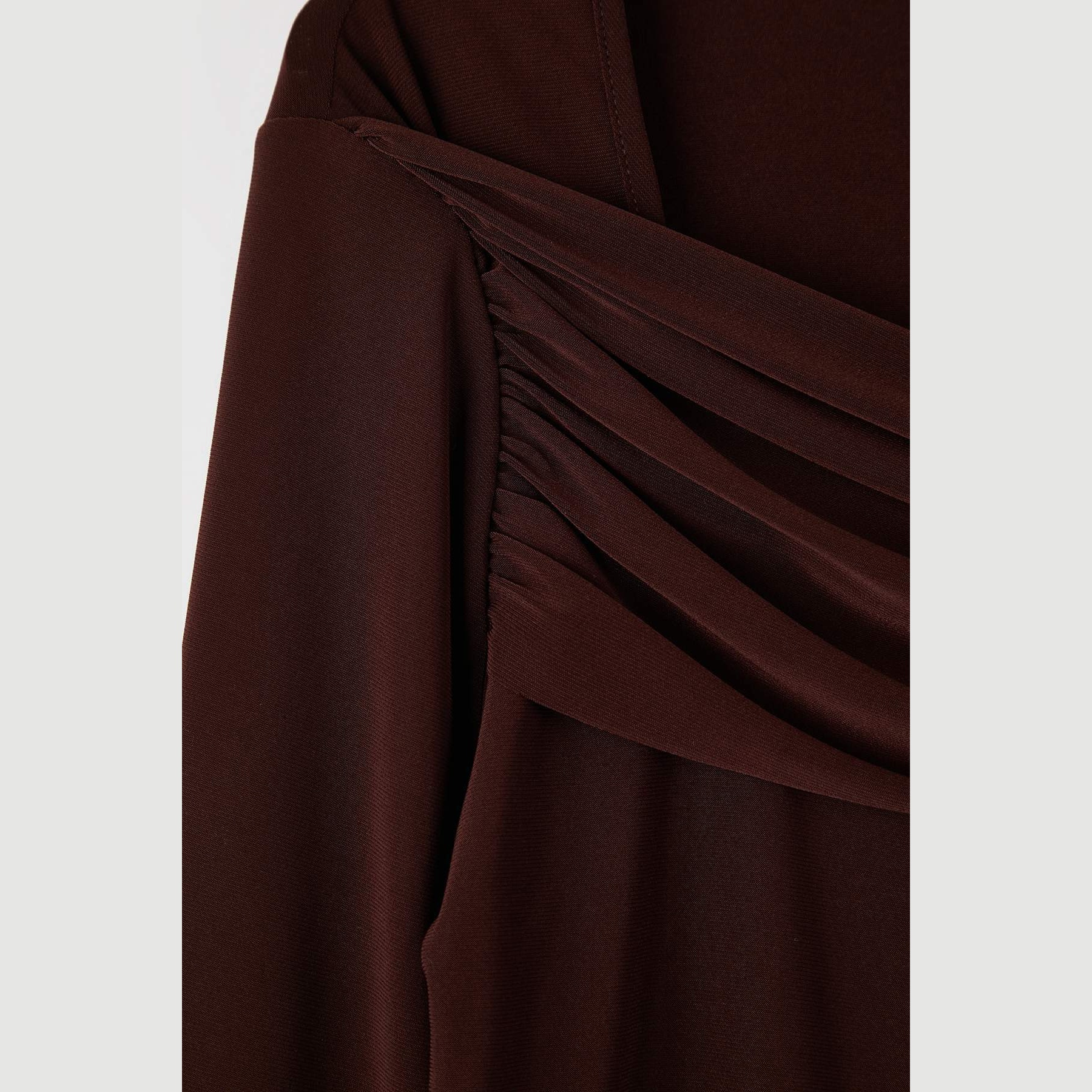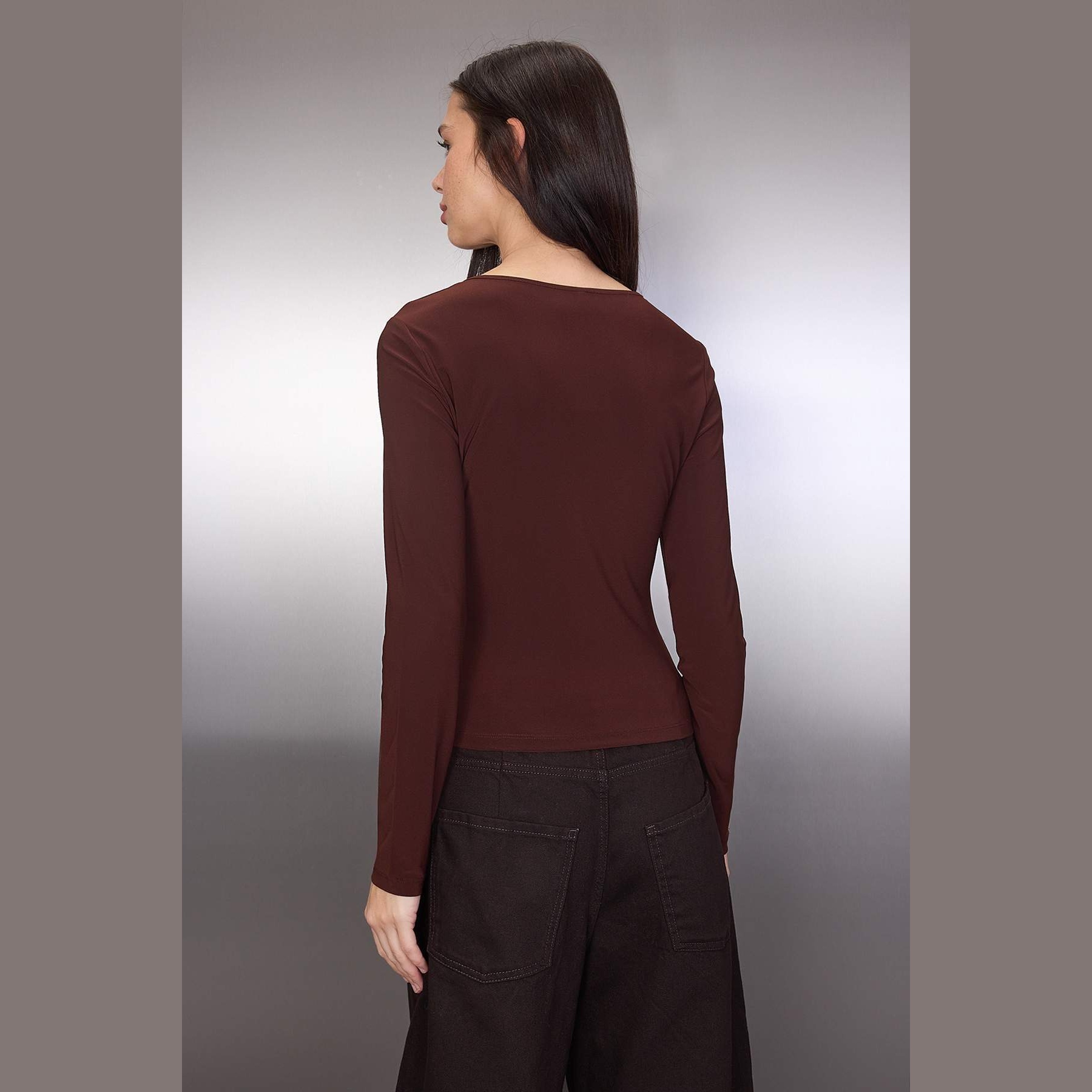 بلوزة نسائية بلون بني، مصنوعة من خامة محاكة مرنة بتركيبة بوليستر وإيلاستان، تمنح راحة مثالية وملمسًا ناعمًا على البشرة. تأتي بقصة ضيقة وياقة دائرية وأكمام طويلة، وتبرز بتفصيل Cut-Out عند الصدر مزين بإكسسوار معدني أنيق، يمنح مظهرًا عصريًا جريئًا مثاليًا للسهرات أو الإطلالات المسائية.
