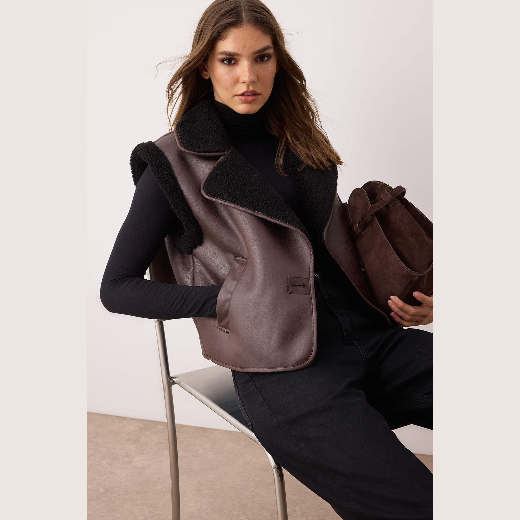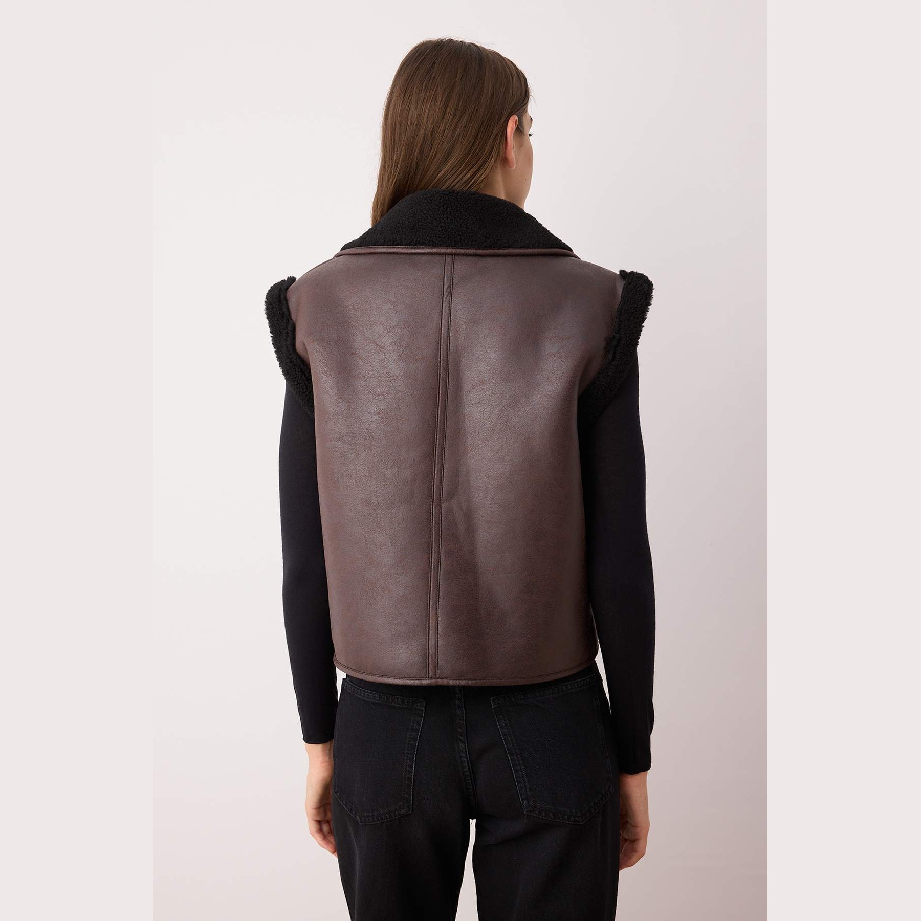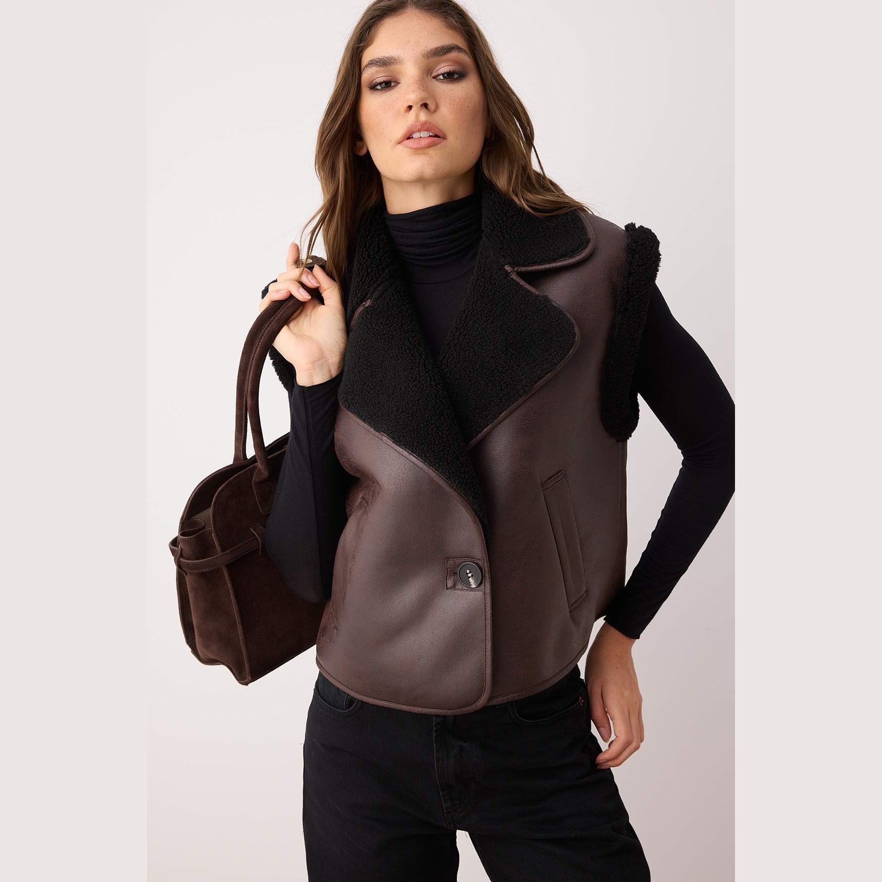 فيست نسائي بلون بني داكن، مصنوع من خامة سويد ناعمة ومبطّن بالكامل، مزين بتفاصيل من الفرو الصناعي تضيف لمسة دافئة وأنيقة. يأتي بقصة Regular مريحة لا تلتصق بالجسم، مما يوفر حرية في الحركة، ويمنح إطلالة شتوية عملية ومميزة.