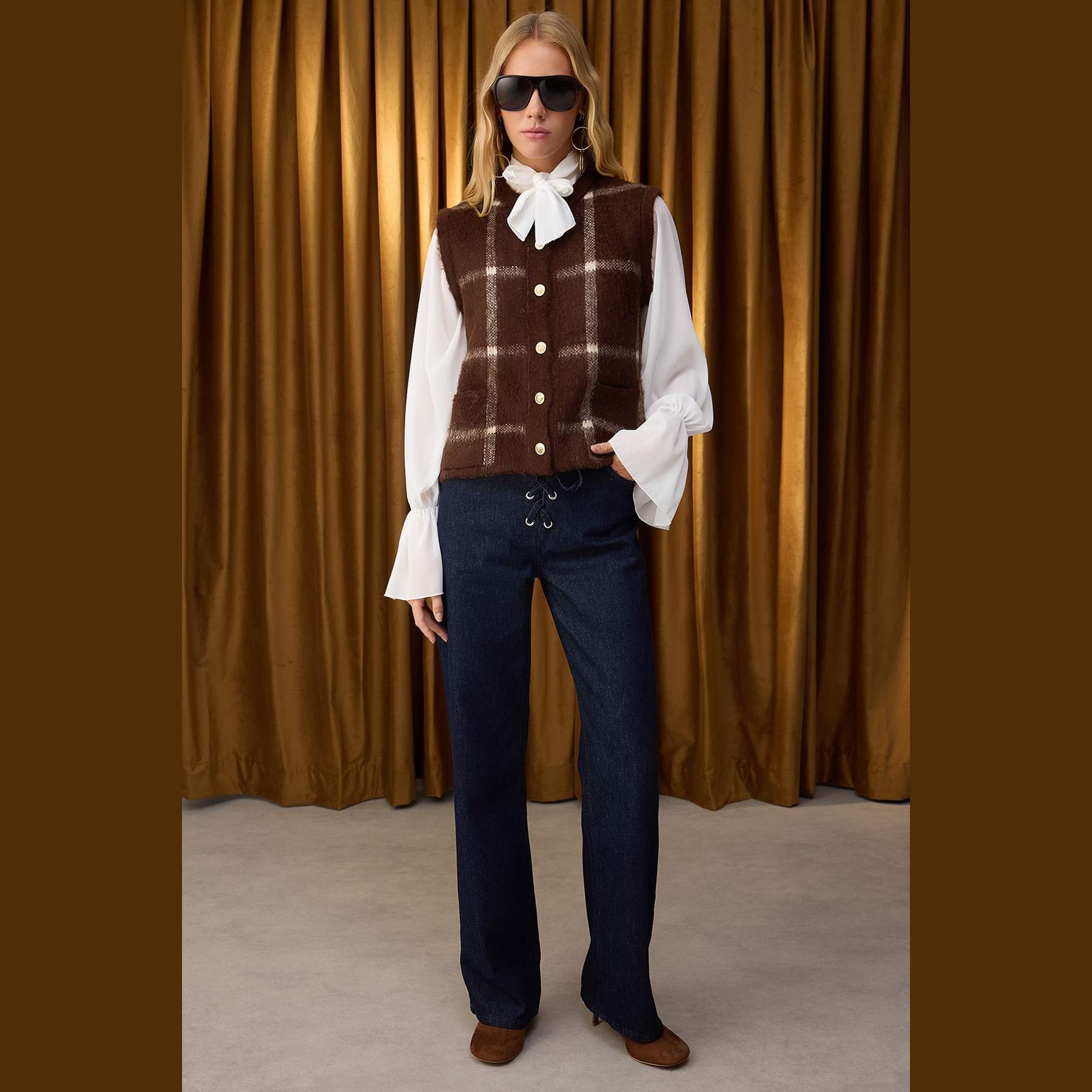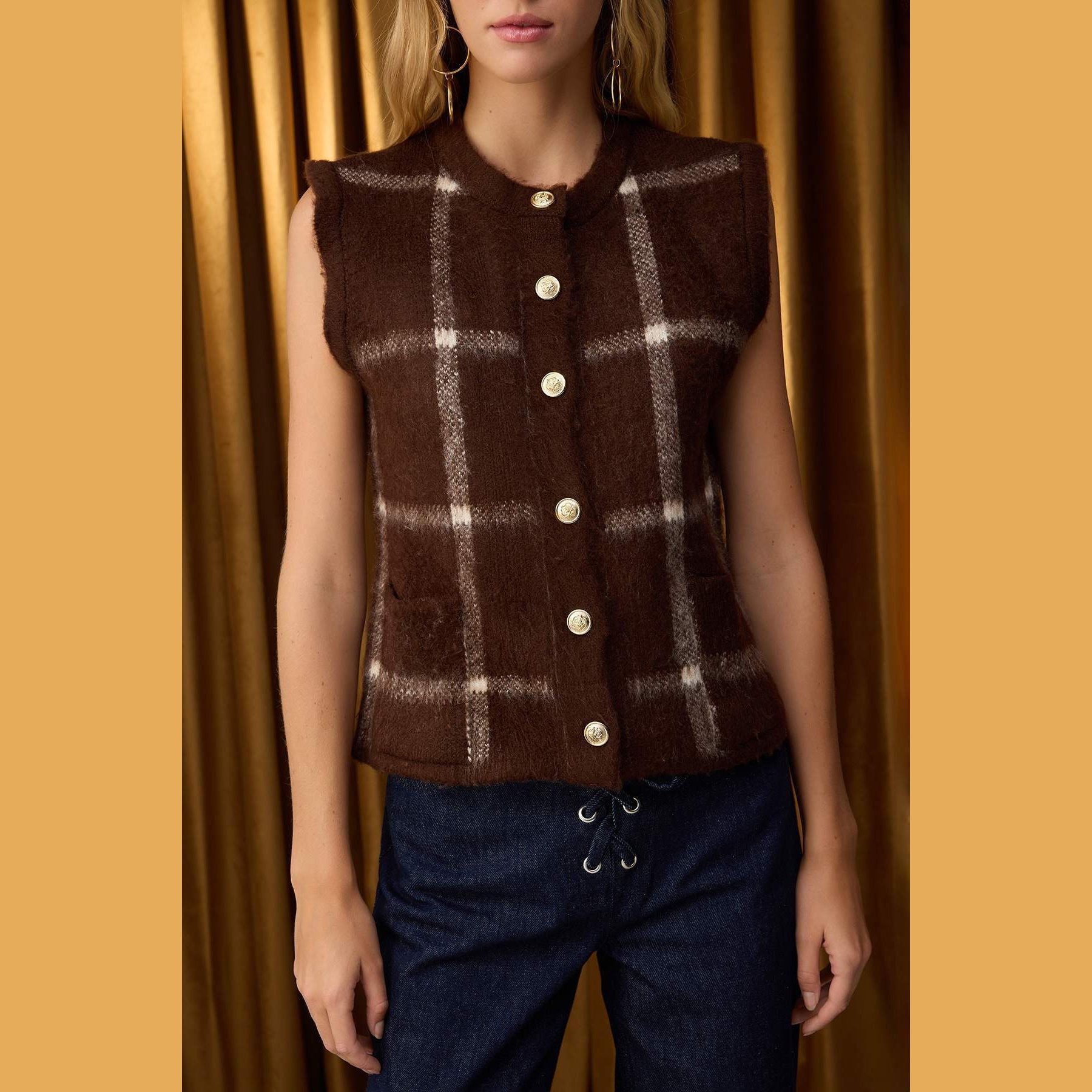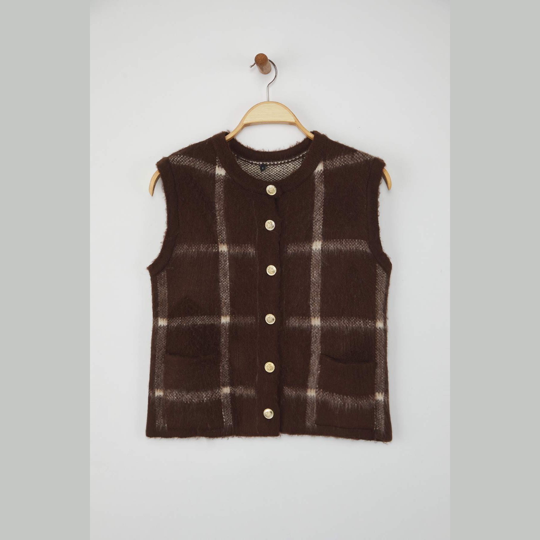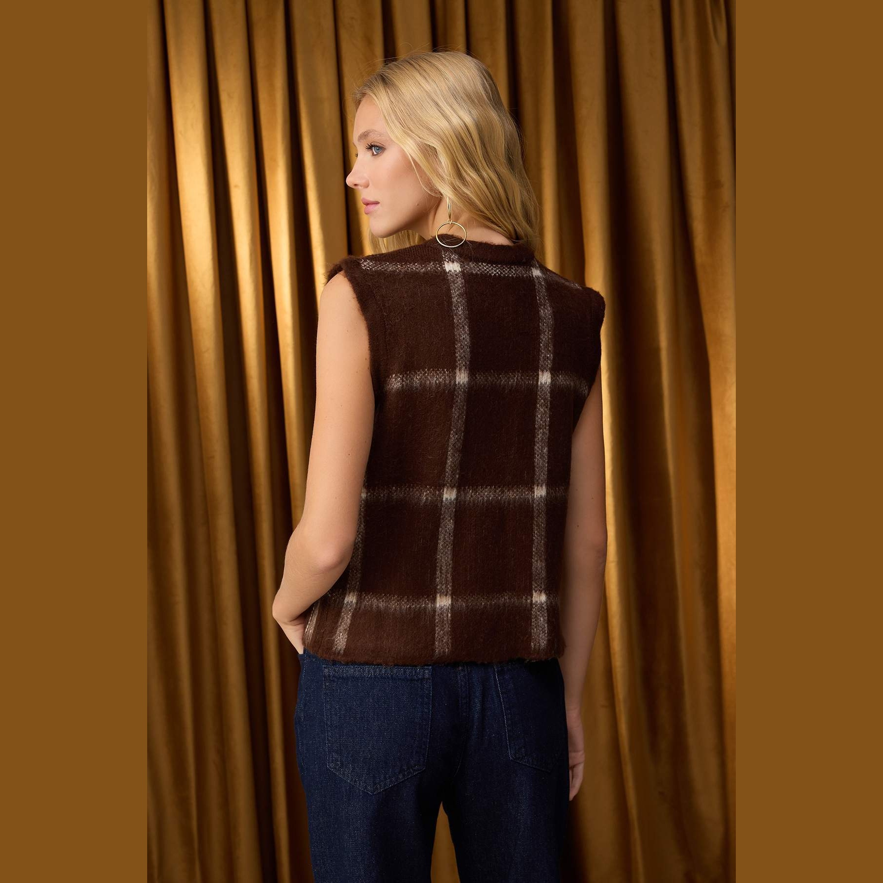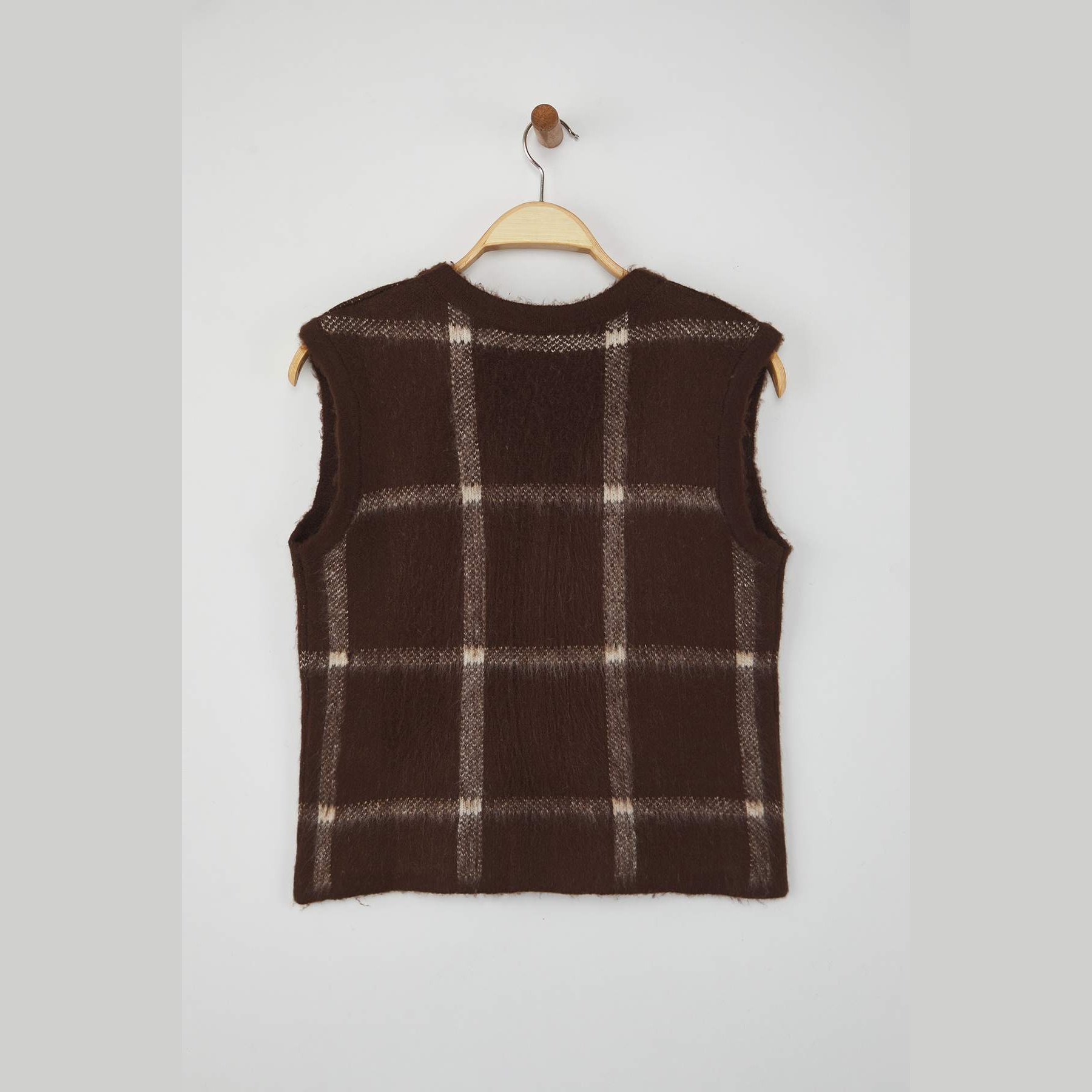 فيست نسائي بلون بني بنقشة مربعات كلاسيكية، مصنوع من خامة تريكو سميكة وناعمة بتركيبة ألياف صناعية، يمنح إحساسًا بالدفء والراحة في الأجواء الباردة. يتميز بقصة Regular مريحة لا تلتصق بالجسم، مع ياقة دائرية وتصميم بدون أكمام، مما يجعله مثاليًا للتنسيق مع القمصان أو البلوزات في الإطلالات الشتوية اليومية.