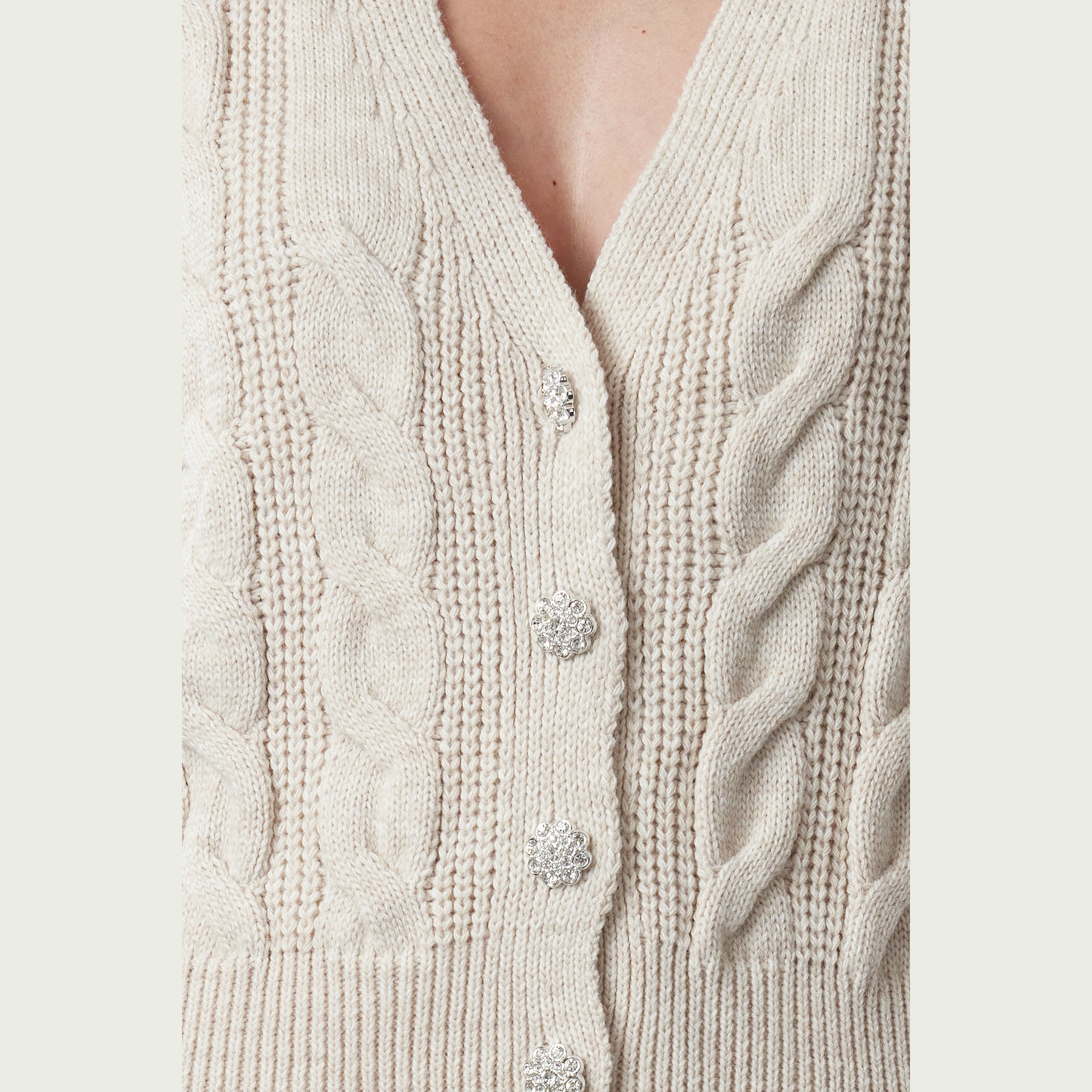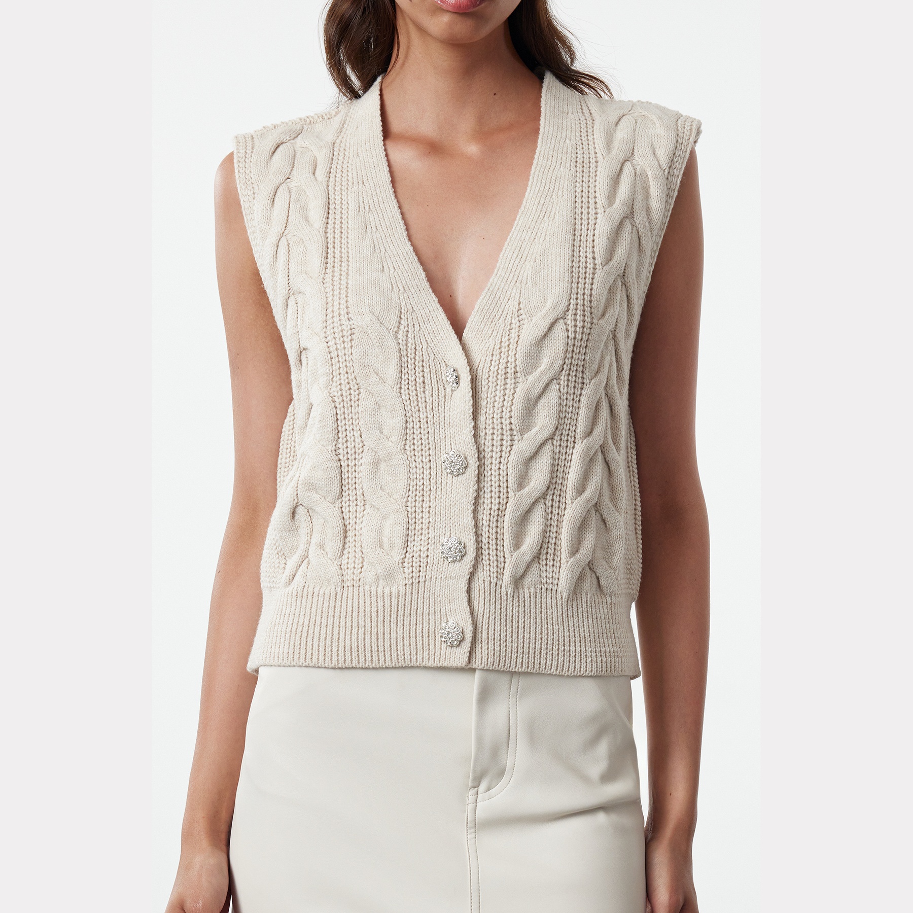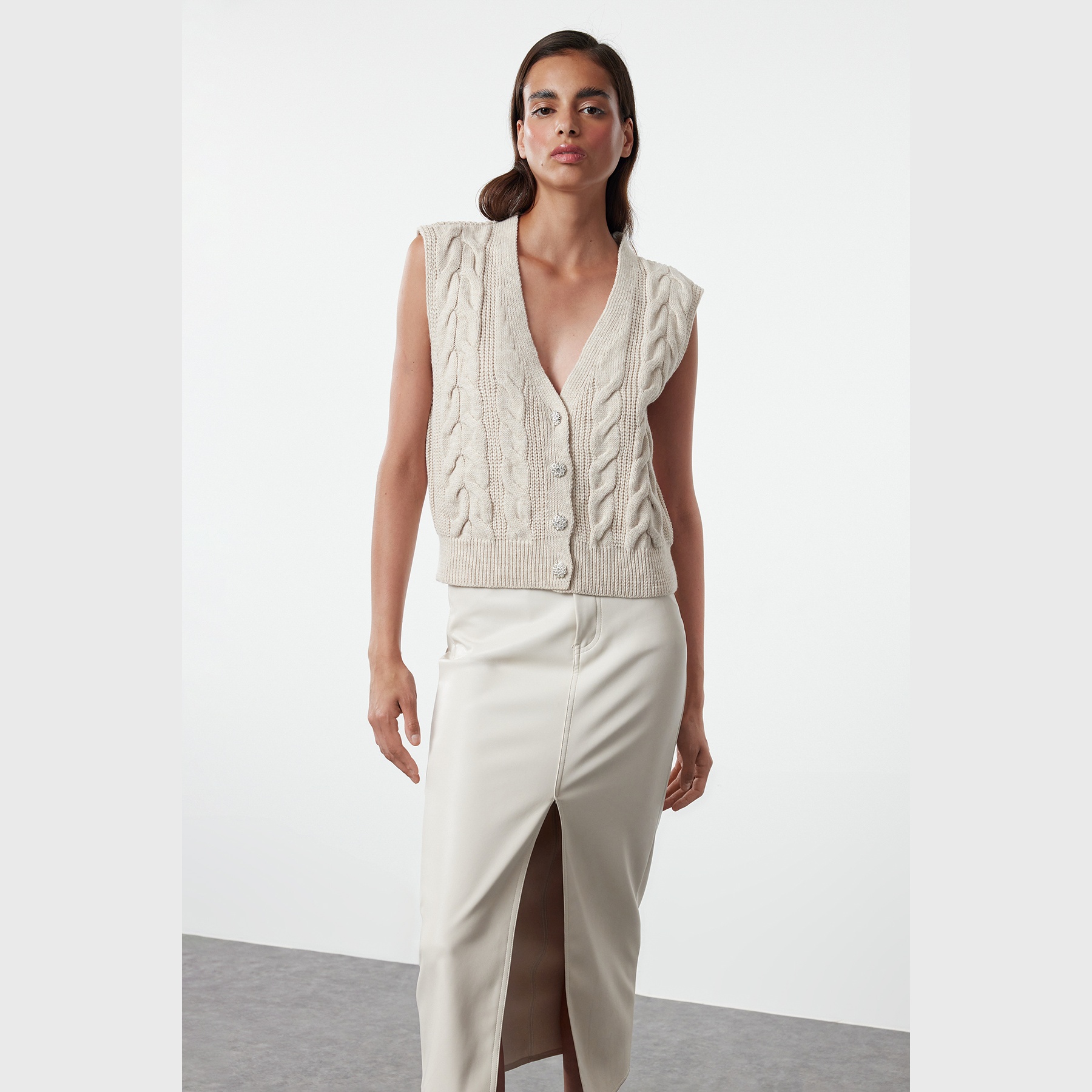 - الخصائص الإضافية: نقشة حياكة مضلعة – أزرار أمامية بلون الحجر