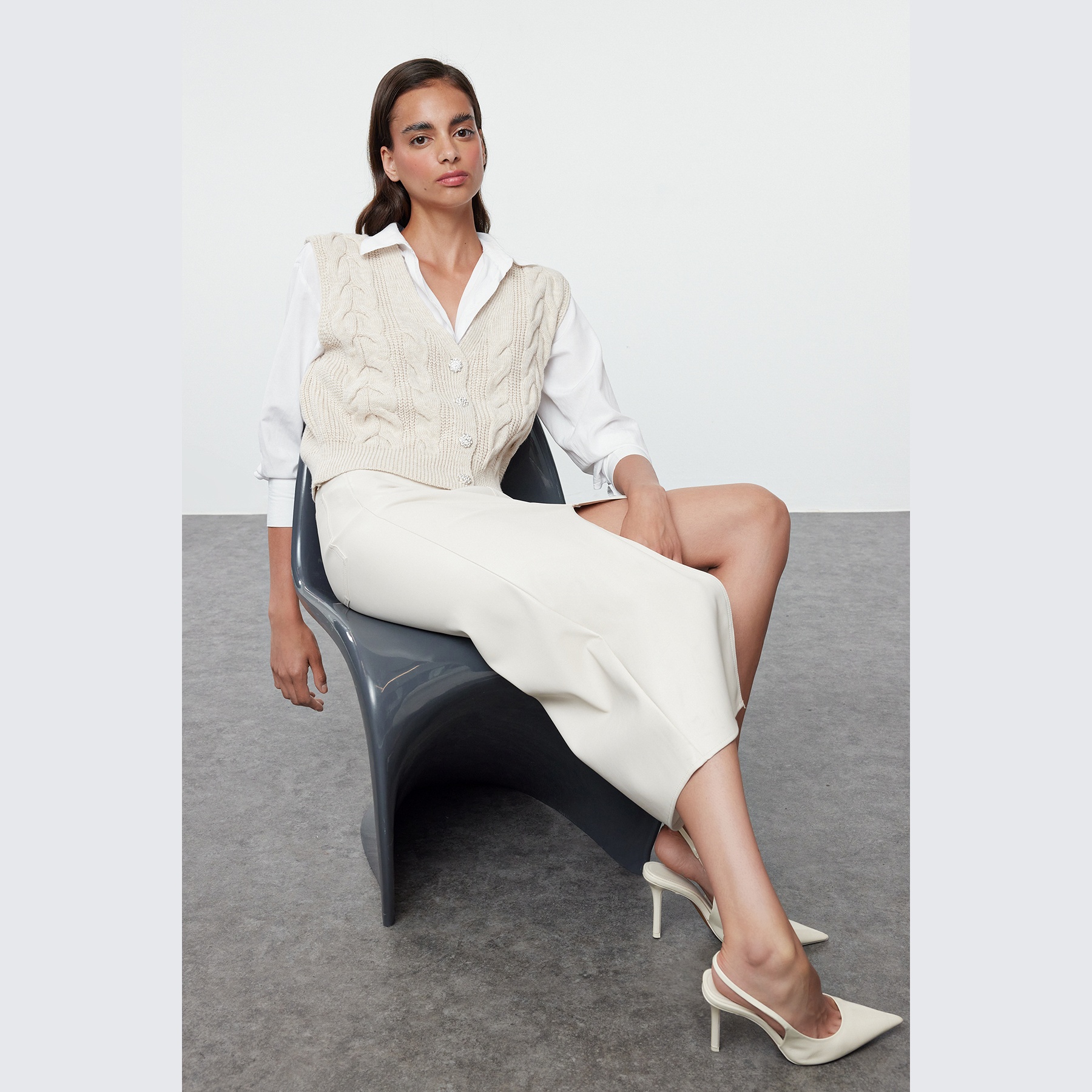 فيست نسائي بلون بيج فاتح، مصنوع من خامة تريكو ناعمة بنقشة الحياكة المضلعة، يتميز بقصة Regular مريحة لا تلتصق بالجسم، وتصميم أنيق مزين بأزرار أمامية بلون الحجر تضيف لمسة كلاسيكية ناعمة. مثالي للإطلالات اليومية في الأجواء المعتدلة.