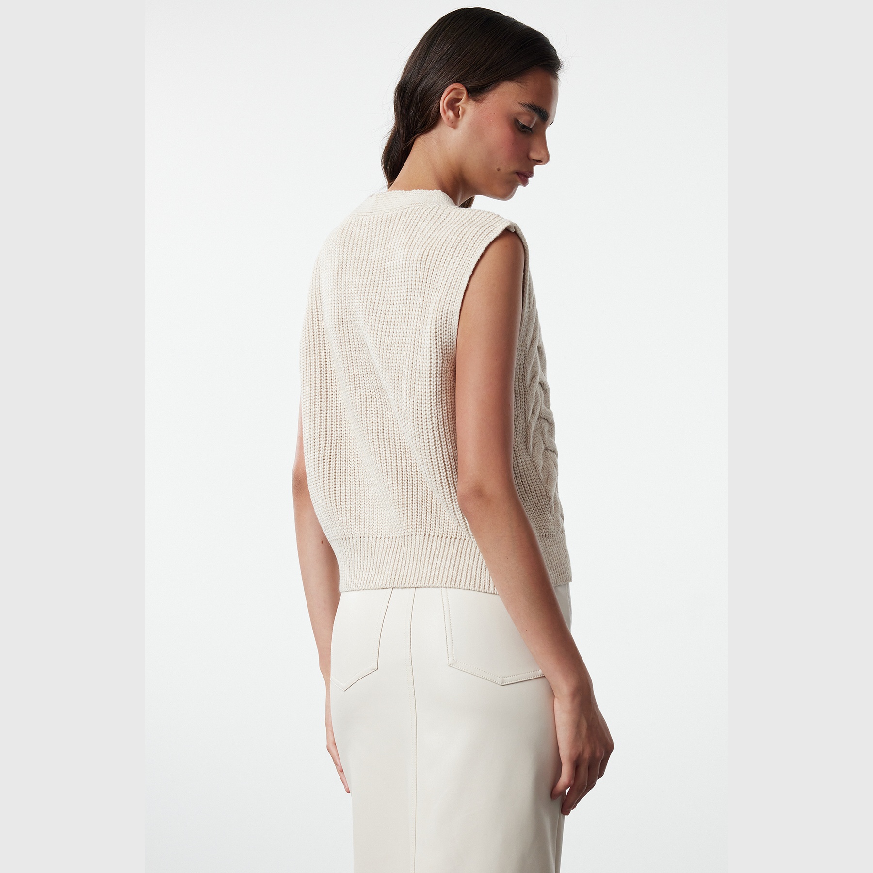 فيست نسائي – بيج فاتح بنقشة حياكة وأزرار أمامية (تصميم ناعم بخامة تريكو وقصة مريحة)