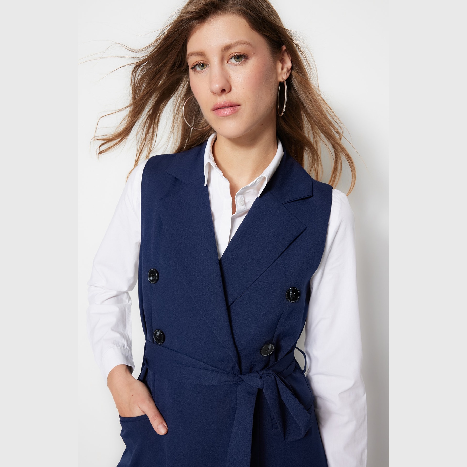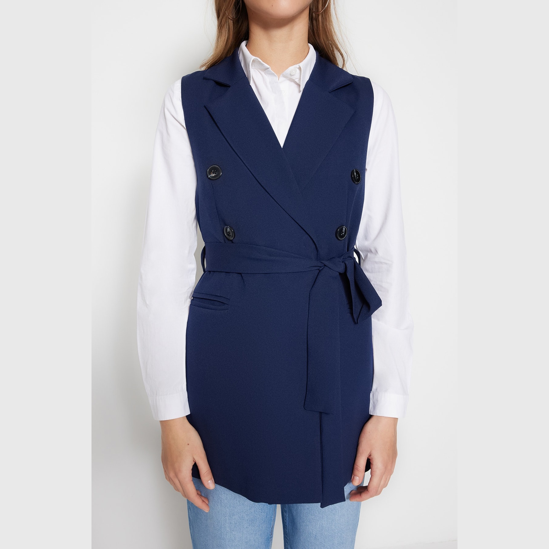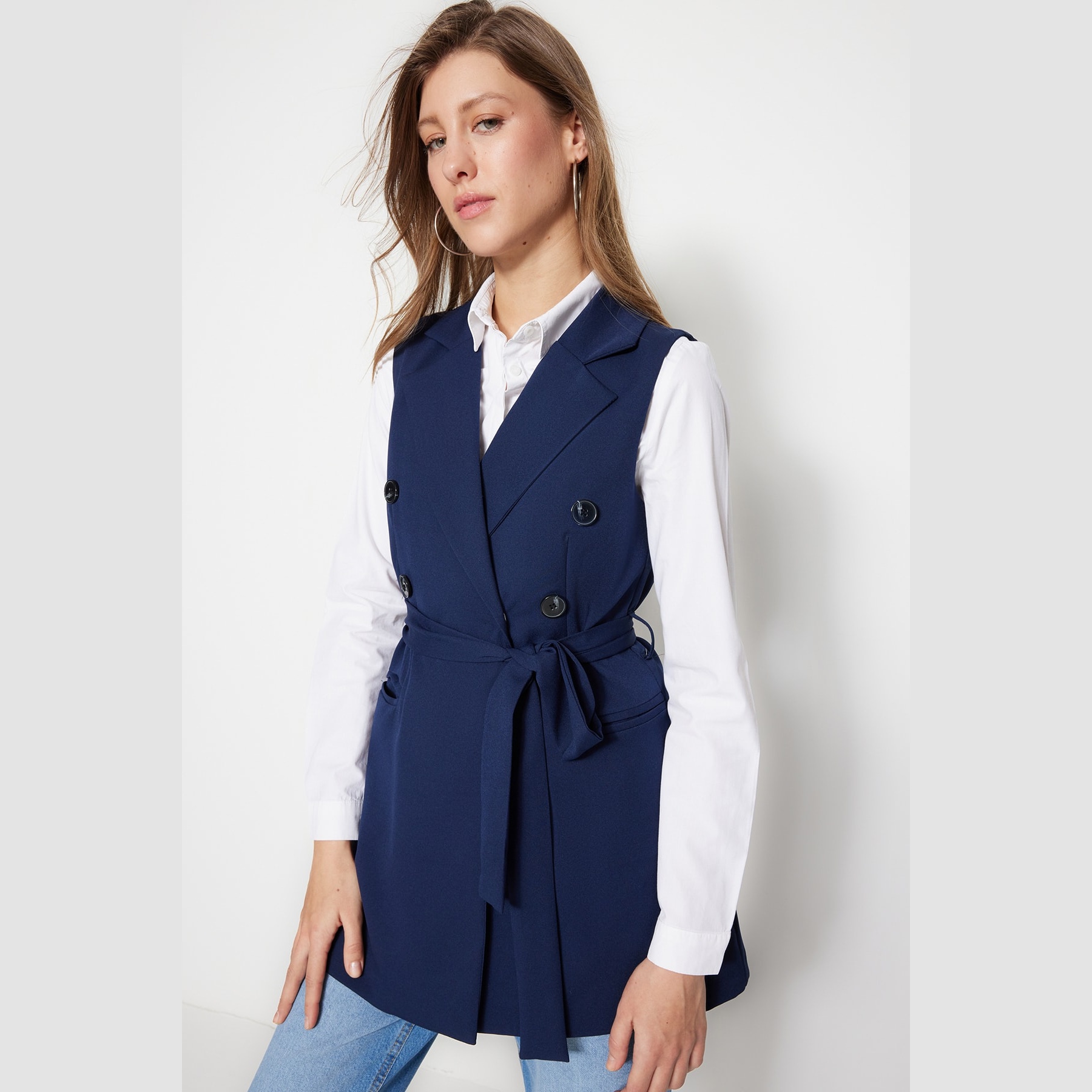 فيست نسائي – كحلي بقصة Regular وربطة خصر (تصميم محتشم أنيق بخامة دوكّوما مبطنة)