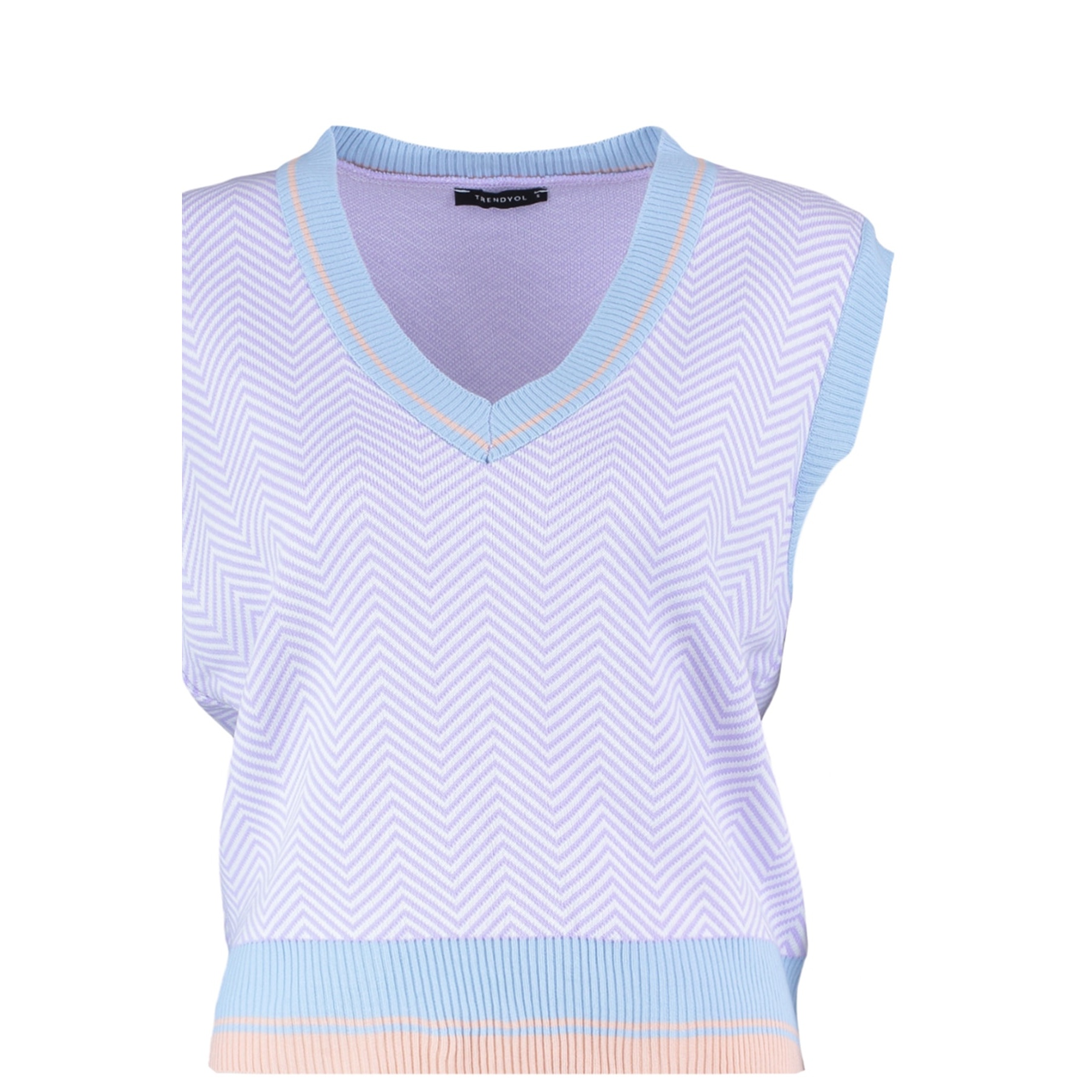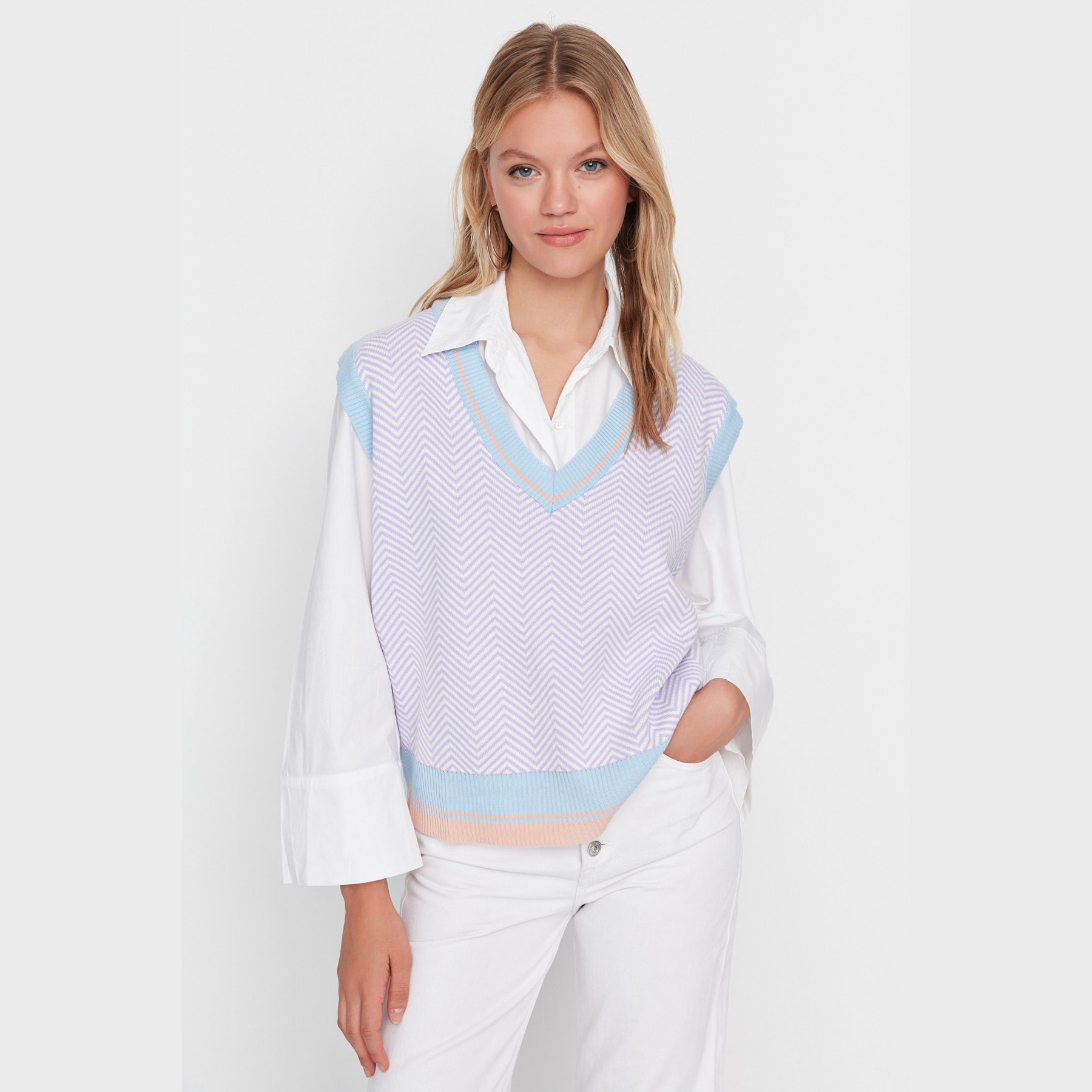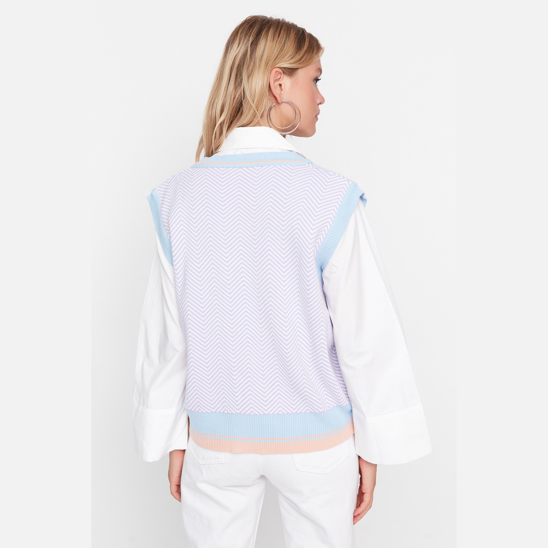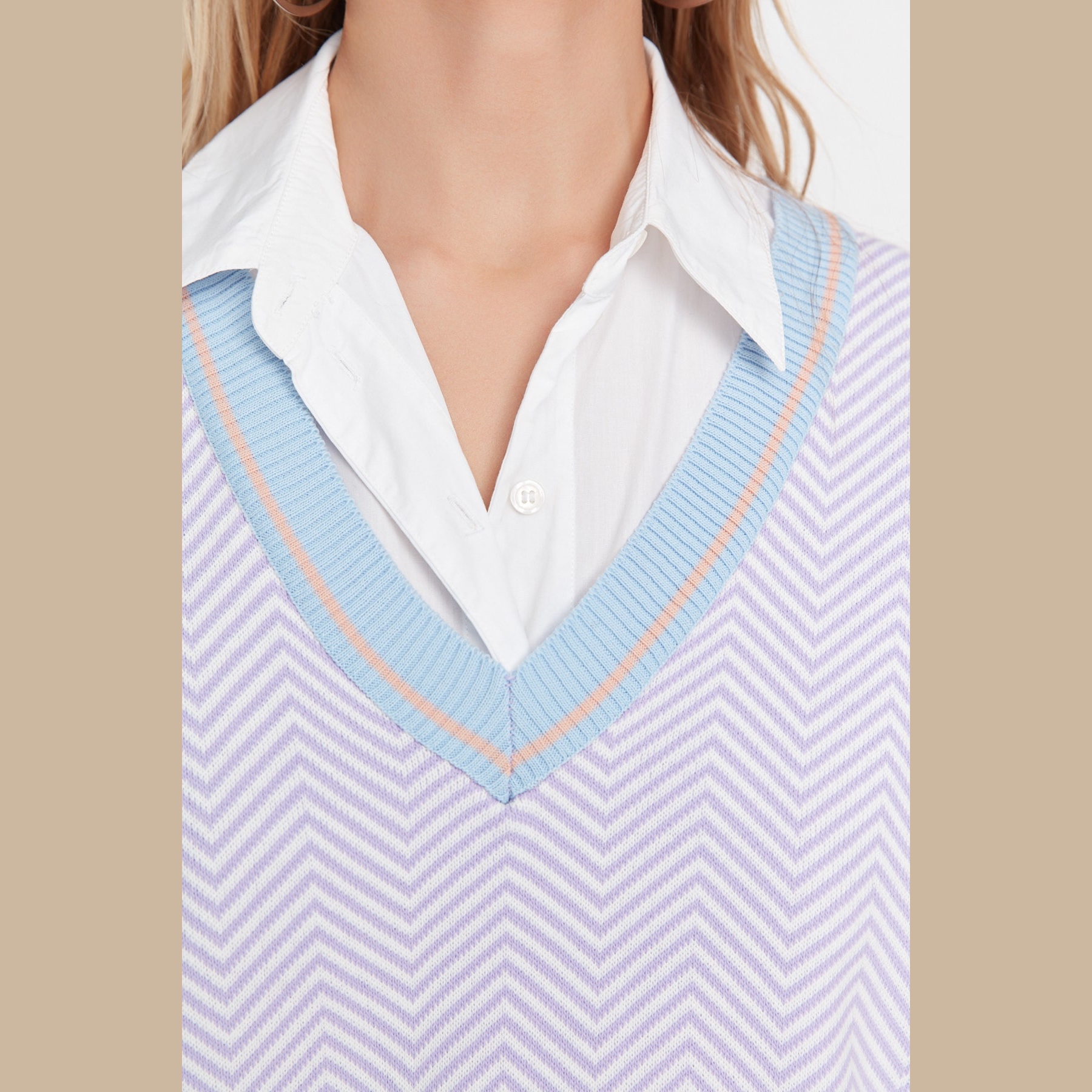 سُويڤتر نسائي – ليلكي بياقة V ونقشة هندسية (تصميم عصري مريح بخامة تريكو ناعمة)
