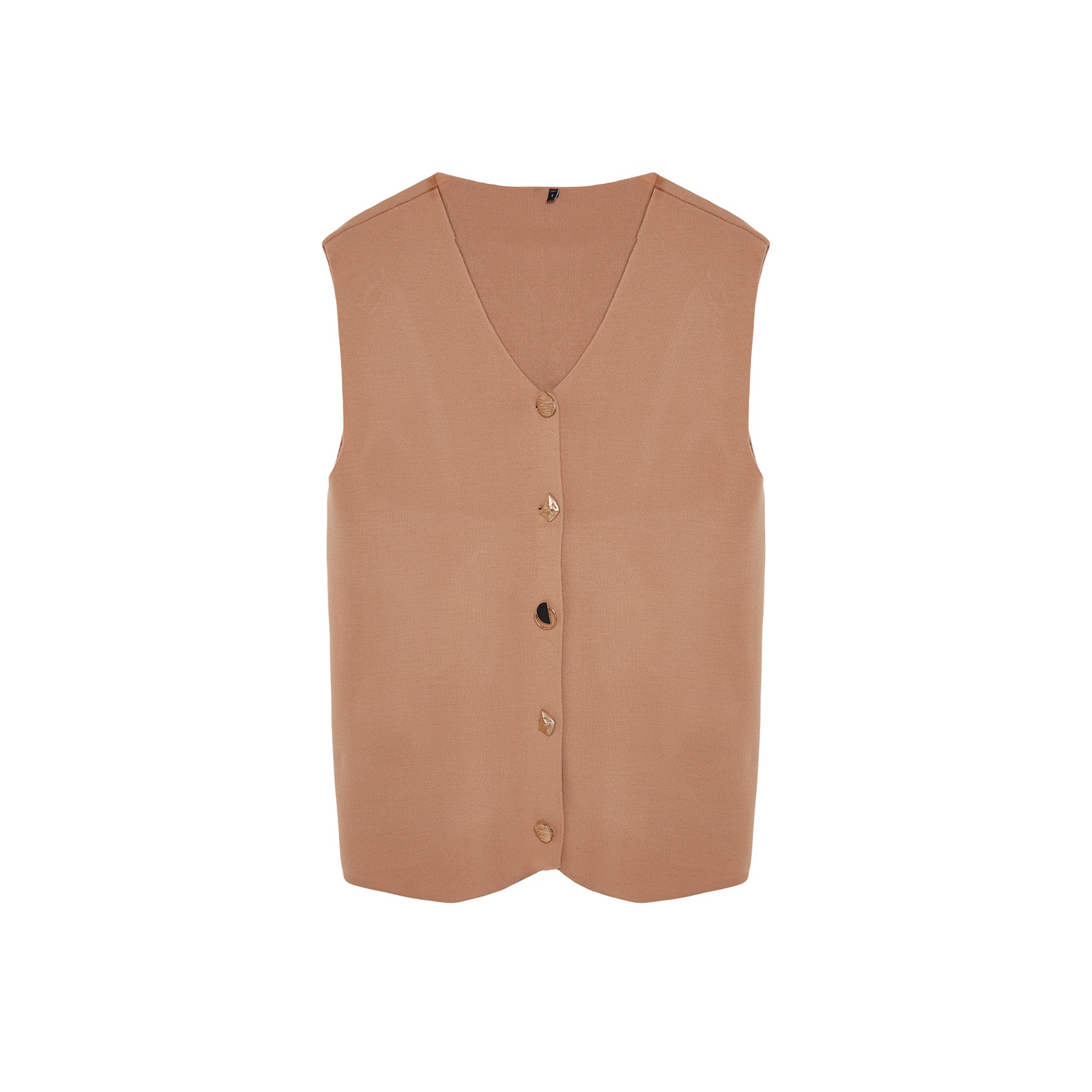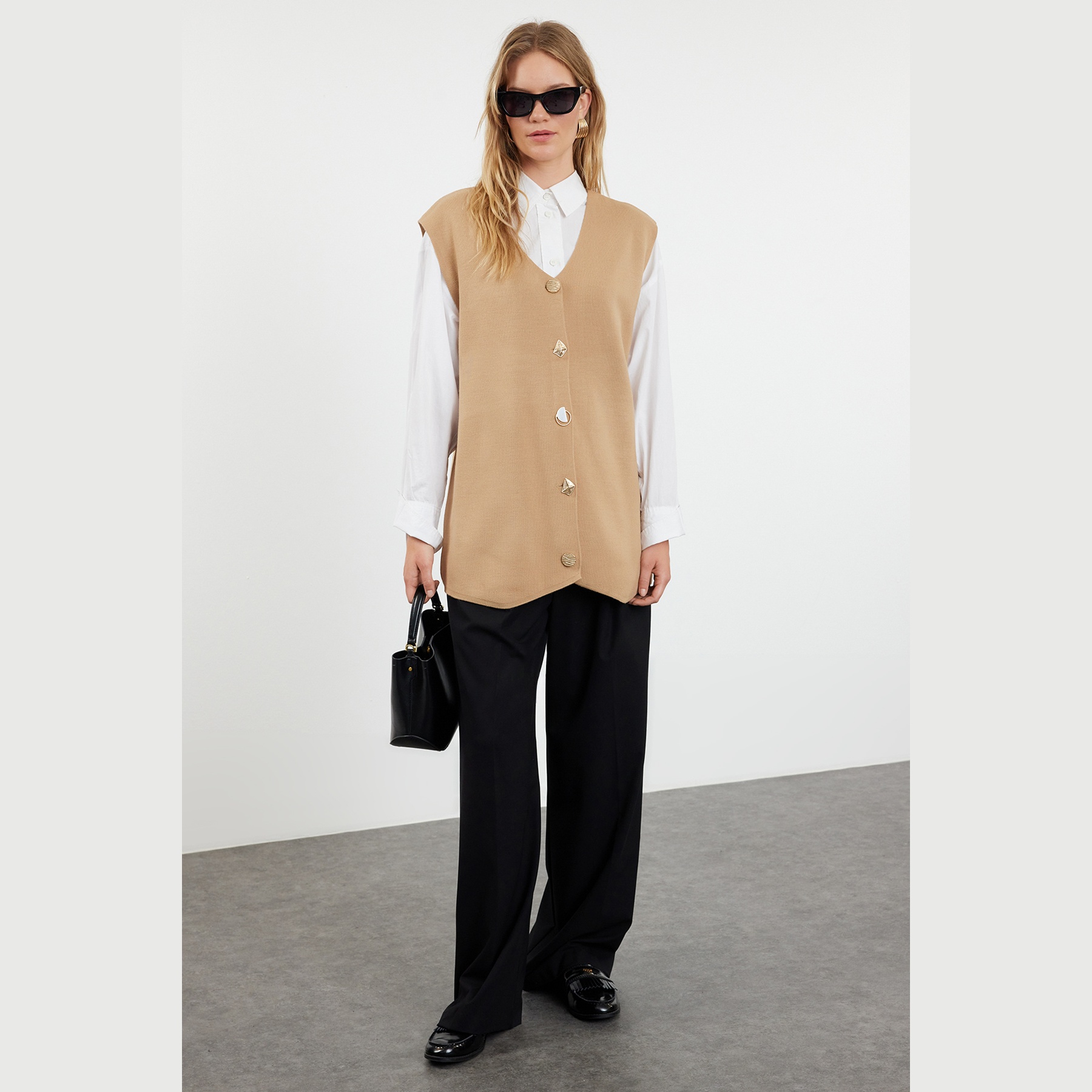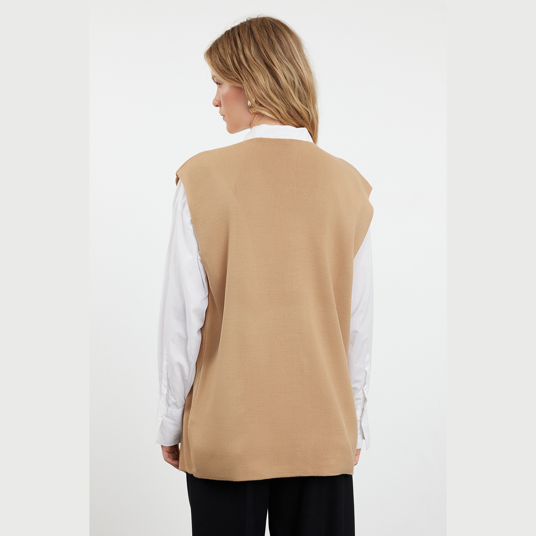 سُويڤتر/فيست نسائي بلون بيج، مصنوع من خامة تريكو ناعمة بتركيبة أكرليك، يتميز بقصة Relaxed مريحة، وياقة V أنثوية، مع تصميم بدون أكمام يمنح حرية في التنسيق. مزين بأزرار إكسسوارية تضيف لمسة تصميمية أنيقة. خيار مثالي للإطلالات اليومية المحتشمة في فصلي الربيع والخريف.