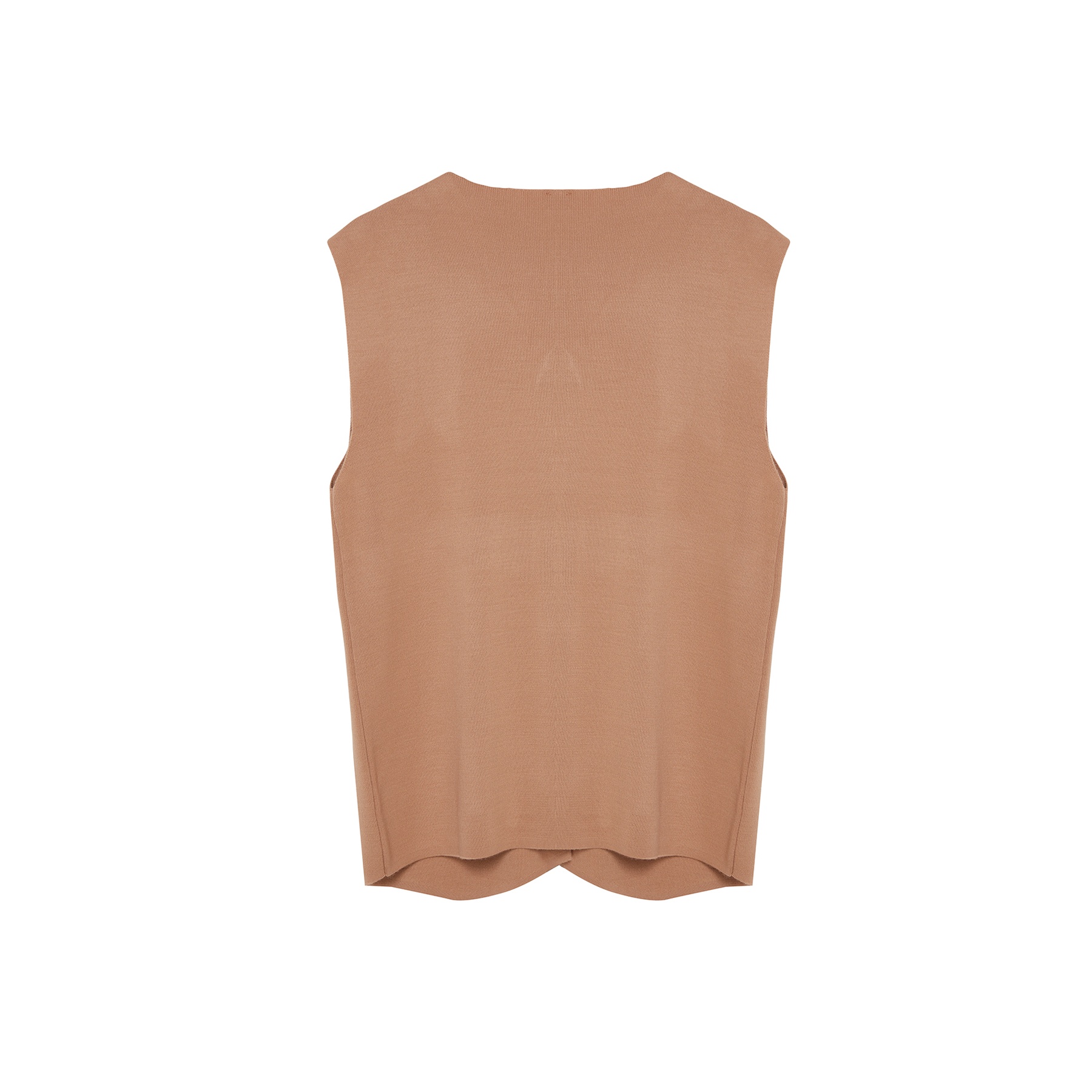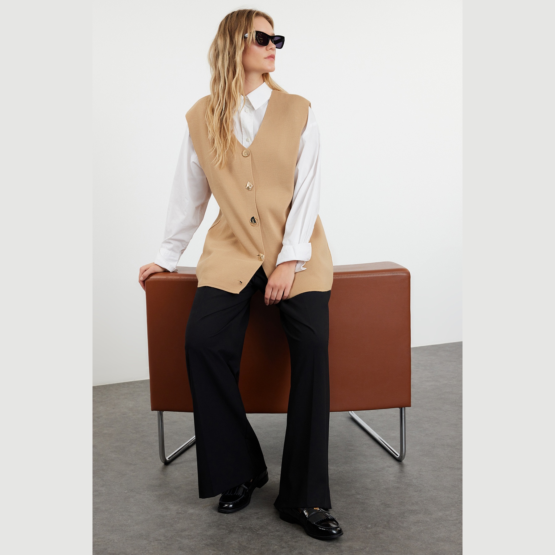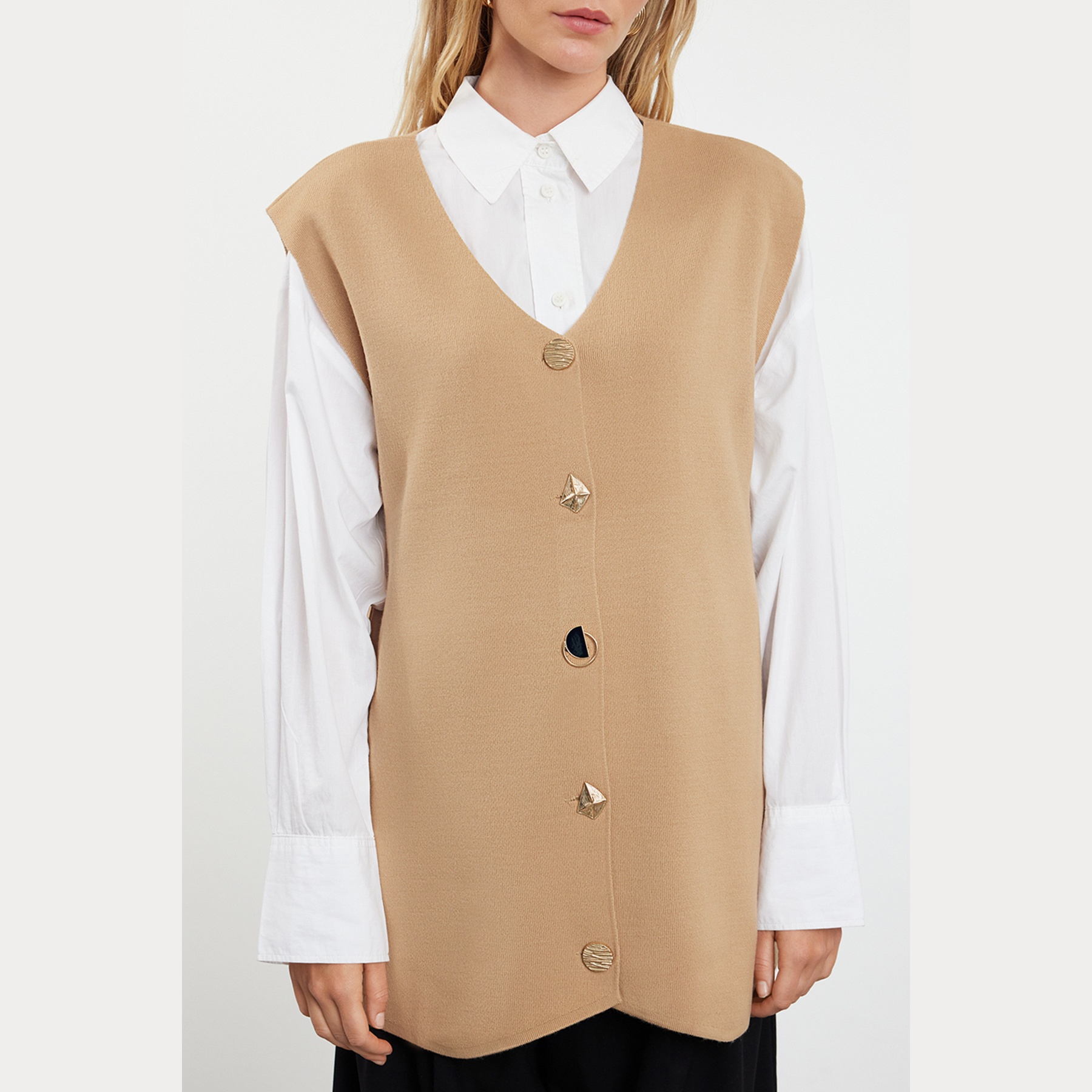 سُويڤتر/فيست نسائي بلون بيج، مصنوع من خامة تريكو ناعمة بتركيبة أكرليك، يتميز بقصة Relaxed مريحة، وياقة V أنثوية، مع تصميم بدون أكمام يمنح حرية في التنسيق. مزين بأزرار إكسسوارية تضيف لمسة تصميمية أنيقة. خيار مثالي للإطلالات اليومية المحتشمة في فصلي الربيع والخريف.