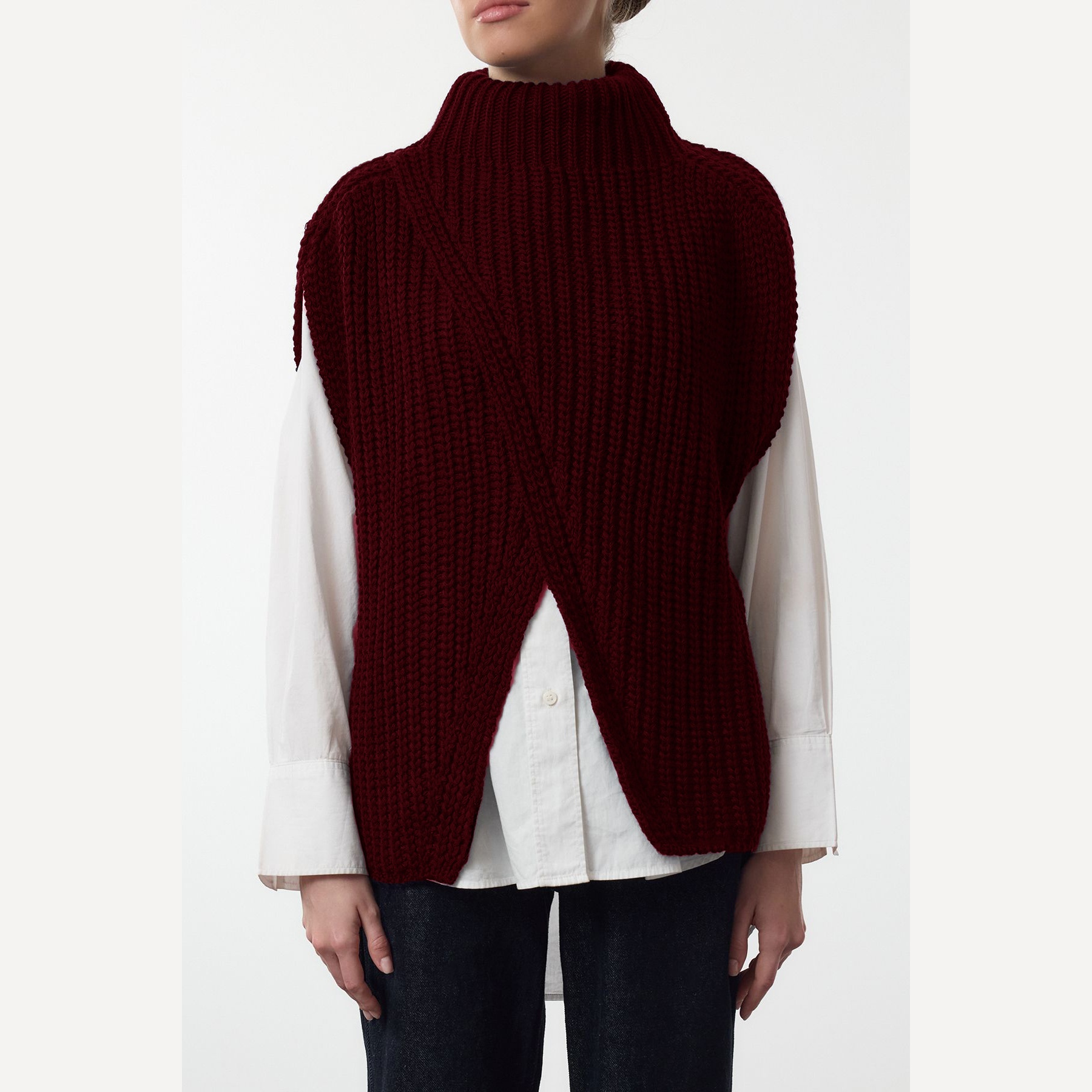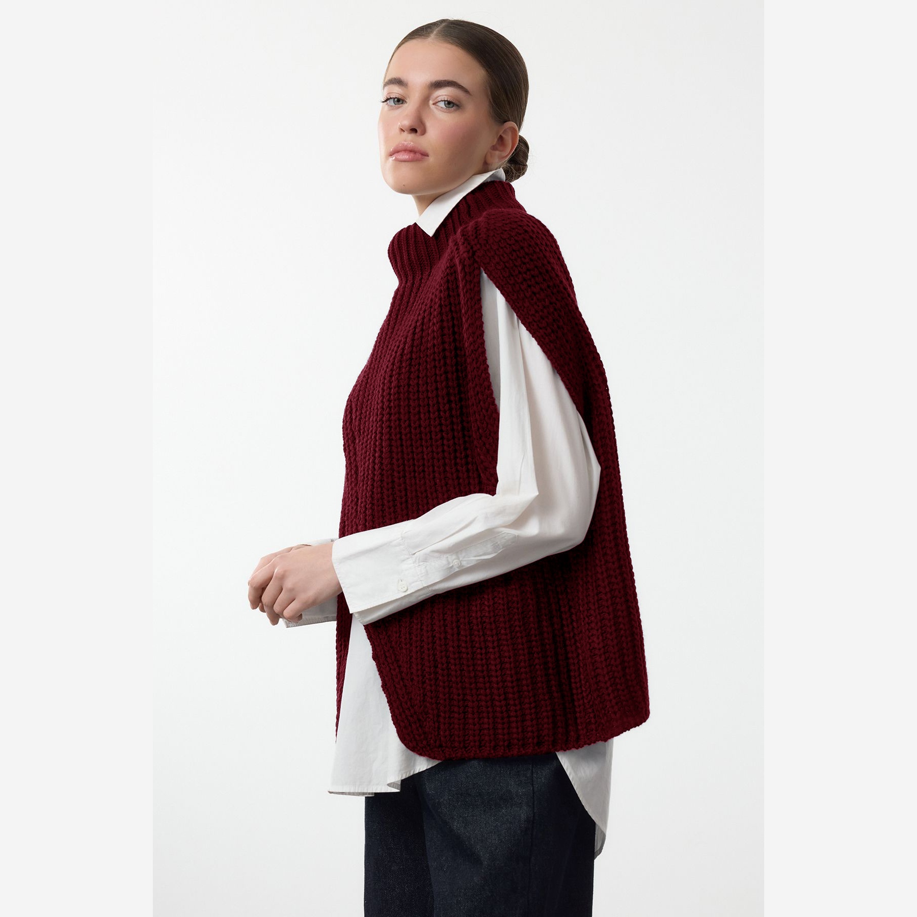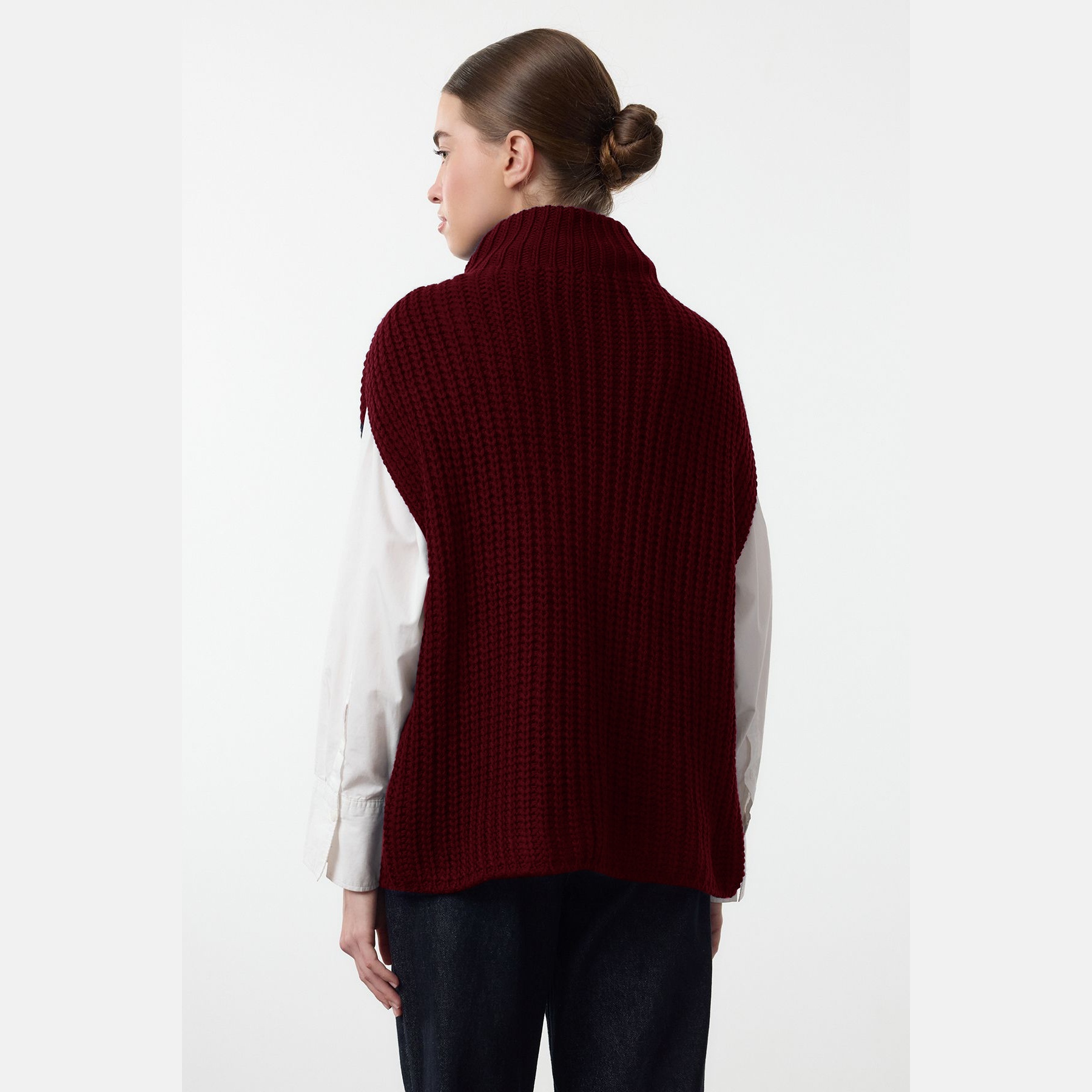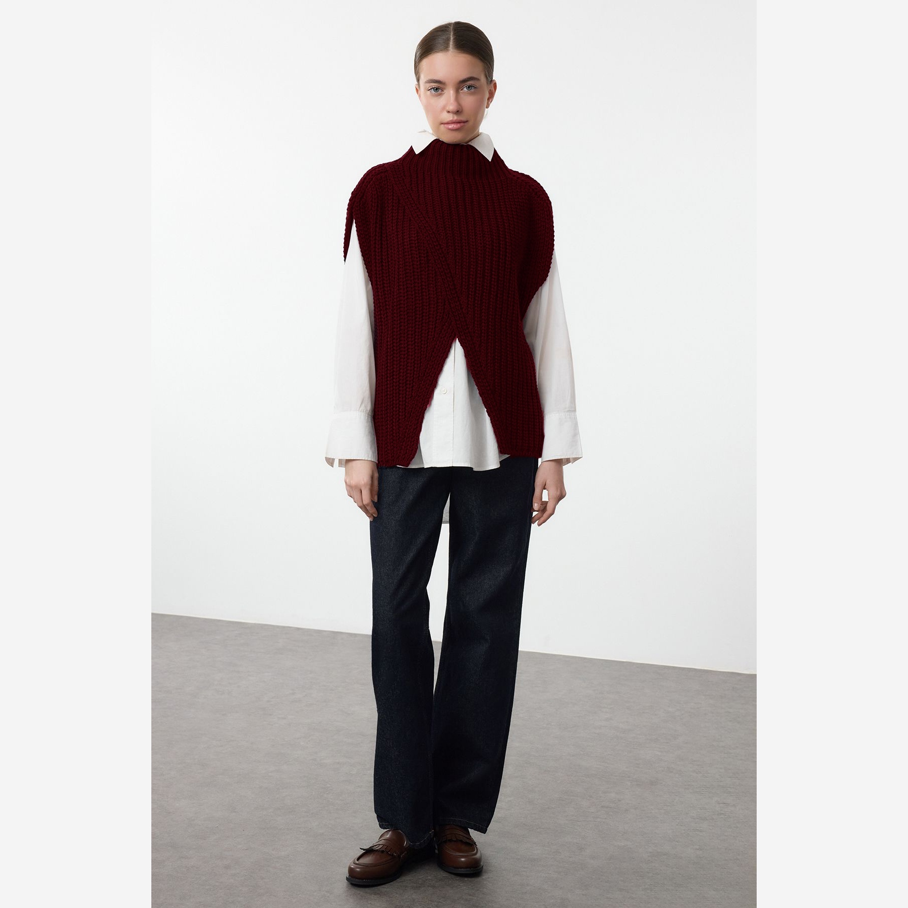 سُويڤتر نسائي بلون بوردو، مصنوع من خامة تريكو سميكة وناعمة، يتميز بقصة Oversize واسعة تمنح راحة في الحركة، وياقة عالية تضيف دفئًا وأناقة، مع شق جانبي يمنح حرية في التنسيق. تصميم بدون أكمام مثالي للارتداء فوق القمصان أو البلوزات في الأجواء الباردة.