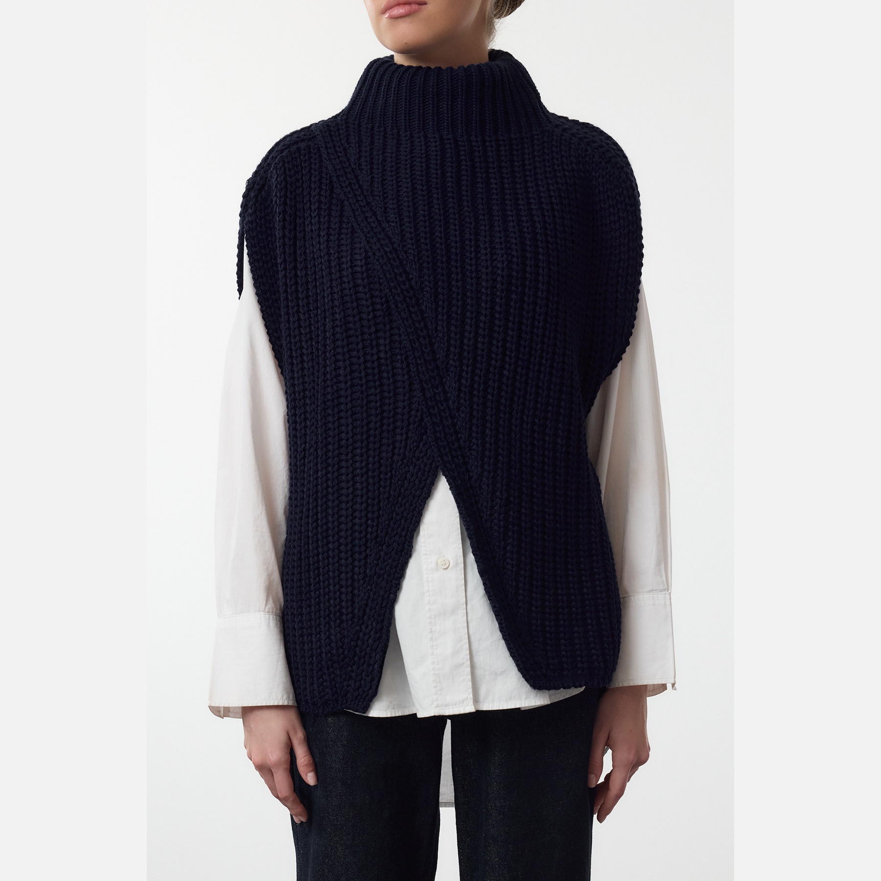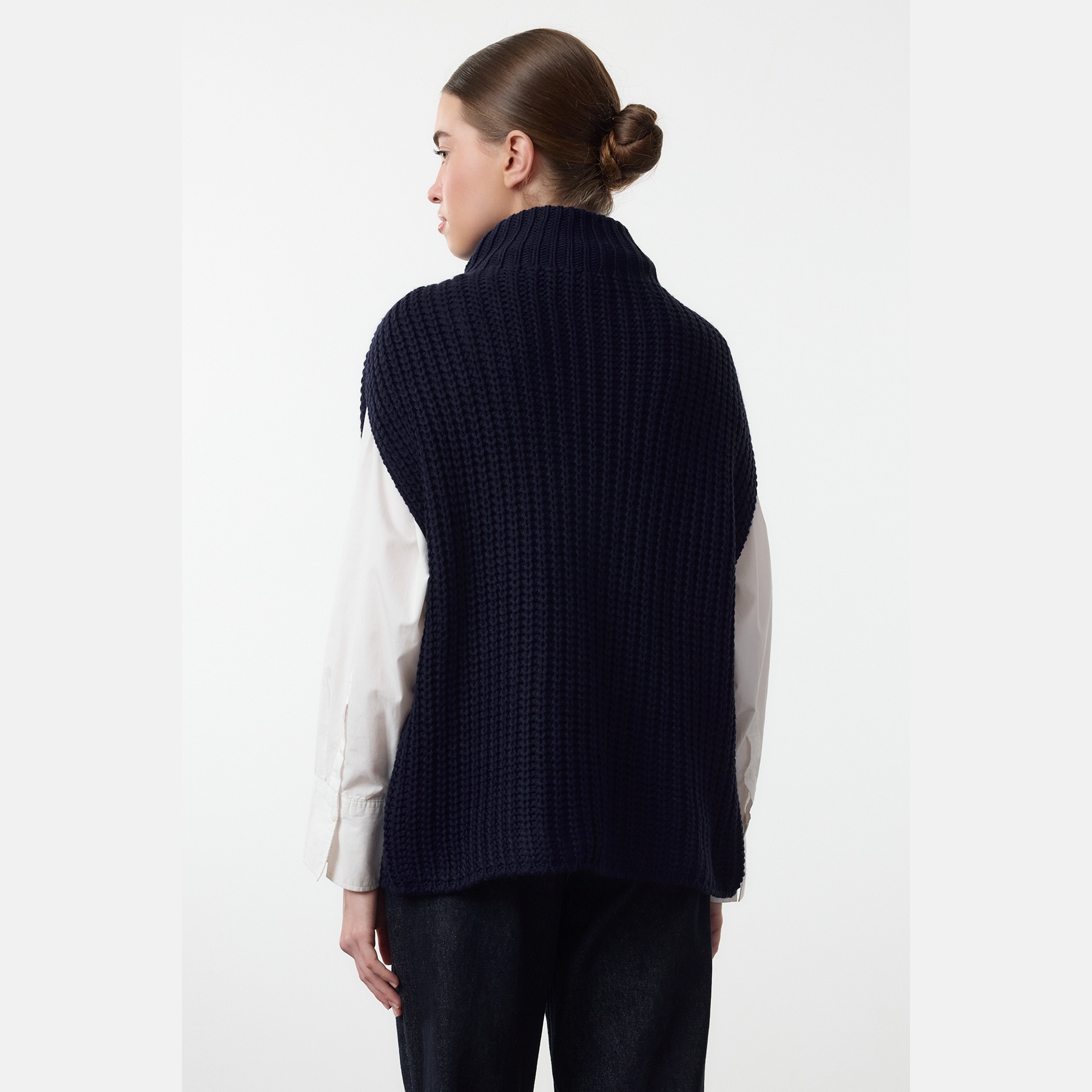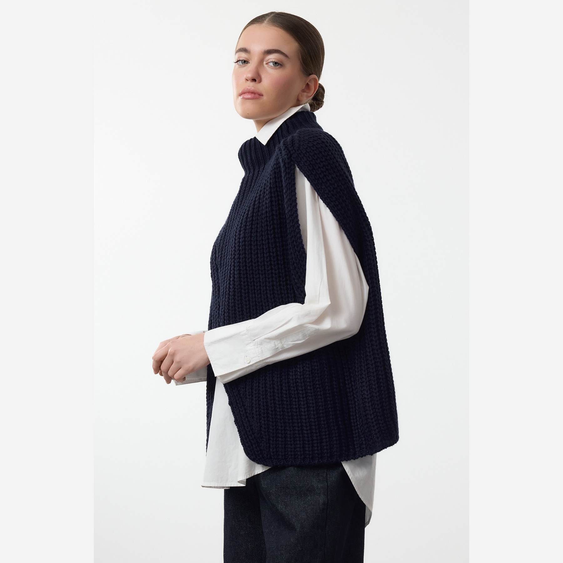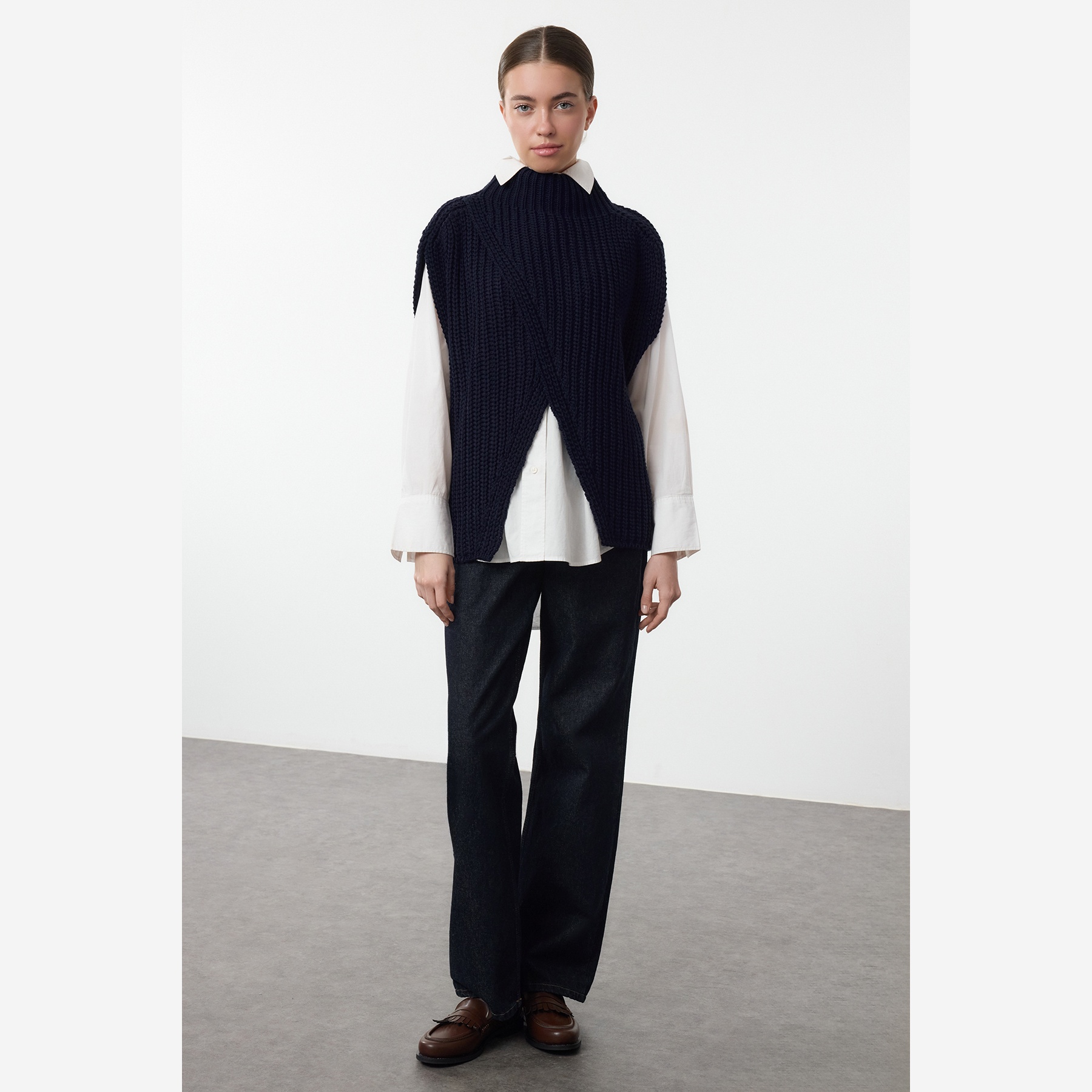 بانشو نسائي بلون كحلي، مصنوع من خامة تريكو سميكة ومريحة، يتميز بقصة Oversize واسعة تمنح حرية في الحركة، وياقة عالية تضيف دفئًا وأناقة، مع شق جانبي يمنح لمسة تصميمية عصرية. تصميم بدون أكمام مثالي للارتداء فوق القمصان أو البلوزات في الإطلالات اليومية الشتوية.