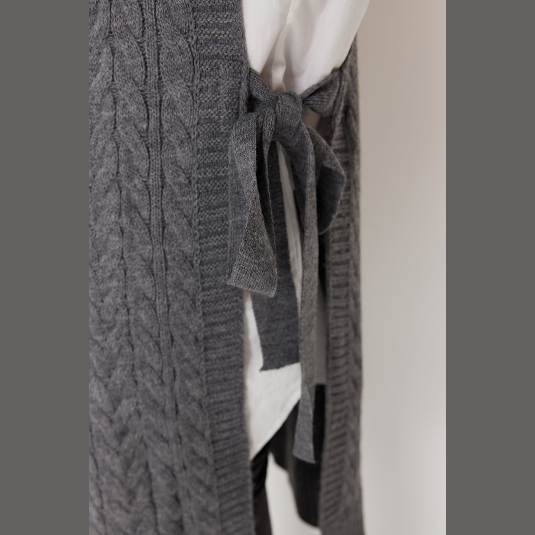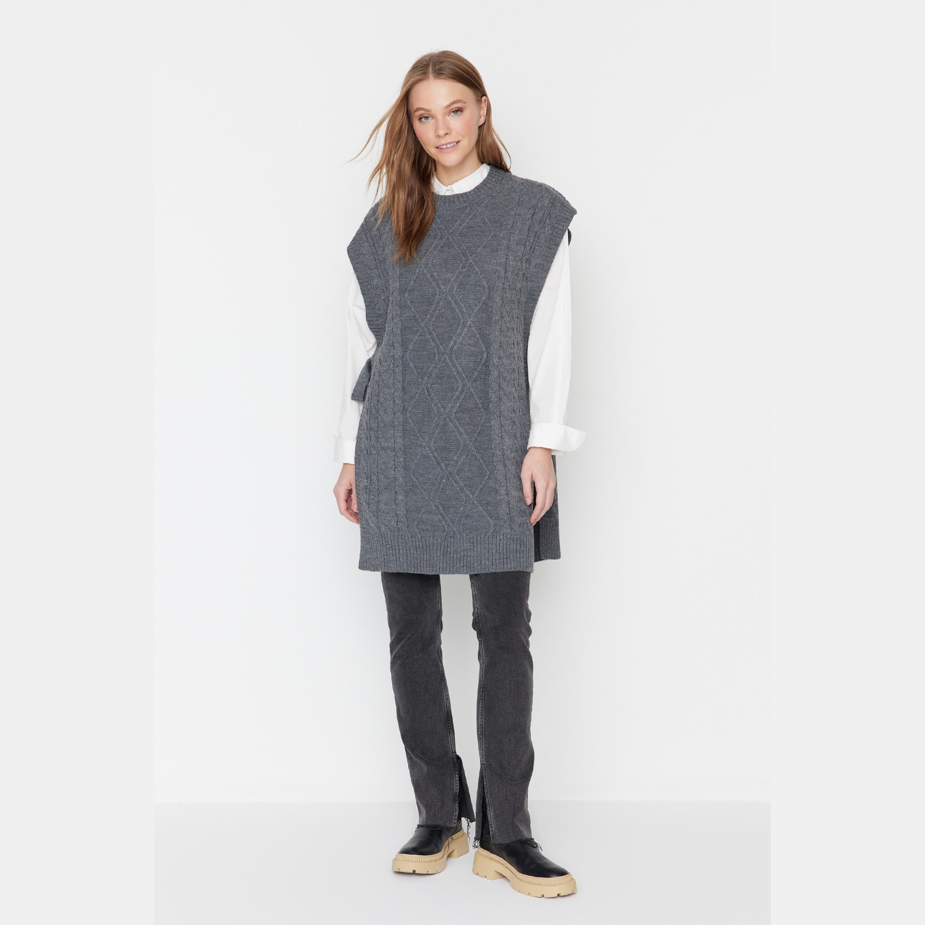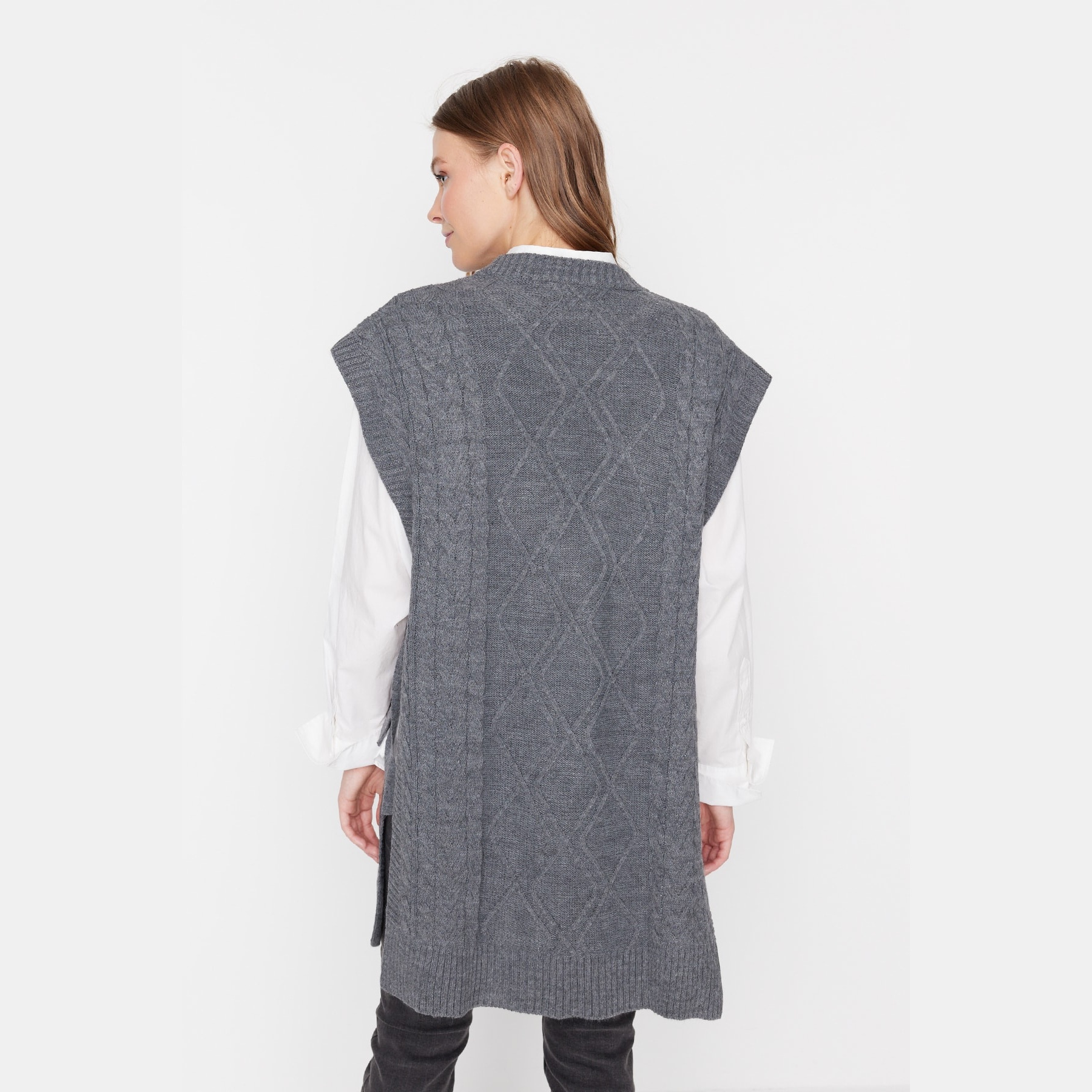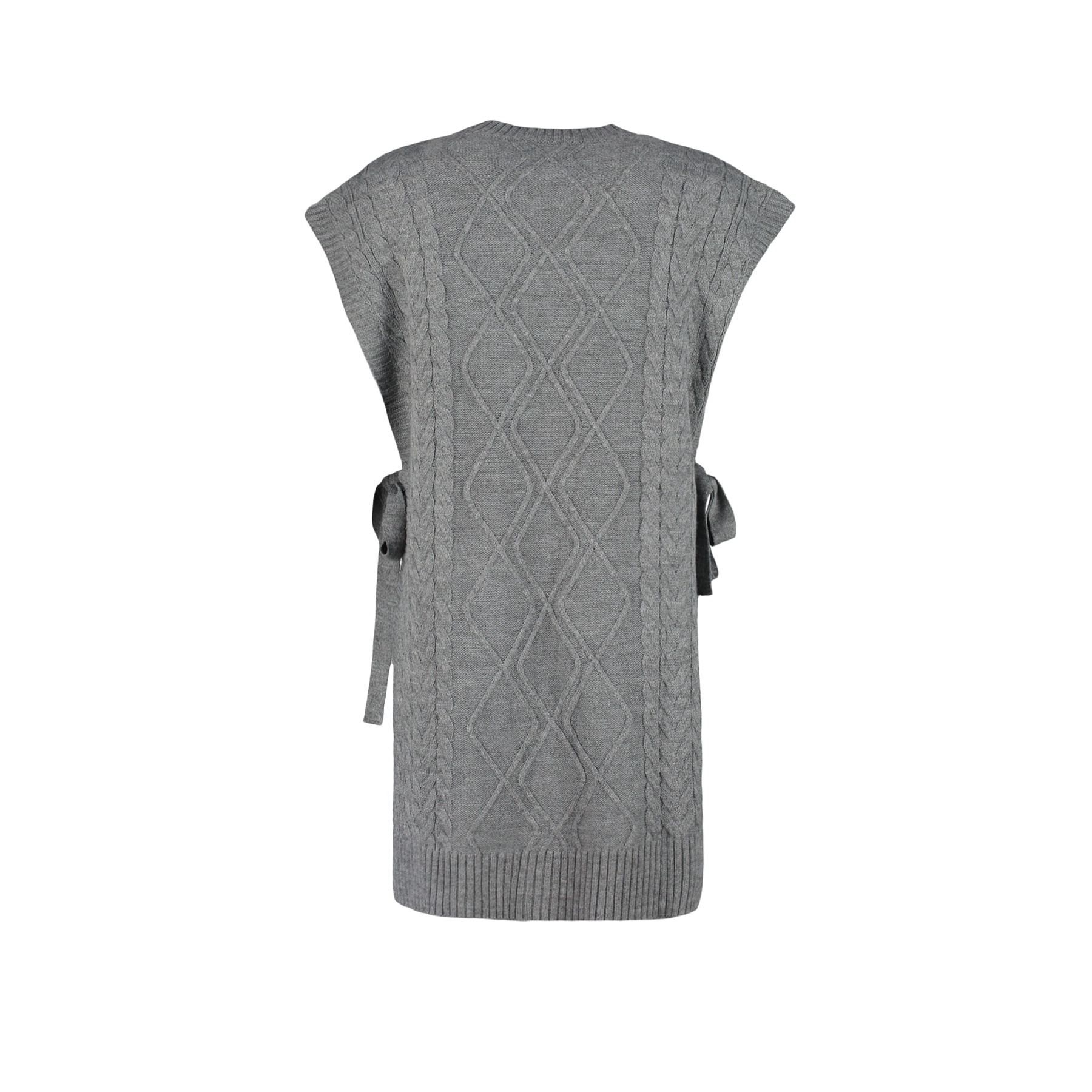 سُويڤتر نسائي بلون أنثراسايت، مصنوع من خامة تريكو ناعمة بتركيبة أكرليك، يتميز بقصة Relaxed مريحة، وياقة دائرية بسيطة، مع حياكة بارزة بأسلوب "سلكة الشعر" تضيف لمسة كلاسيكية، وربطة جانبية قابلة للتعديل تمنح تحكمًا في الشكل. تصميم بدون أكمام مثالي للإطلالات اليومية المحتشمة في المواسم الانتقالية.