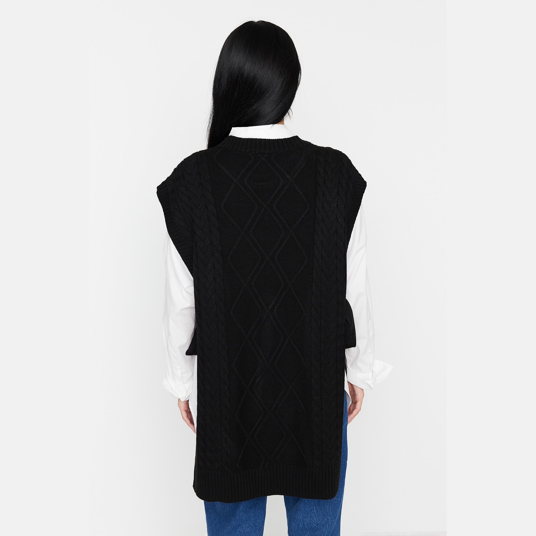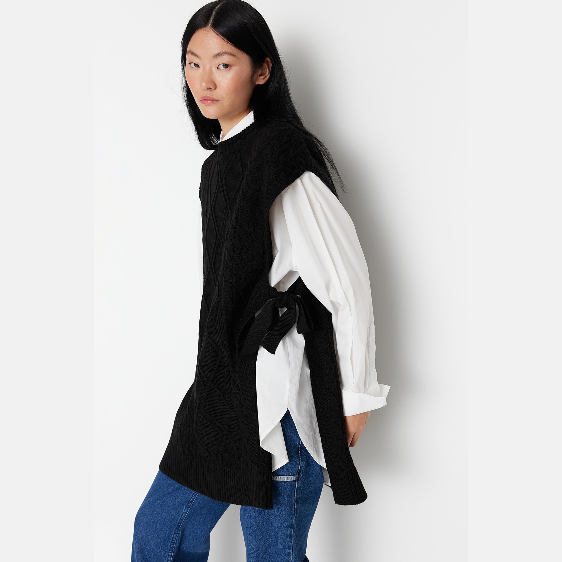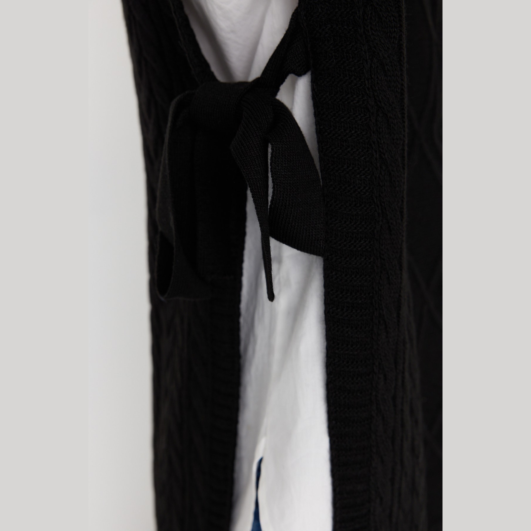 سُويڤتر نسائي بلون أسود، مصنوع من خامة تريكو ناعمة بتركيبة أكرليك، يتميز بقصة Relaxed مريحة، وياقة دائرية بسيطة، مع حياكة بارزة بأسلوب "سلكة الشعر" تضيف لمسة كلاسيكية، وربطة جانبية قابلة للتعديل تمنح تحكمًا في الشكل. تصميم بدون أكمام مثالي للإطلالات اليومية المحتشمة في المواسم الانتقالية.