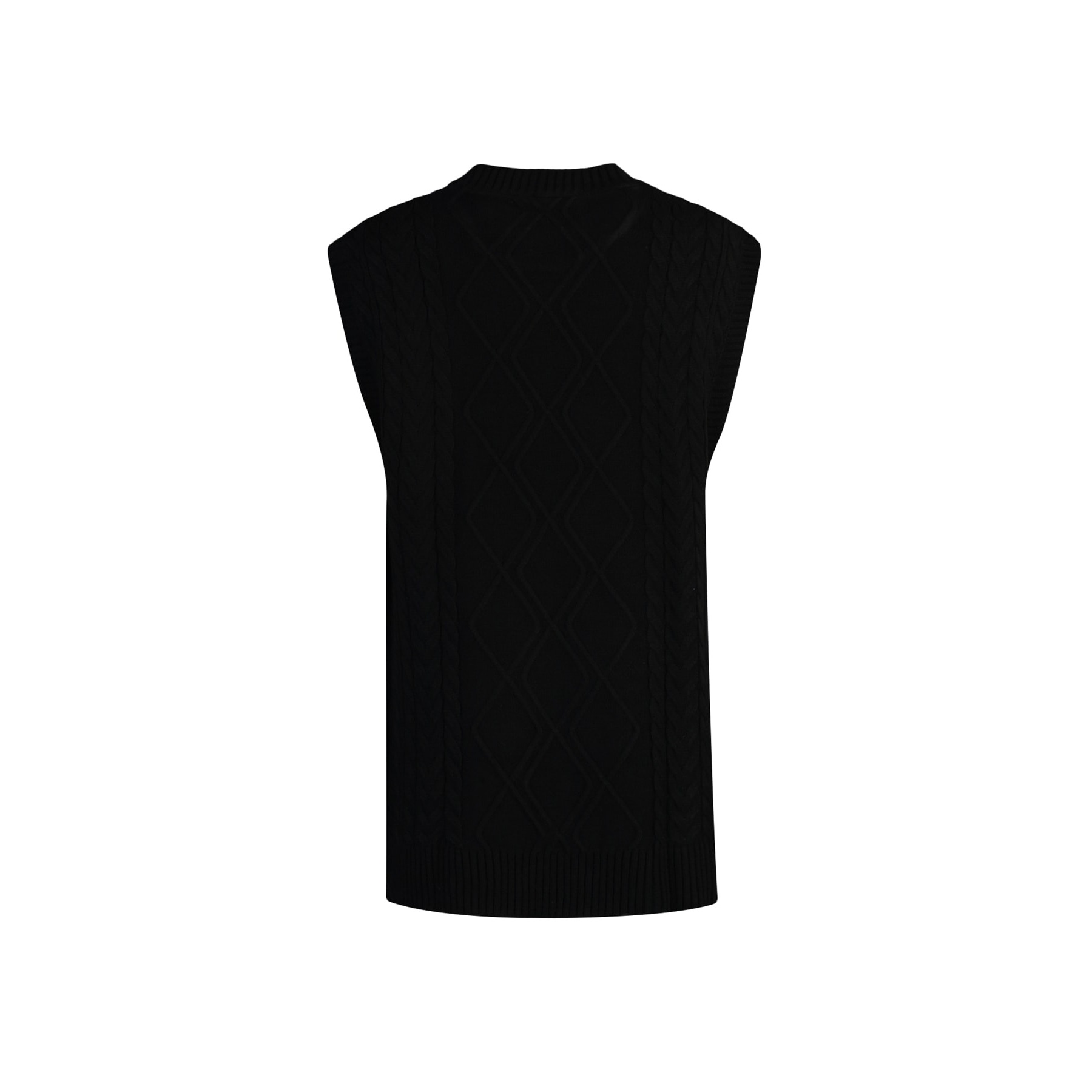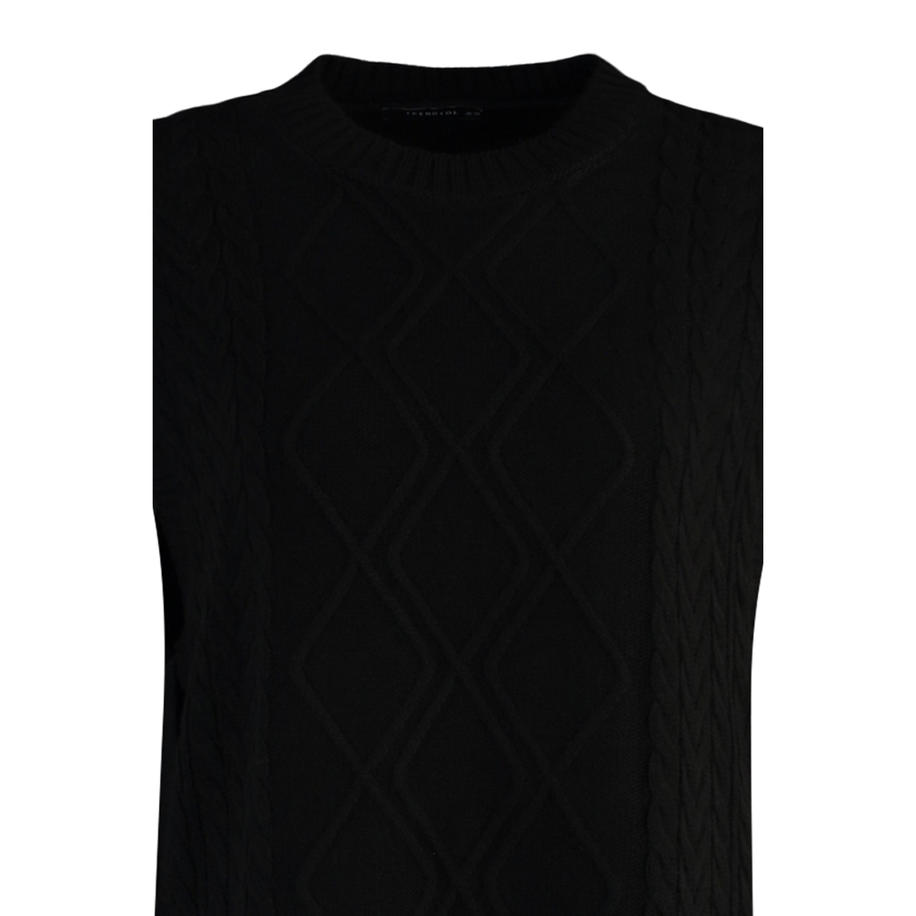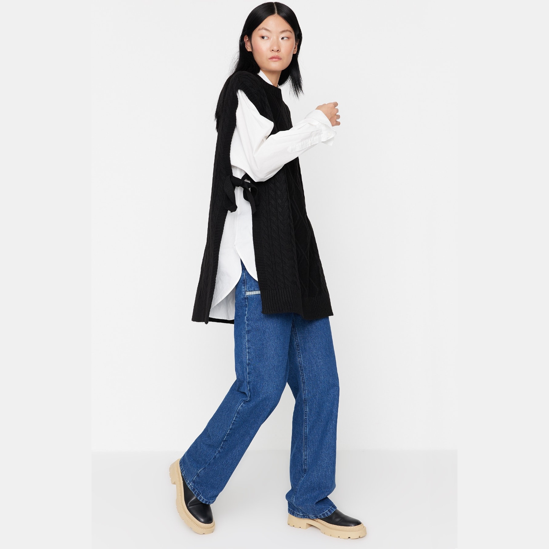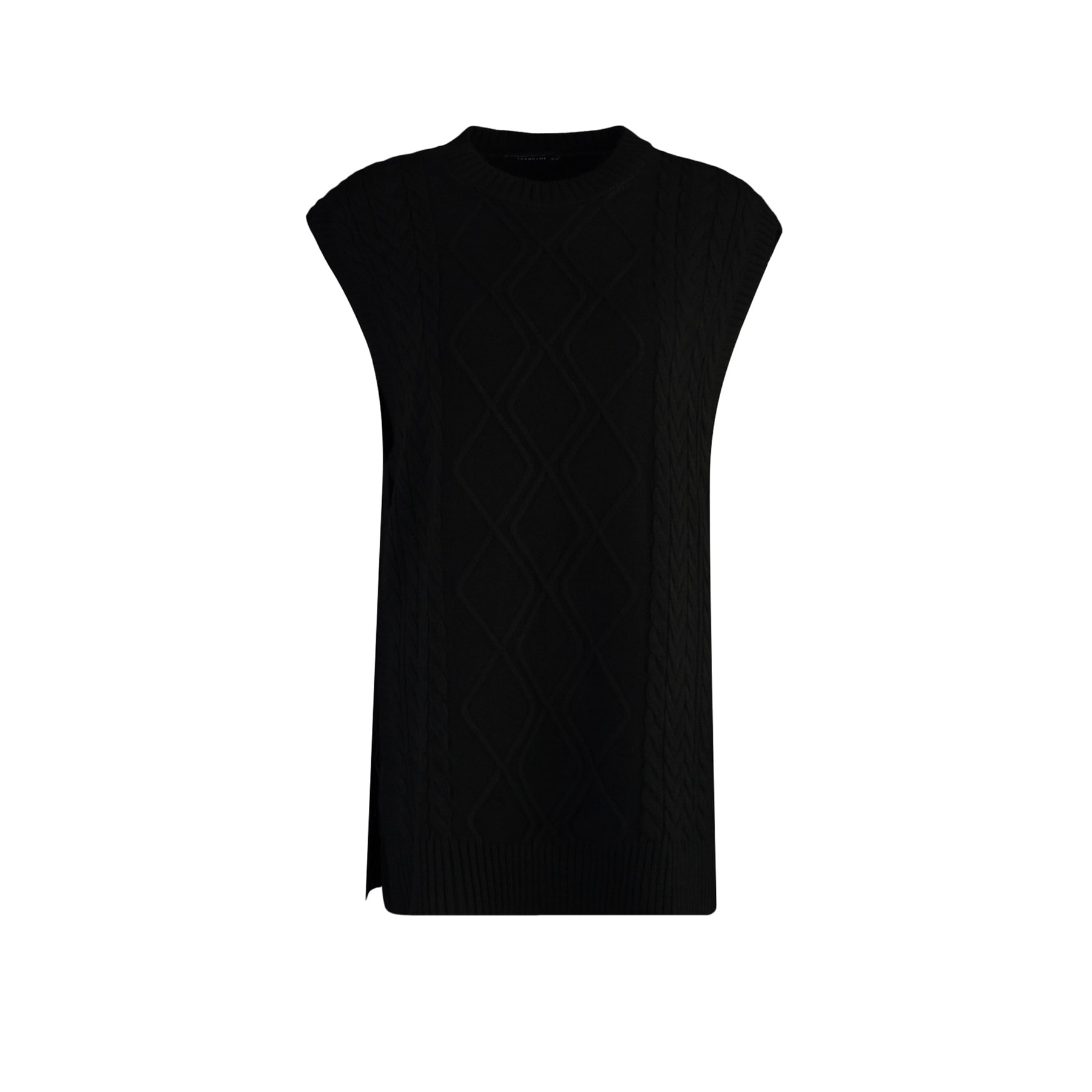 سُويڤتر نسائي بلون أسود، مصنوع من خامة تريكو ناعمة بتركيبة أكرليك، يتميز بقصة Relaxed مريحة، وياقة دائرية بسيطة، مع حياكة بارزة بأسلوب "سلكة الشعر" تضيف لمسة كلاسيكية، وربطة جانبية قابلة للتعديل تمنح تحكمًا في الشكل. تصميم بدون أكمام مثالي للإطلالات اليومية المحتشمة في المواسم الانتقالية.