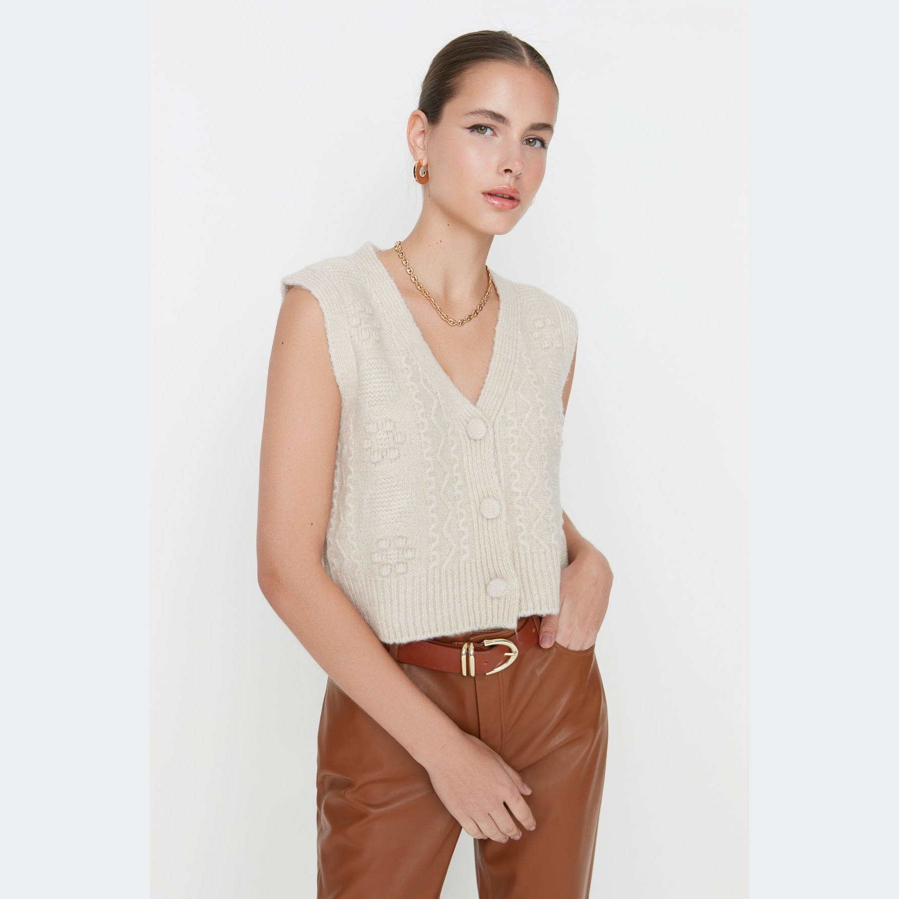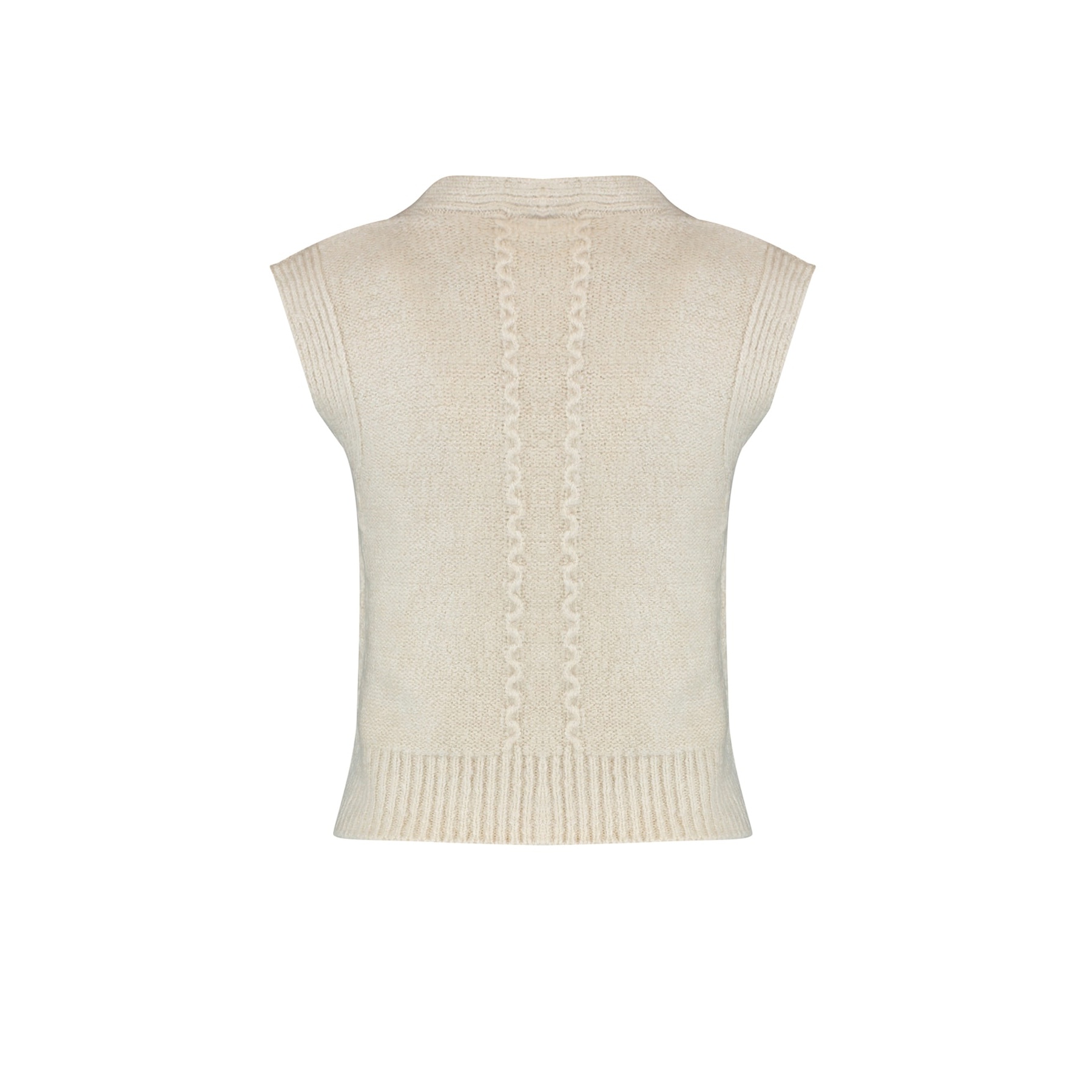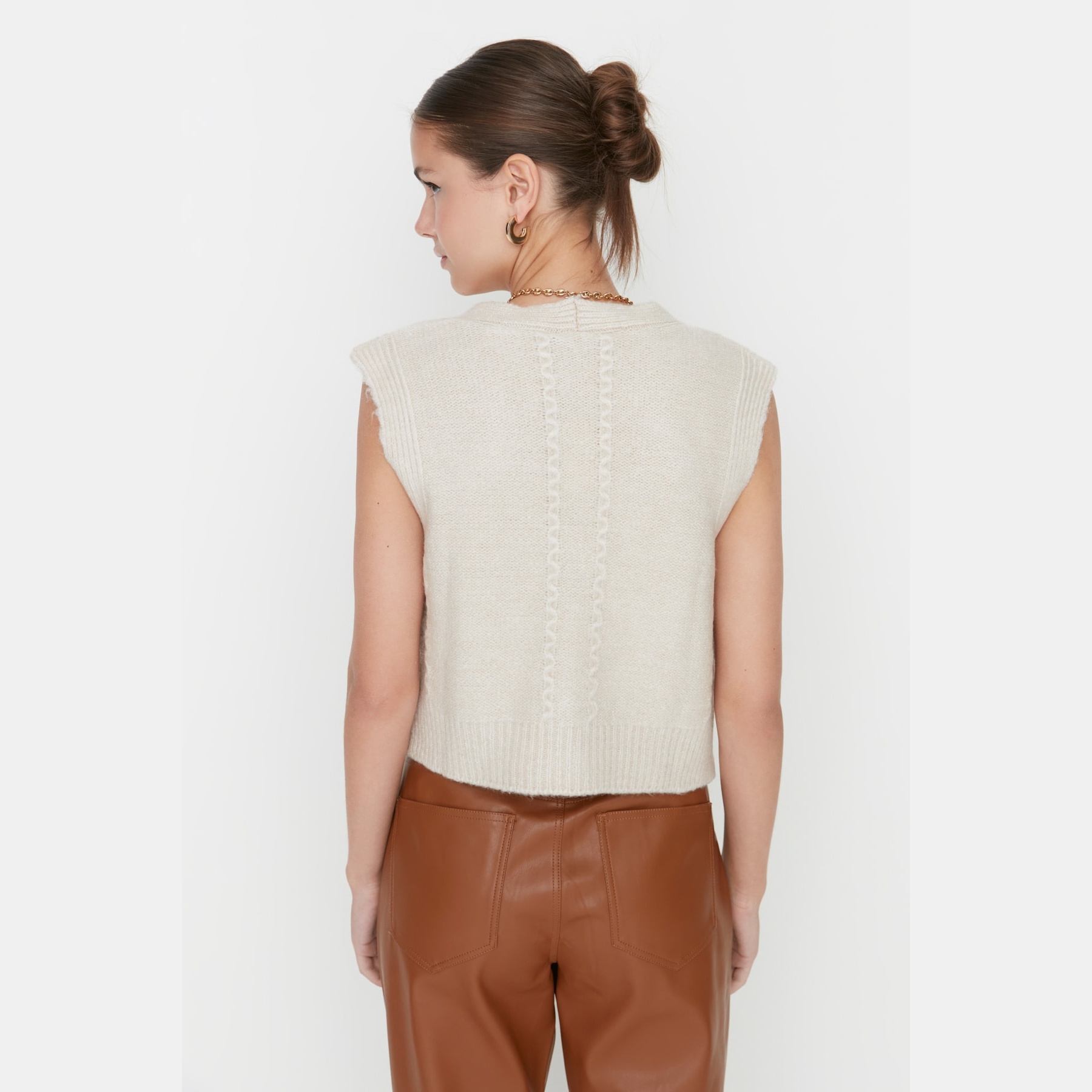 سُويڤتر نسائي بلون بيج، مصنوع من خامة تريكو ناعمة بتركيبة أكرليك وبوليستر، يتميز بقصة Regular مريحة، وياقة V أنثوية، مع تصميم بدون أكمام يمنح حرية في التنسيق. خيار مثالي للإطلالات اليومية في فصلي الخريف والربيع.