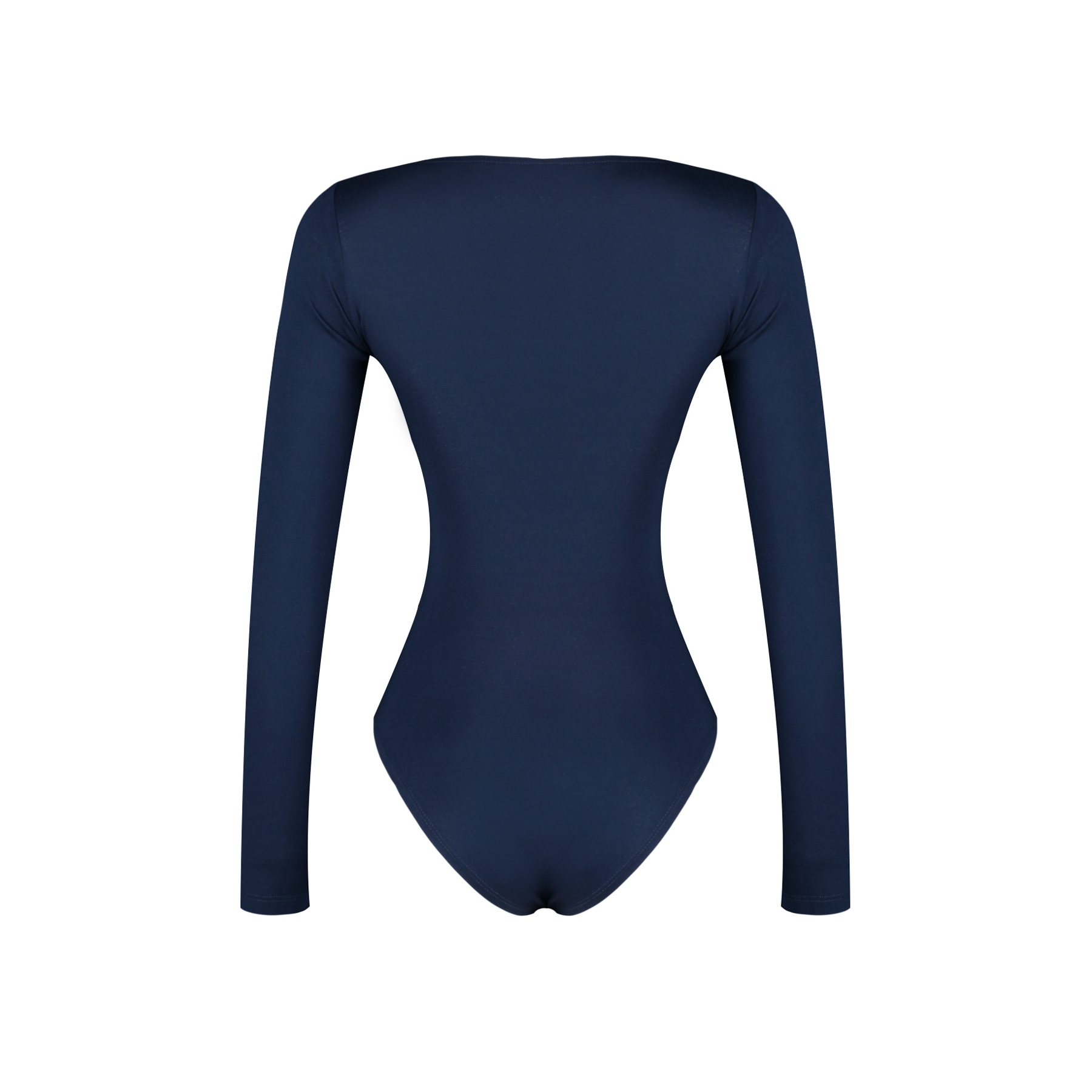 بودي نسائي بلون كحلي، مصنوع من خامة بريميوم تريكو مطاطية بتركيبة فسكوز وإيلاستان، يتميز بياقة مربعة تضيف لمسة هندسية أنيقة، مع قصة Fitted تبرز القوام، وأكمام طويلة، وإغلاق سفلي بصَفّاطات عملية. تصميم مثالي للإطلالات اليومية المحتشمة.