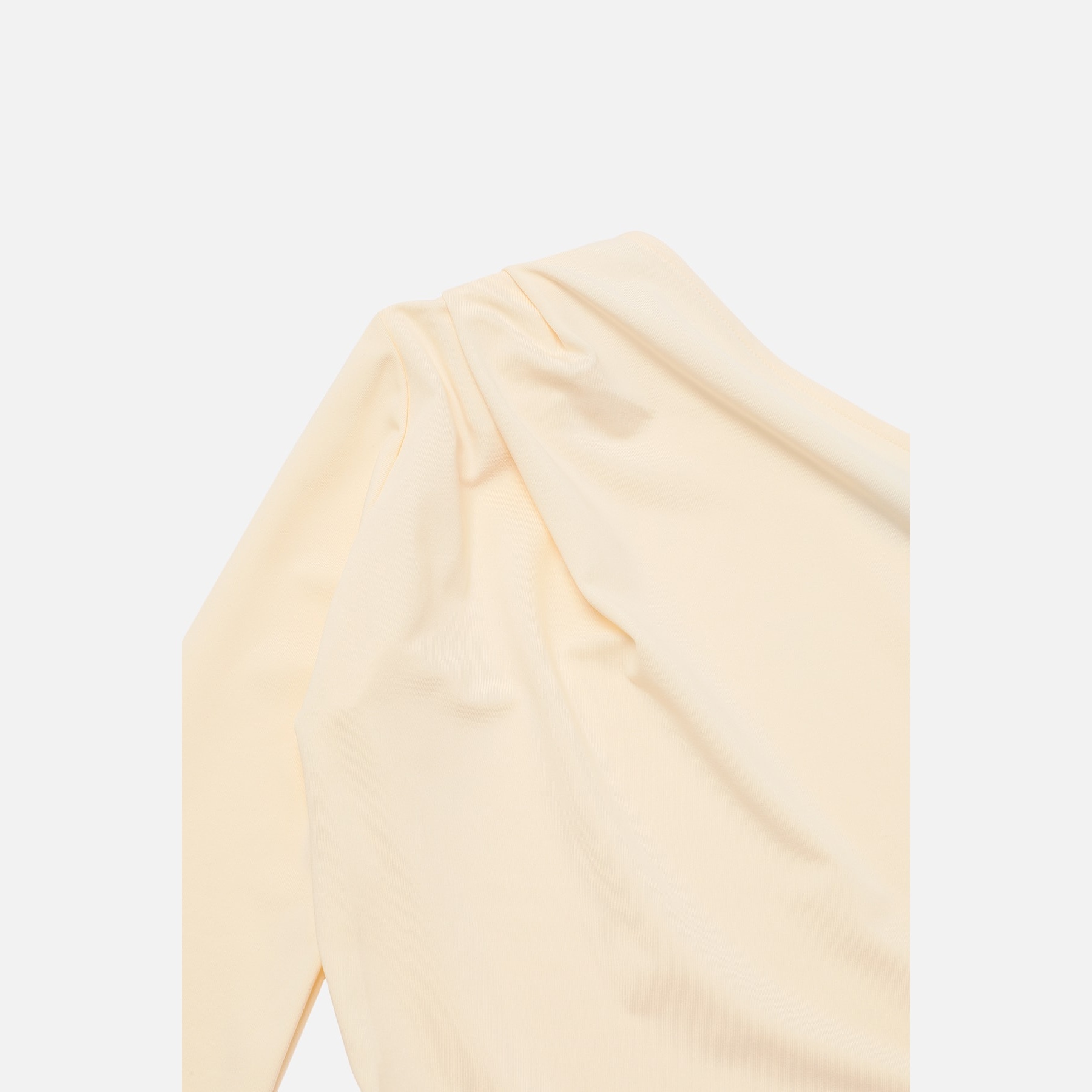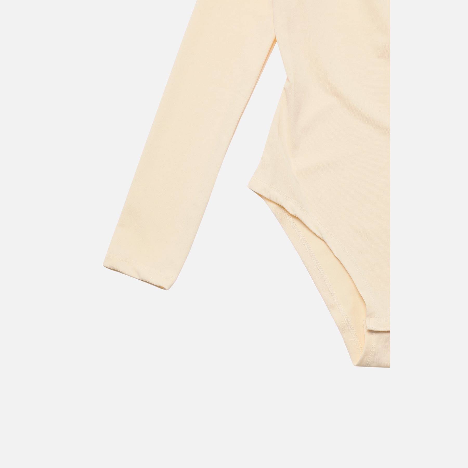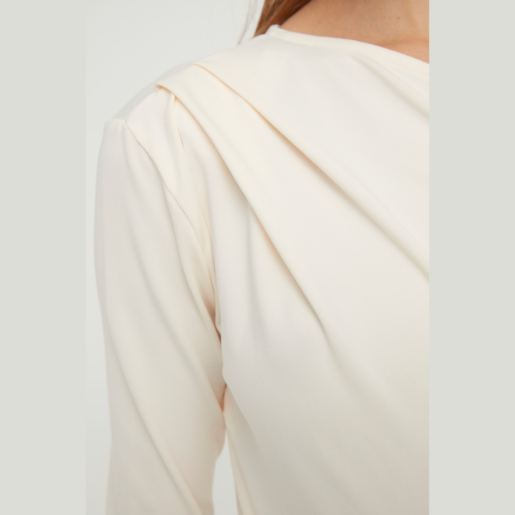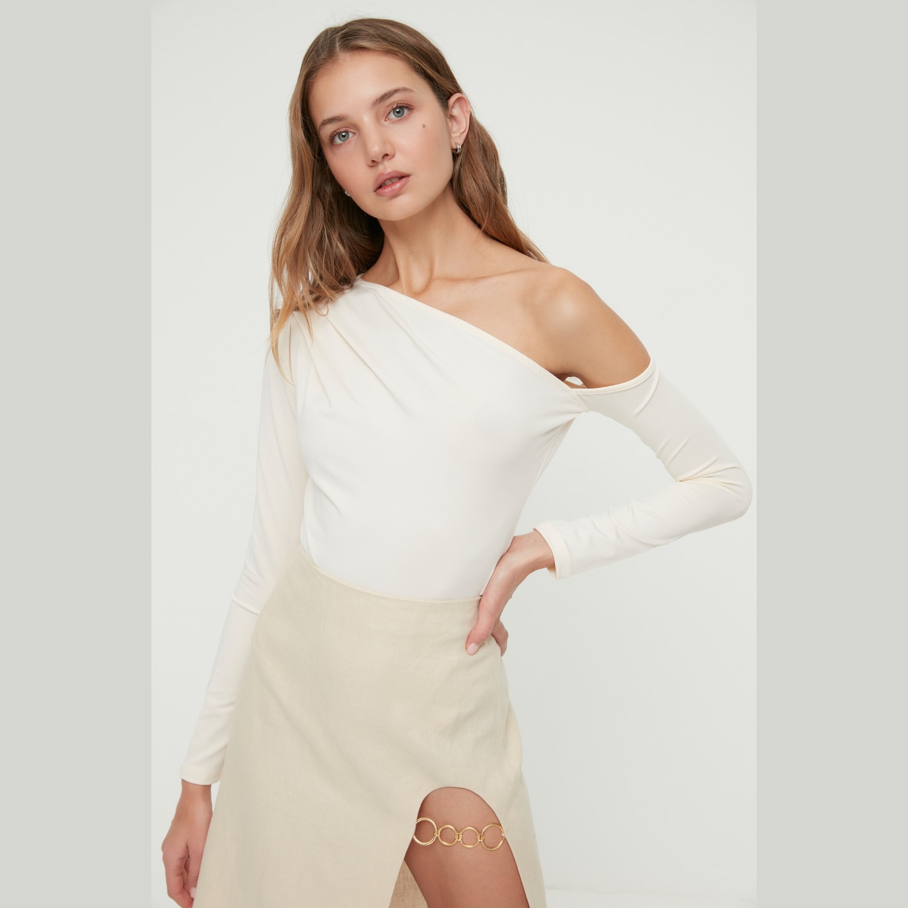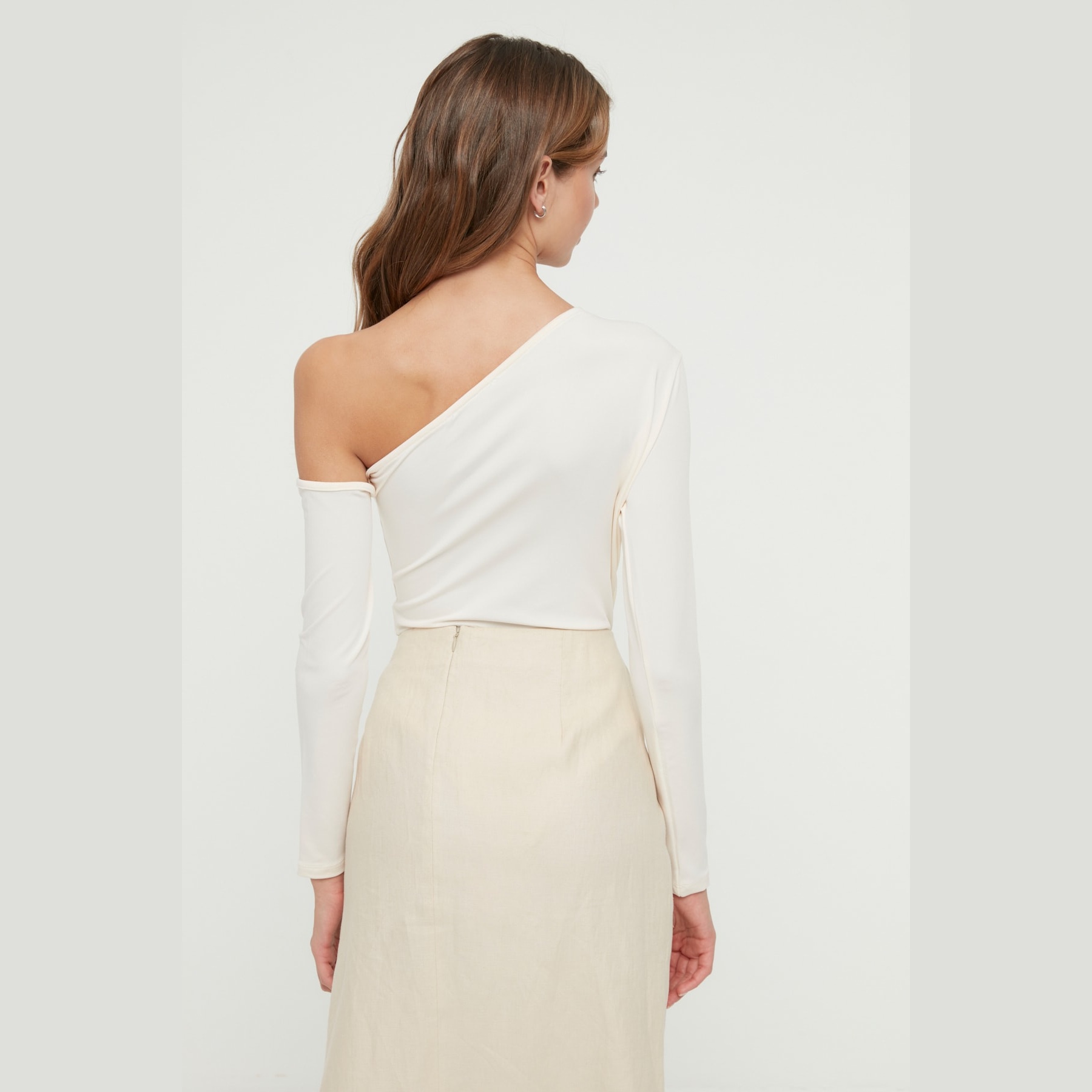 بودي نسائي بلون إكرو، مصنوع من خامة تريكو مطاطية بتركيبة بوليستر وإيلاستان، يتميز بياقة غير متناظرة تضيف لمسة عصرية، مع قصة Fitted تبرز القوام، وأكمام طويلة، وإغلاق سفلي بصَفّاطات عملية. تصميم مثالي للإطلالات اليومية والمسائية المحتشمة.