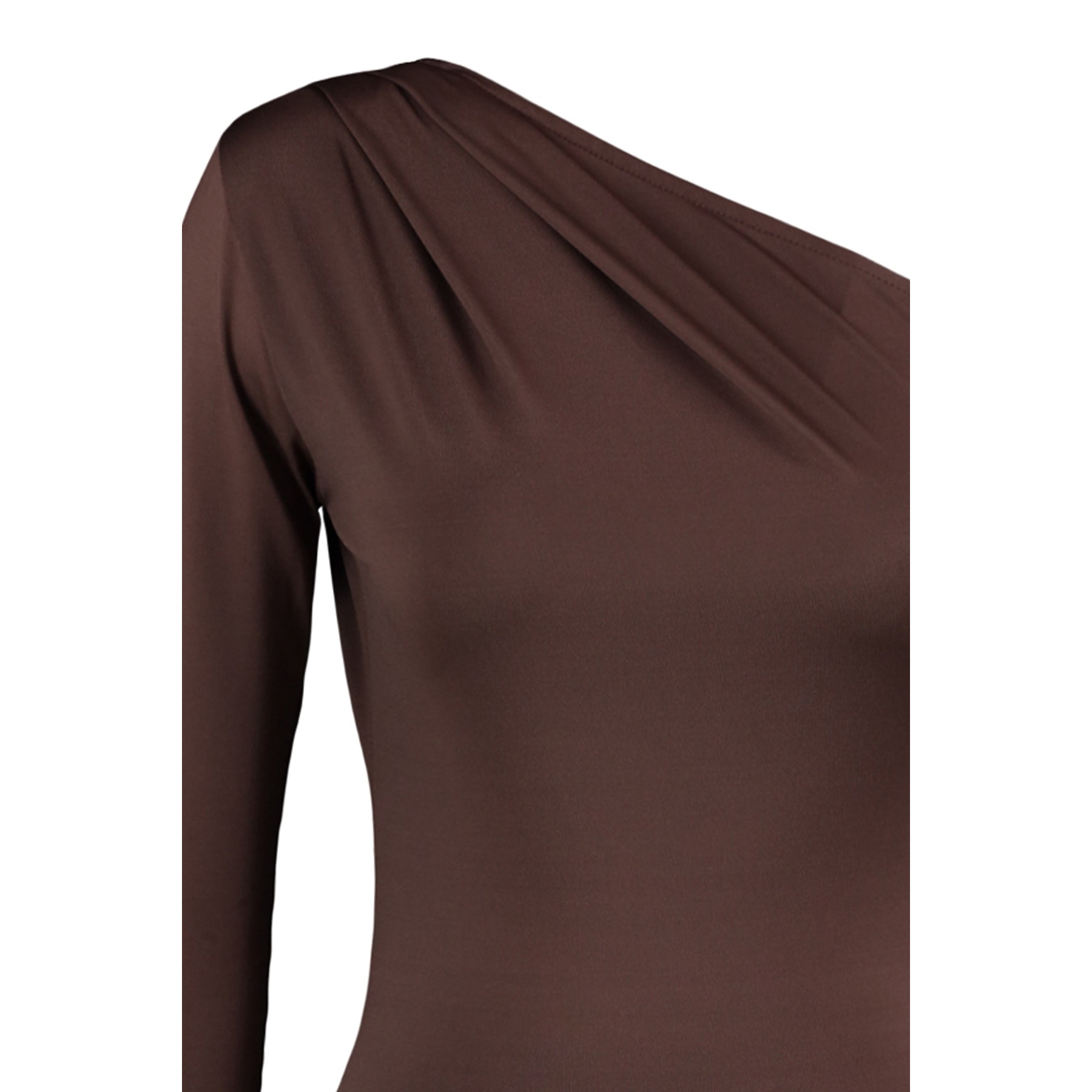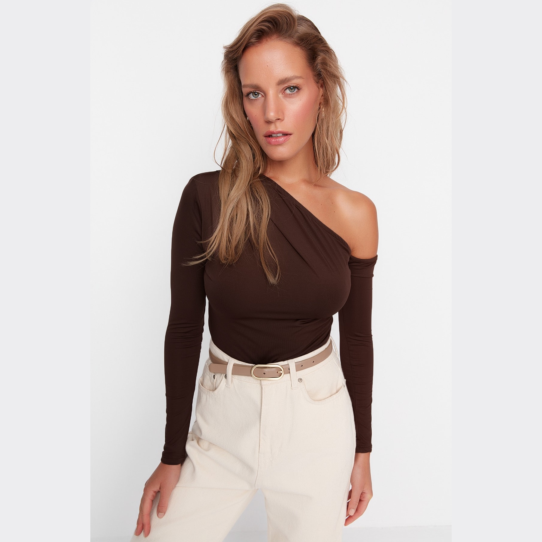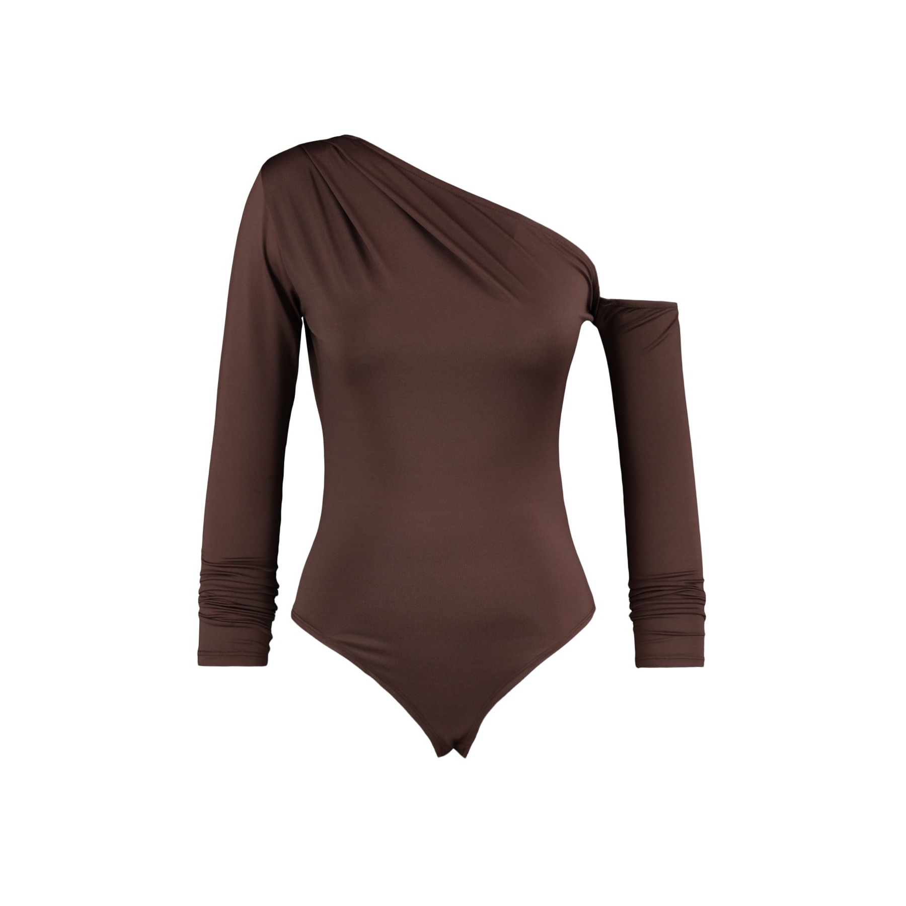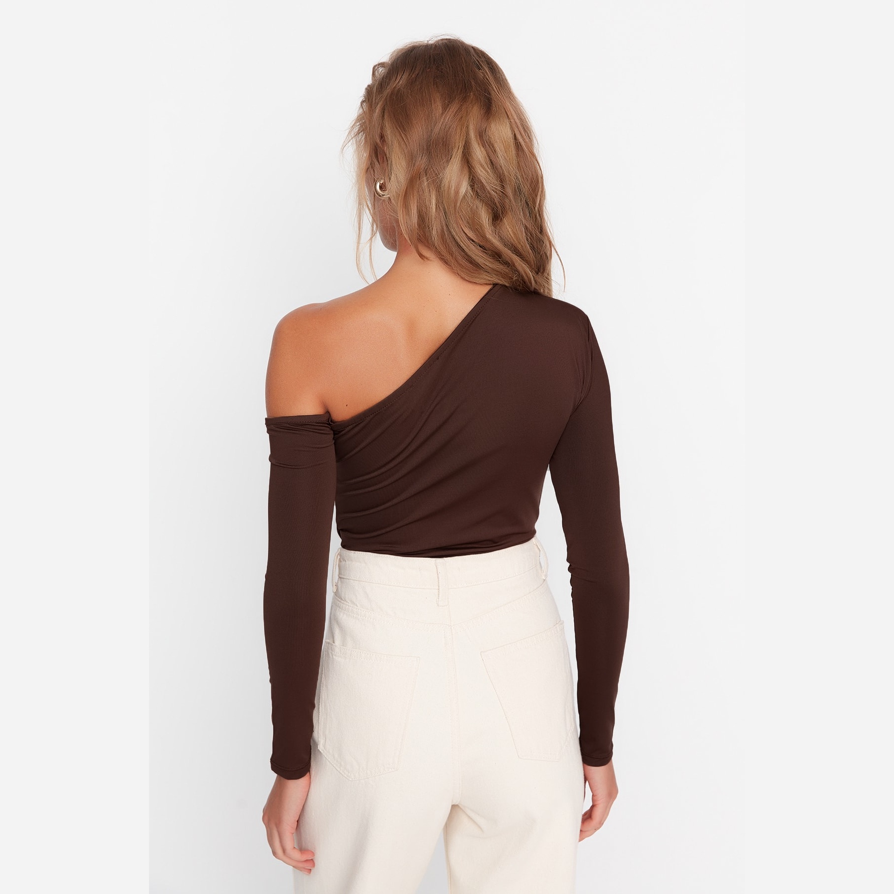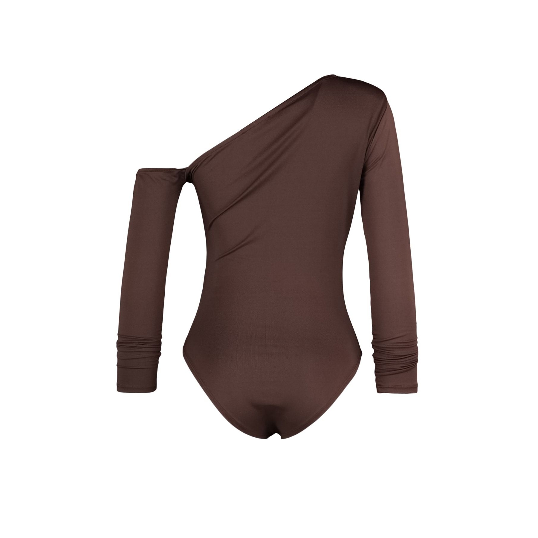 بودي نسائي بلون بني، مصنوع من خامة تريكو مطاطية بتركيبة بوليستر وإيلاستان، يتميز بياقة غير متناظرة تضيف لمسة عصرية، مع قصة Fitted تبرز القوام، وأكمام طويلة، وإغلاق سفلي بصَفّاطات عملية. تصميم مثالي للإطلالات اليومية والمسائية المحتشمة.