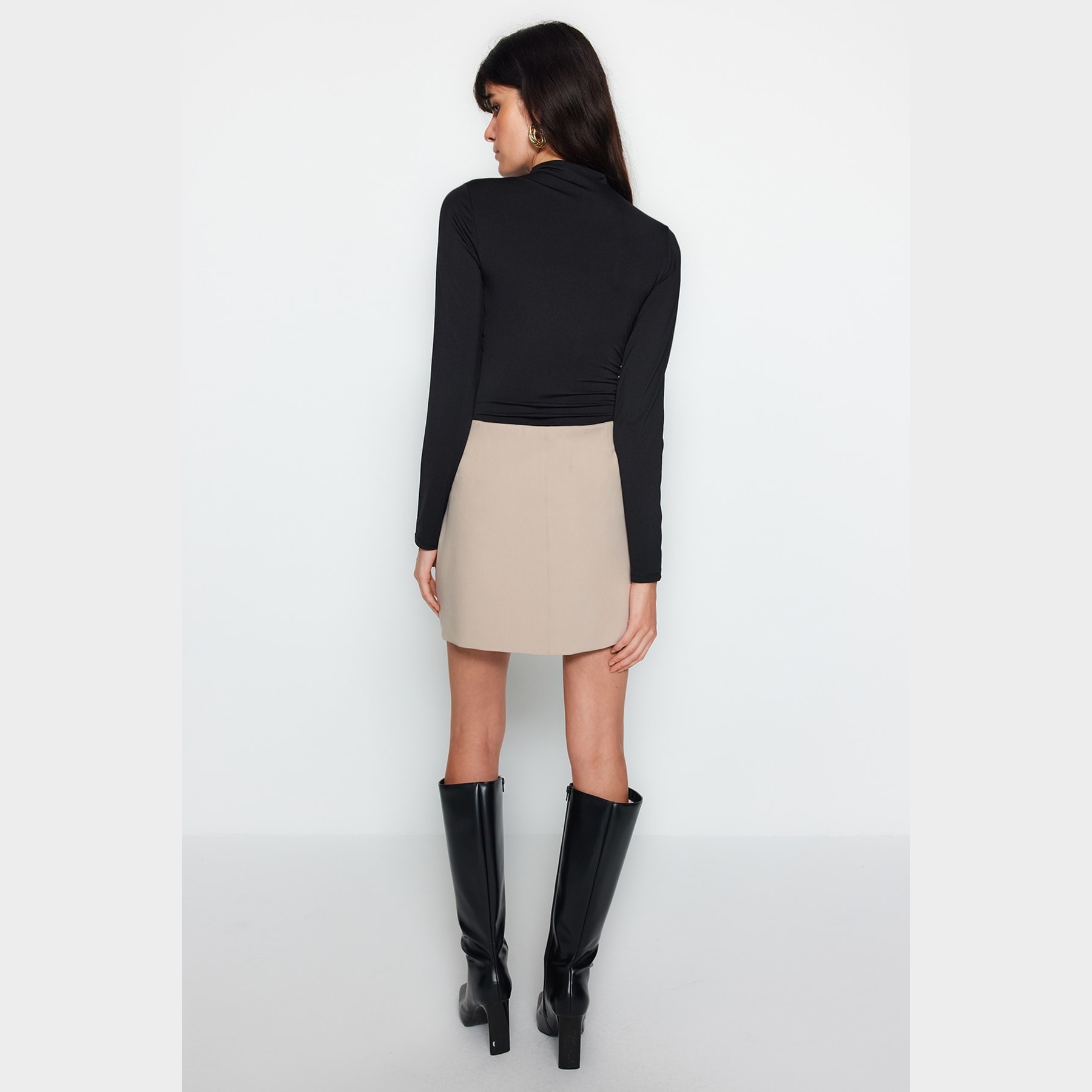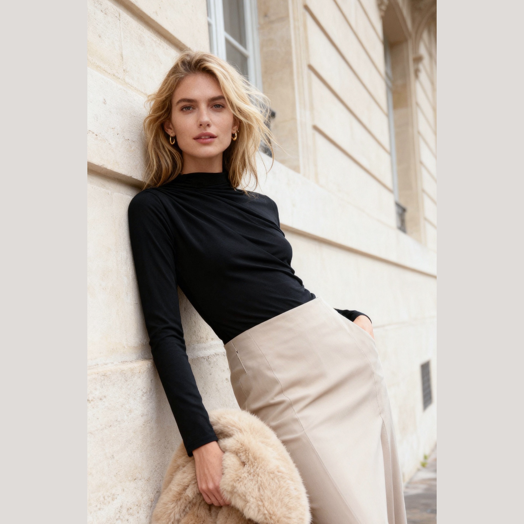 بودي نسائي بلون أسود، مصنوع من خامة تريكو مطاطية بتركيبة بوليستر وإيلاستان، يتميز بياقة عالية تضيف طابعًا رسميًا، مع تفصيل بُزُوغ أمامي أنيق، وقصة Fitted تبرز القوام، وإغلاق سفلي بصَفّاطات عملية. تصميم مثالي للإطلالات اليومية أو المسائية المحتشمة.