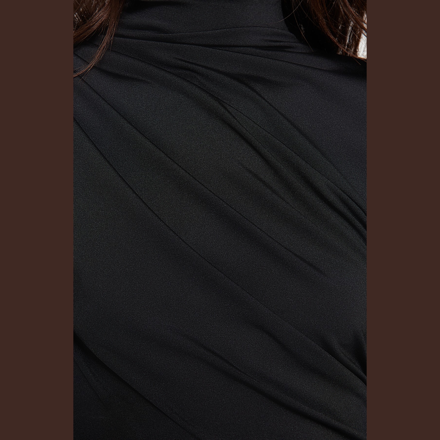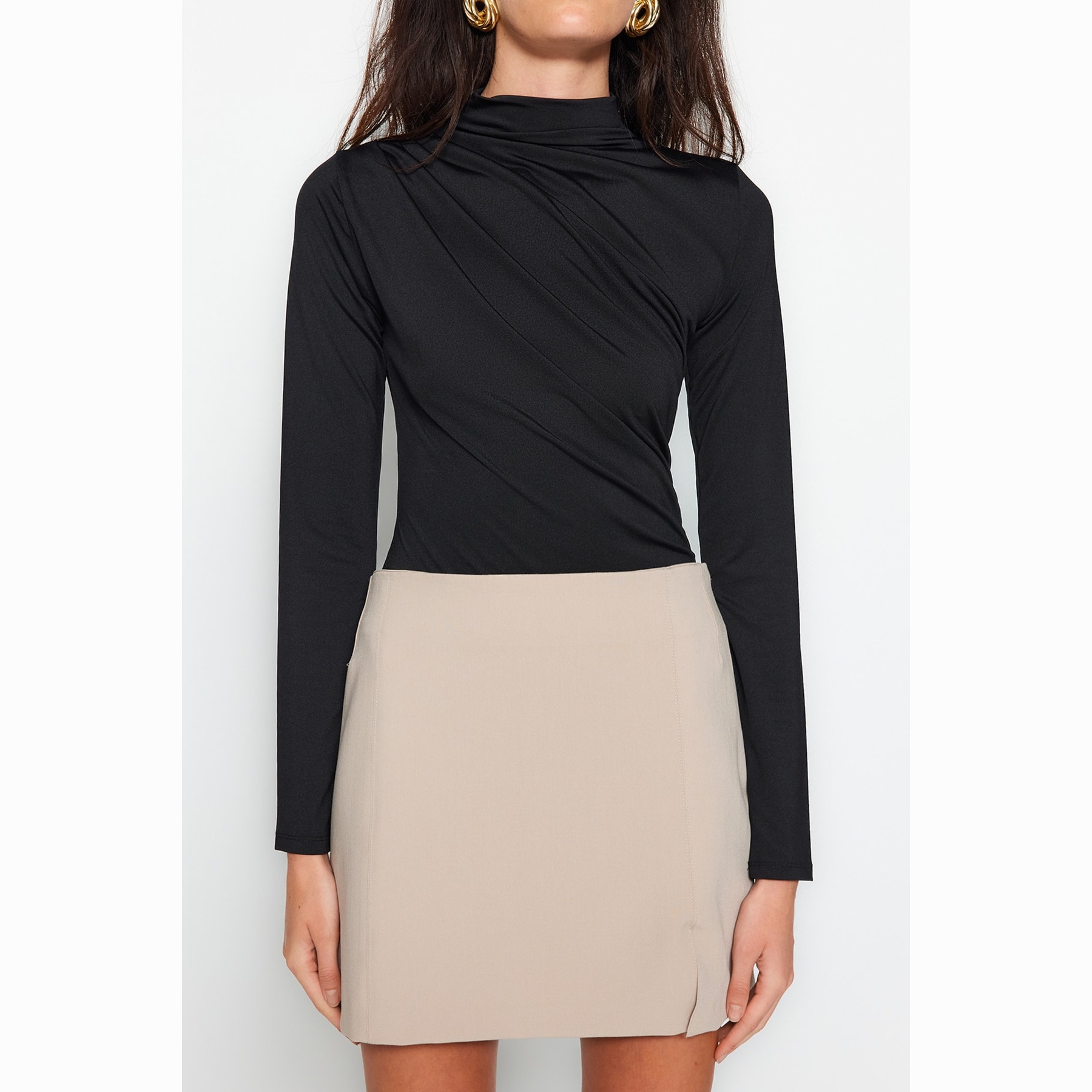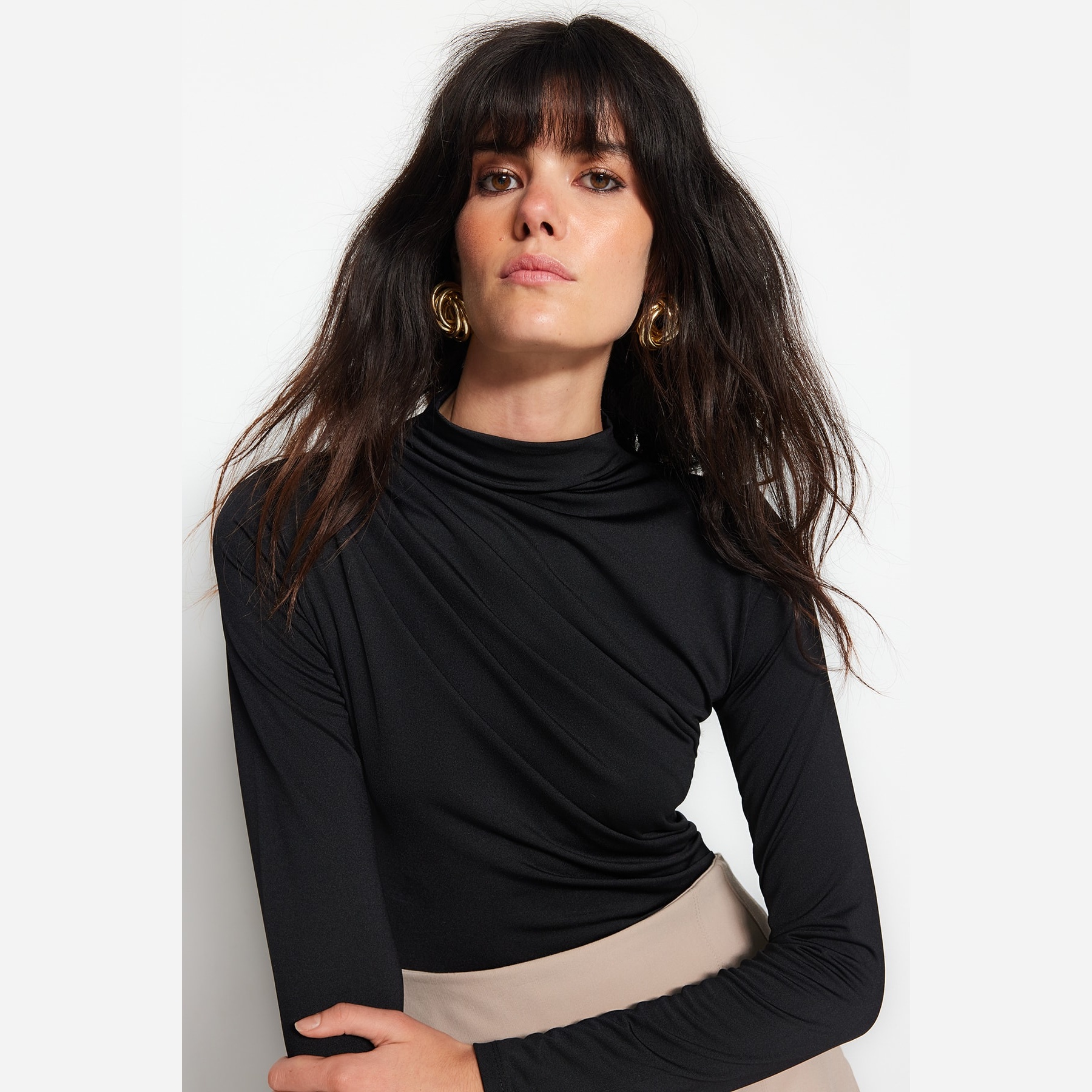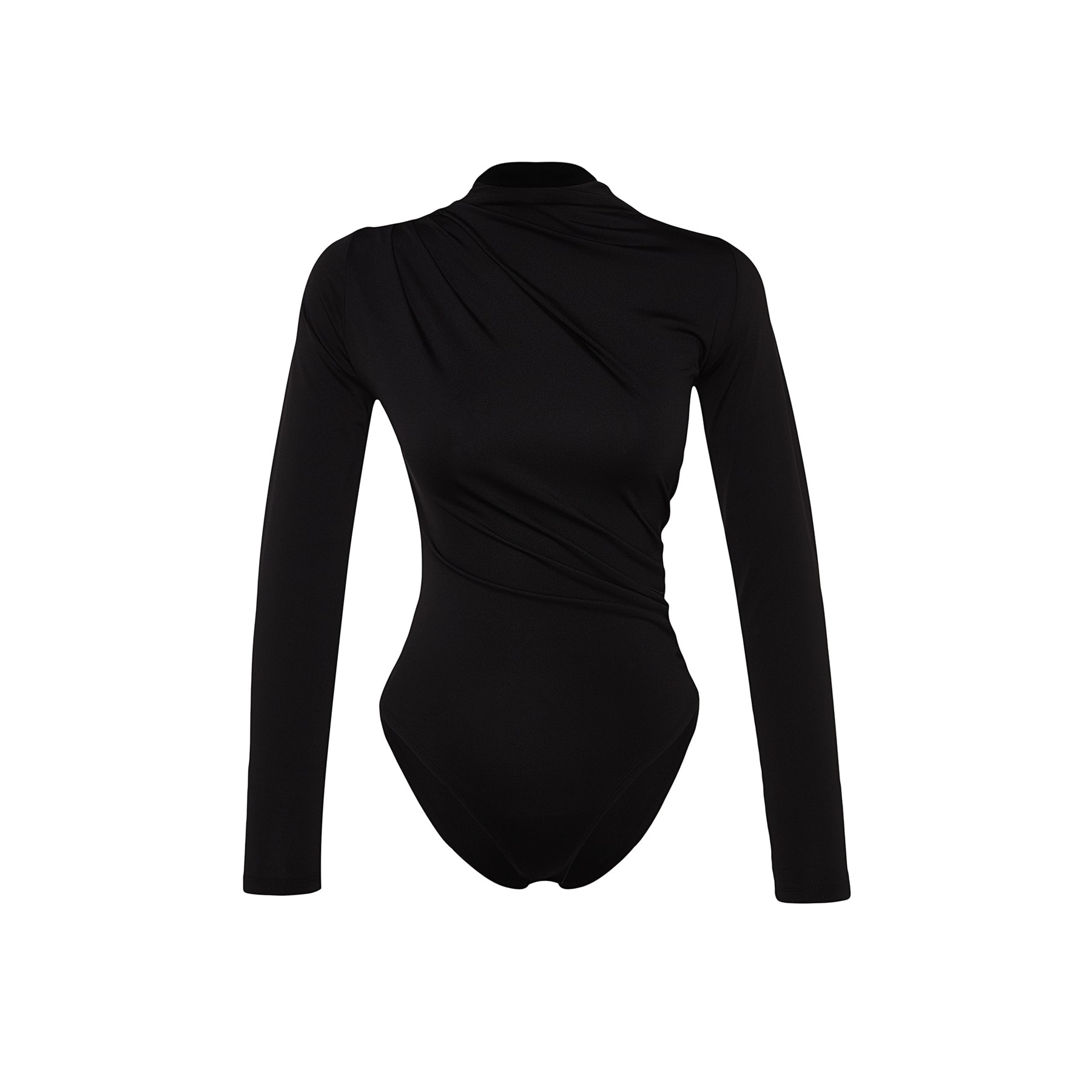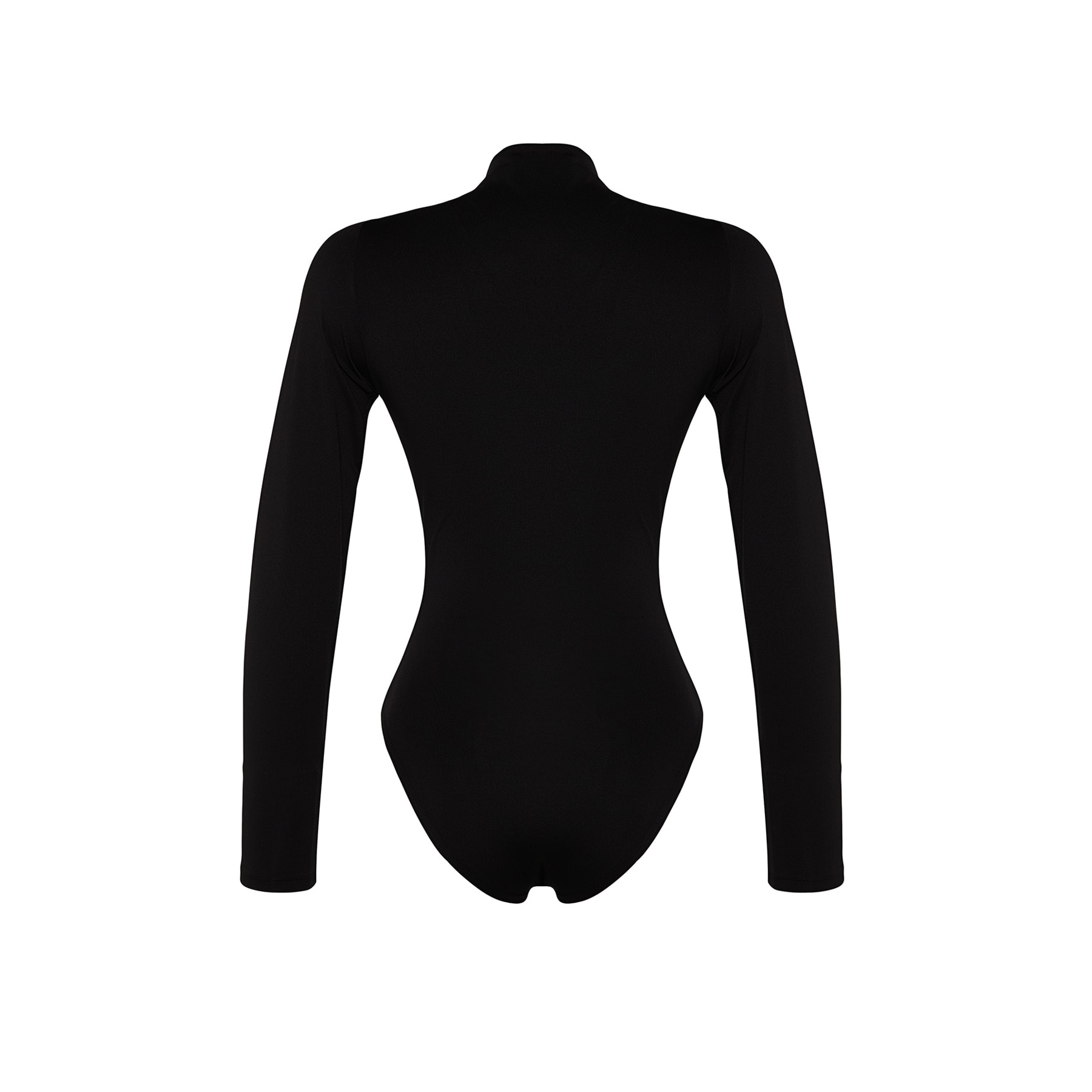 بودي نسائي – أسود بياقة عالية وبُزُوغ أمامي (تصميم أنيق بخامة مطاطية مريحة)