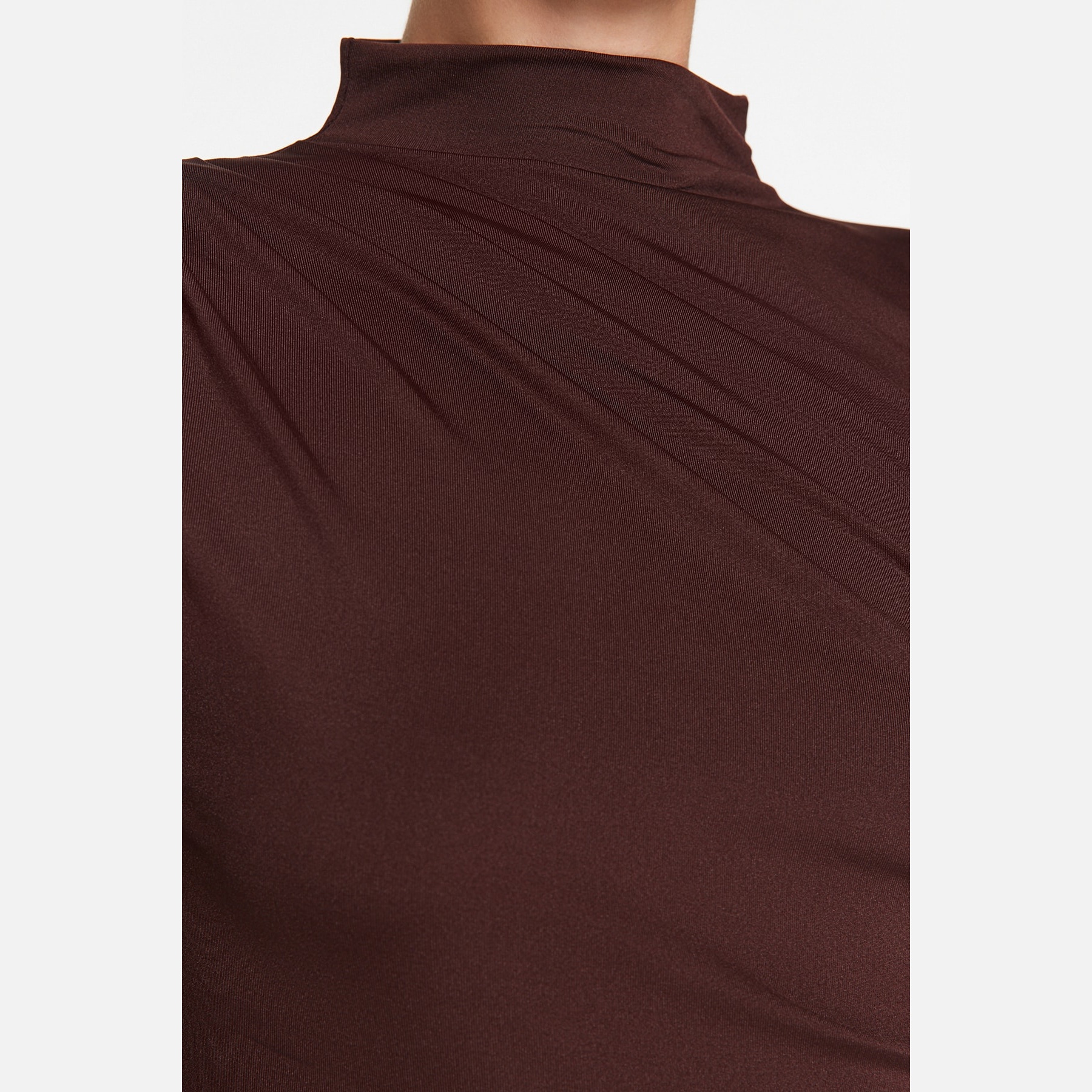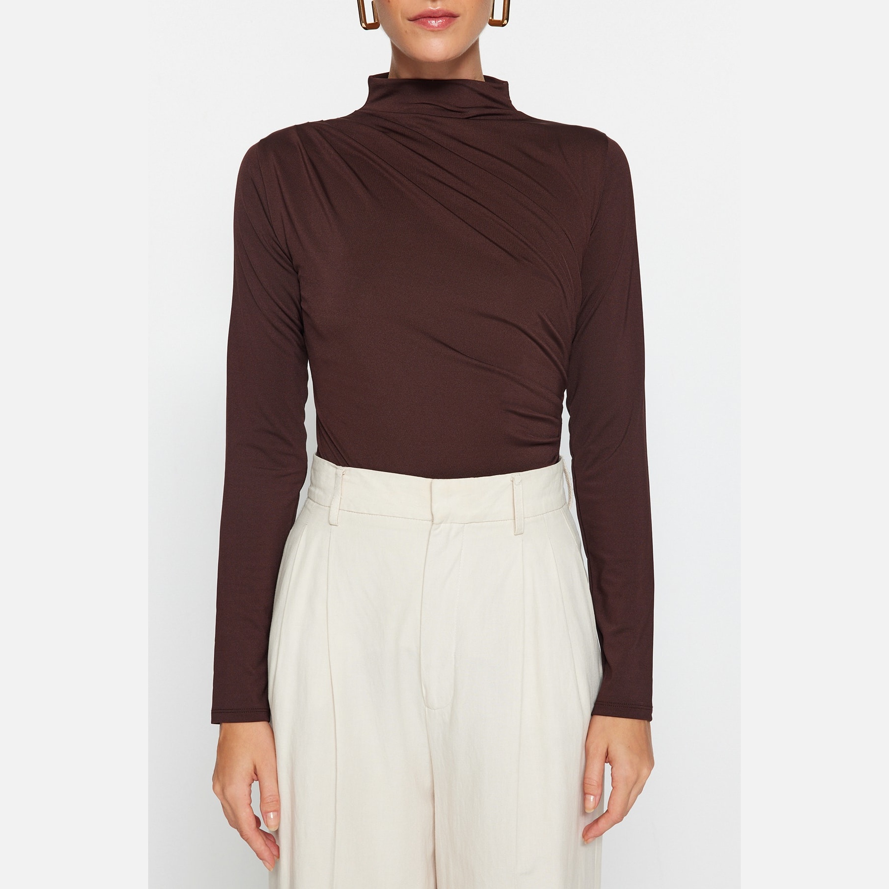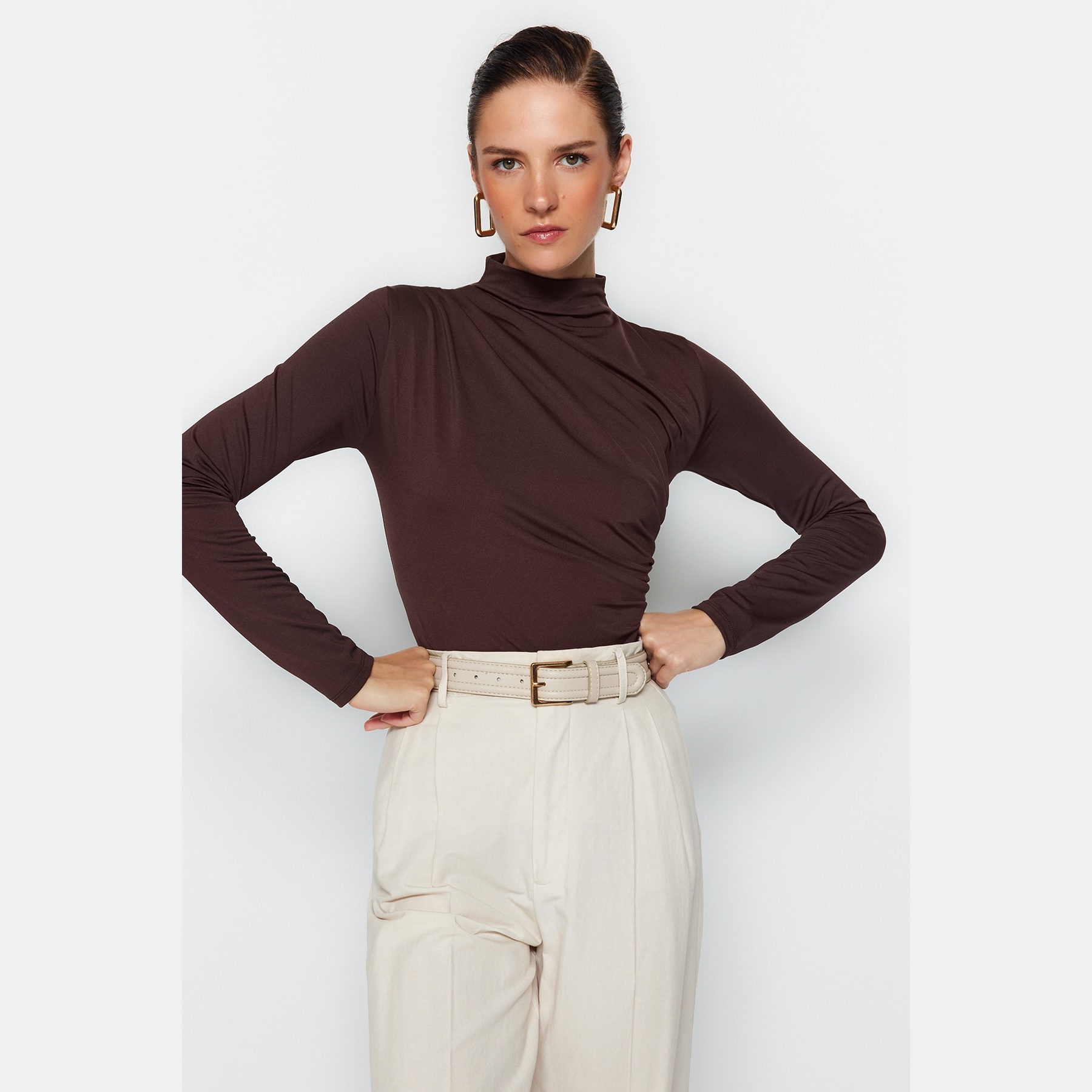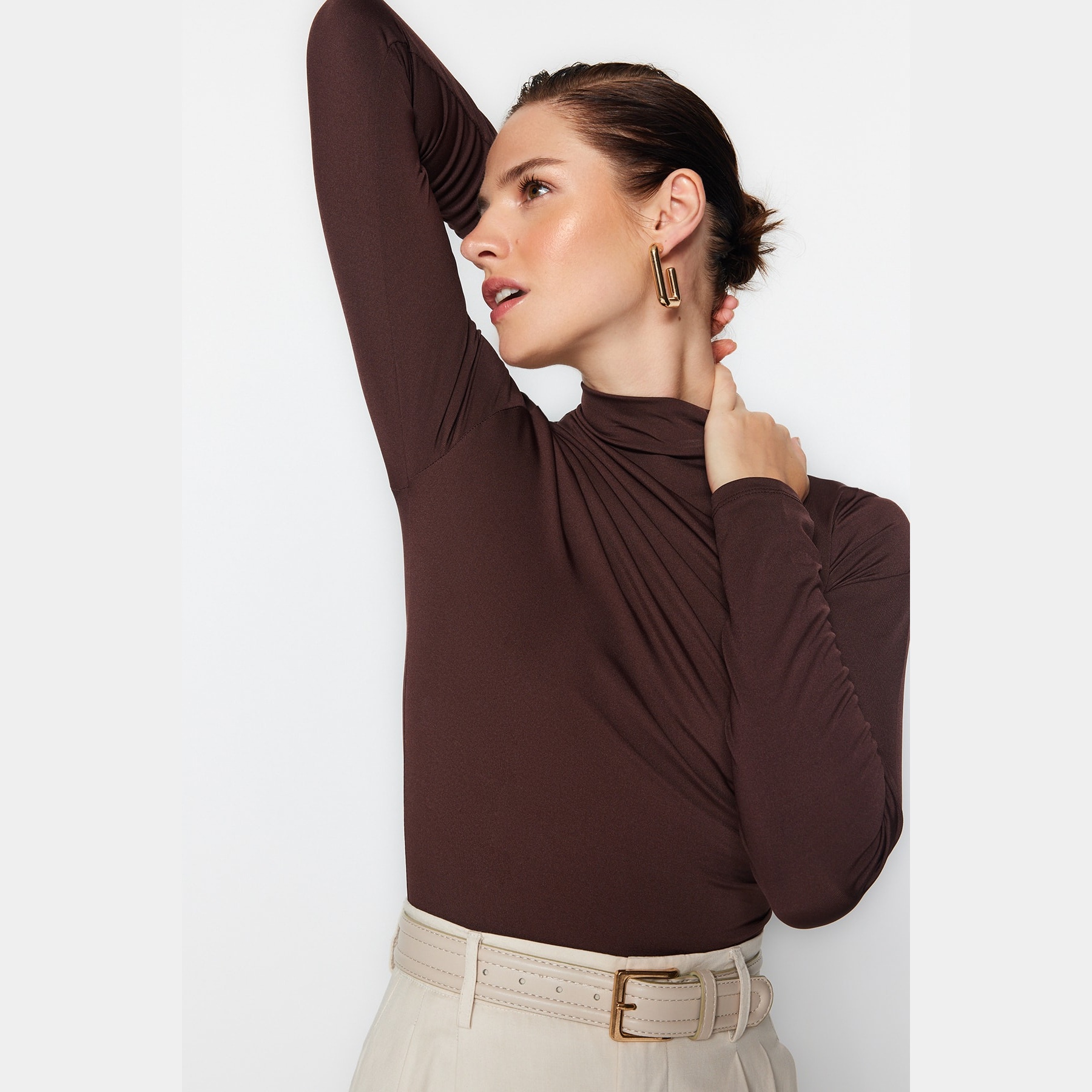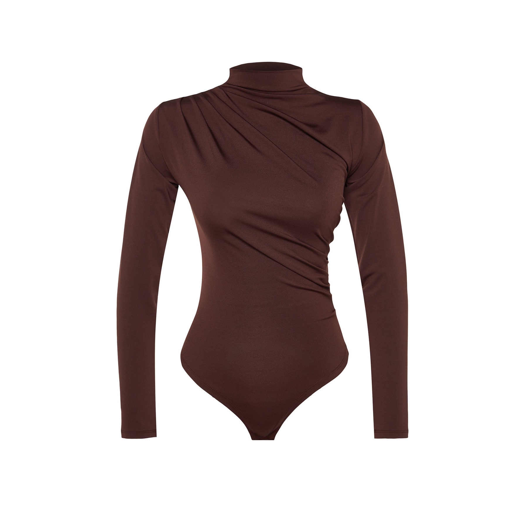 بودي نسائي بلون بني، مصنوع من خامة تريكو مطاطية بتركيبة بوليستر وإيلاستان، يتميز بياقة عالية تضيف طابعًا رسميًا، مع تفصيل بُزُوغ أمامي أنيق، وقصة Fitted تبرز القوام، وإغلاق سفلي بصَفّاطات عملية. تصميم مثالي للإطلالات اليومية أو المسائية المحتشمة.