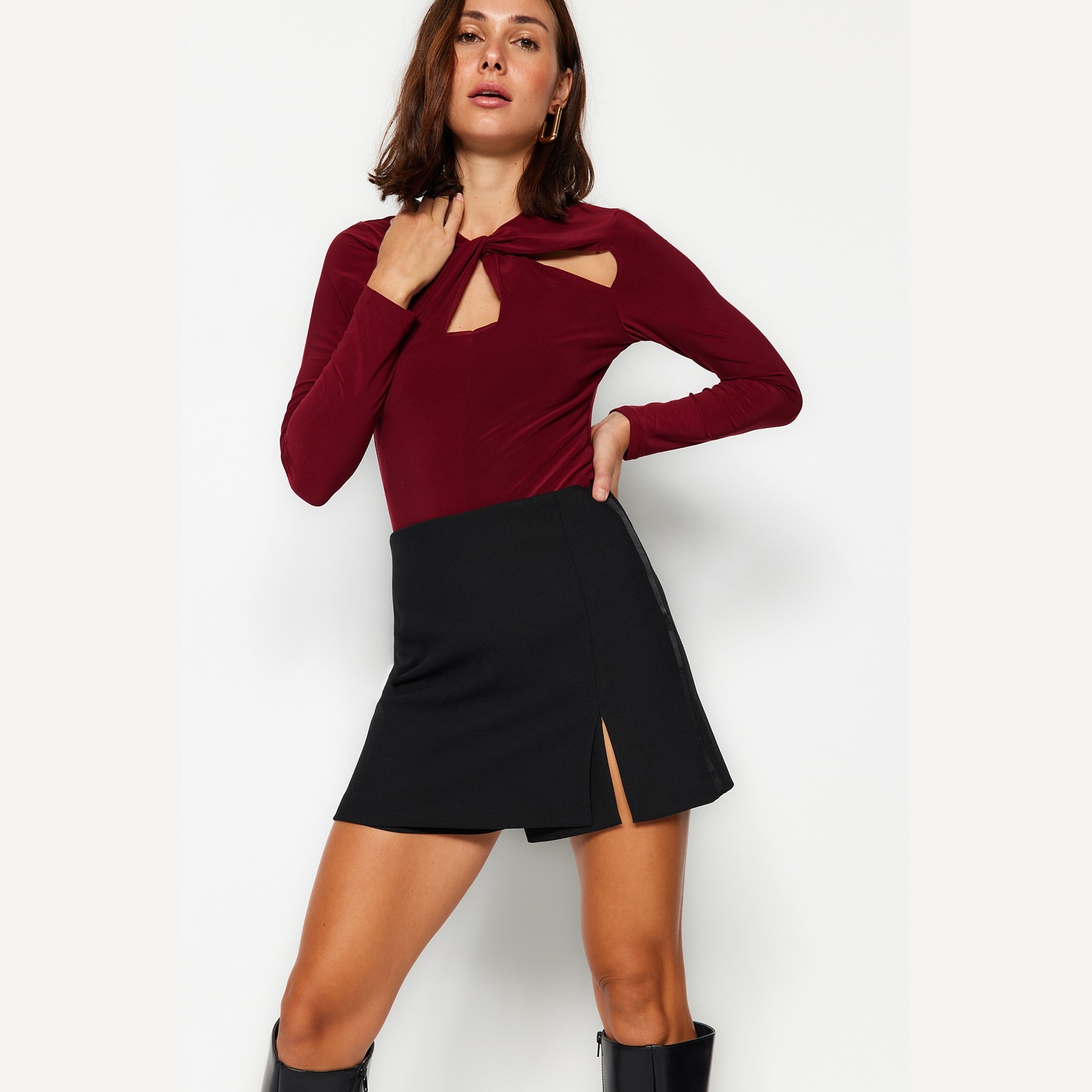 بودي نسائي بلون أسود، مصنوع من خامة تريكو مطاطية بتركيبة بوليستر وإيلاستان، يتميز بياقة عالية أنيقة، مع فتحة Cut-out جانبية تضيف لمسة جريئة، وتفصيل بُزُوغ أمامي مزموم، وقصة Fitted تبرز القوام، وإغلاق سفلي بصَفّاطات عملية. تصميم مثالي للإطلالات المسائية أو اليومية الجريئة.