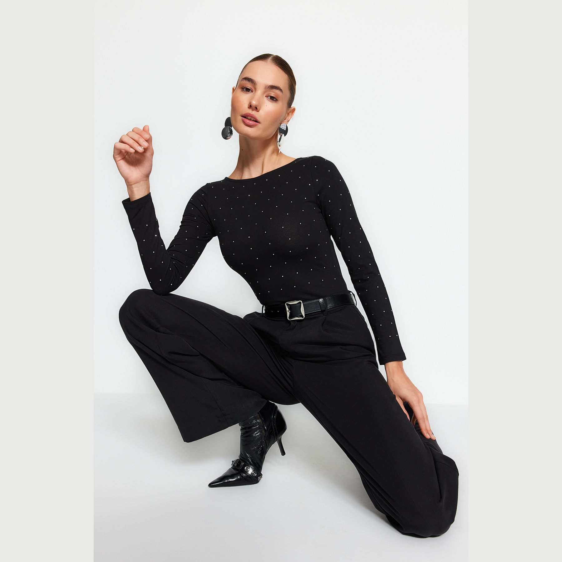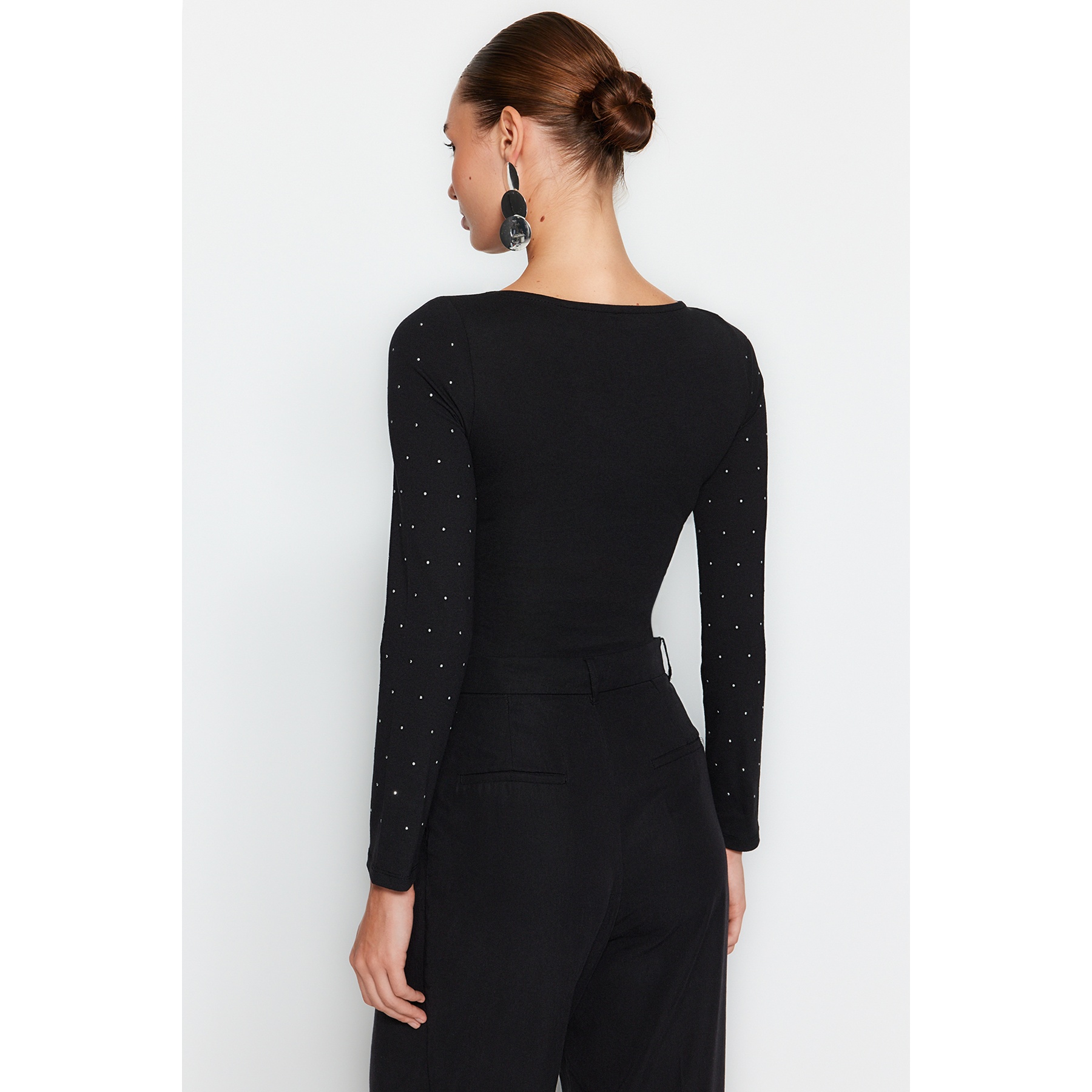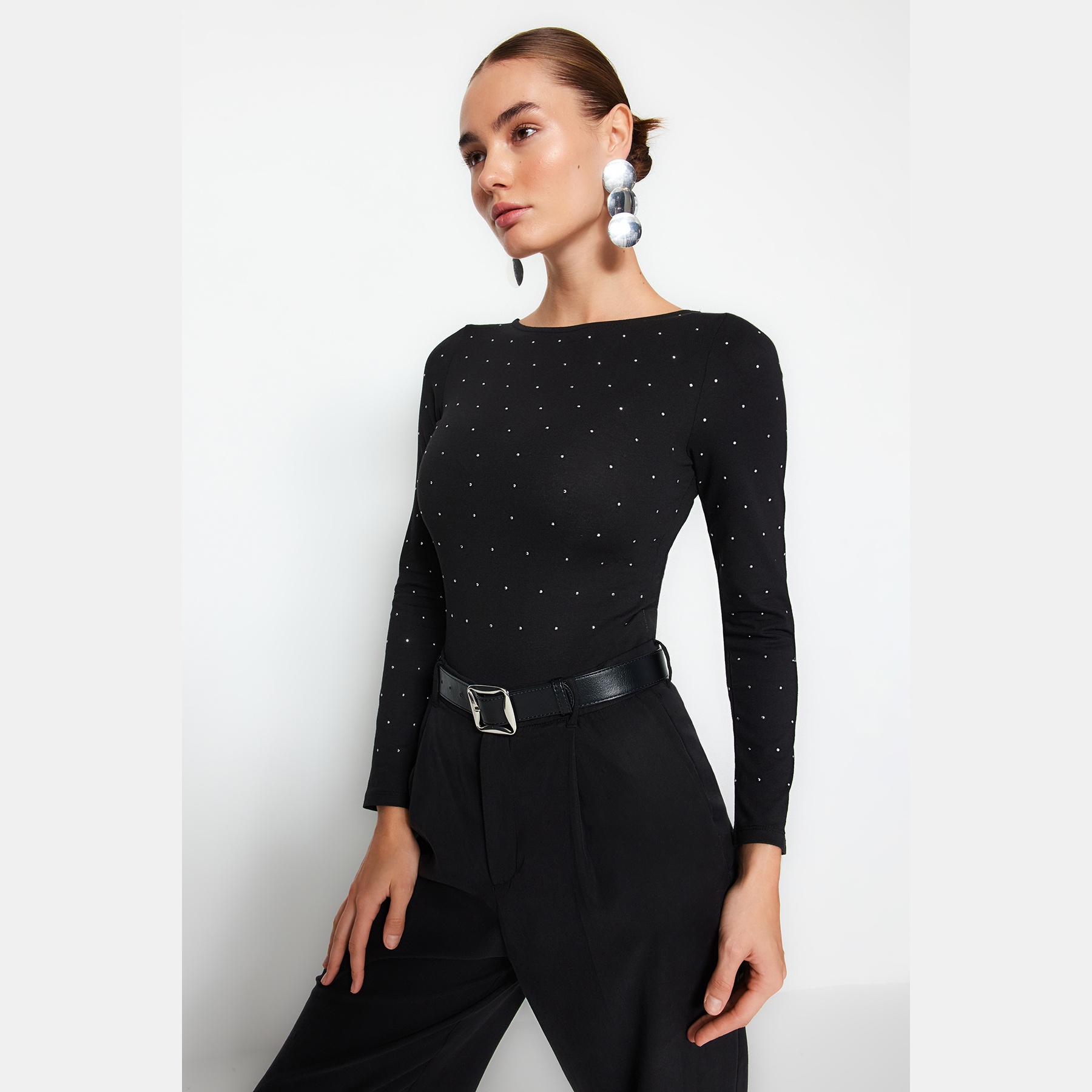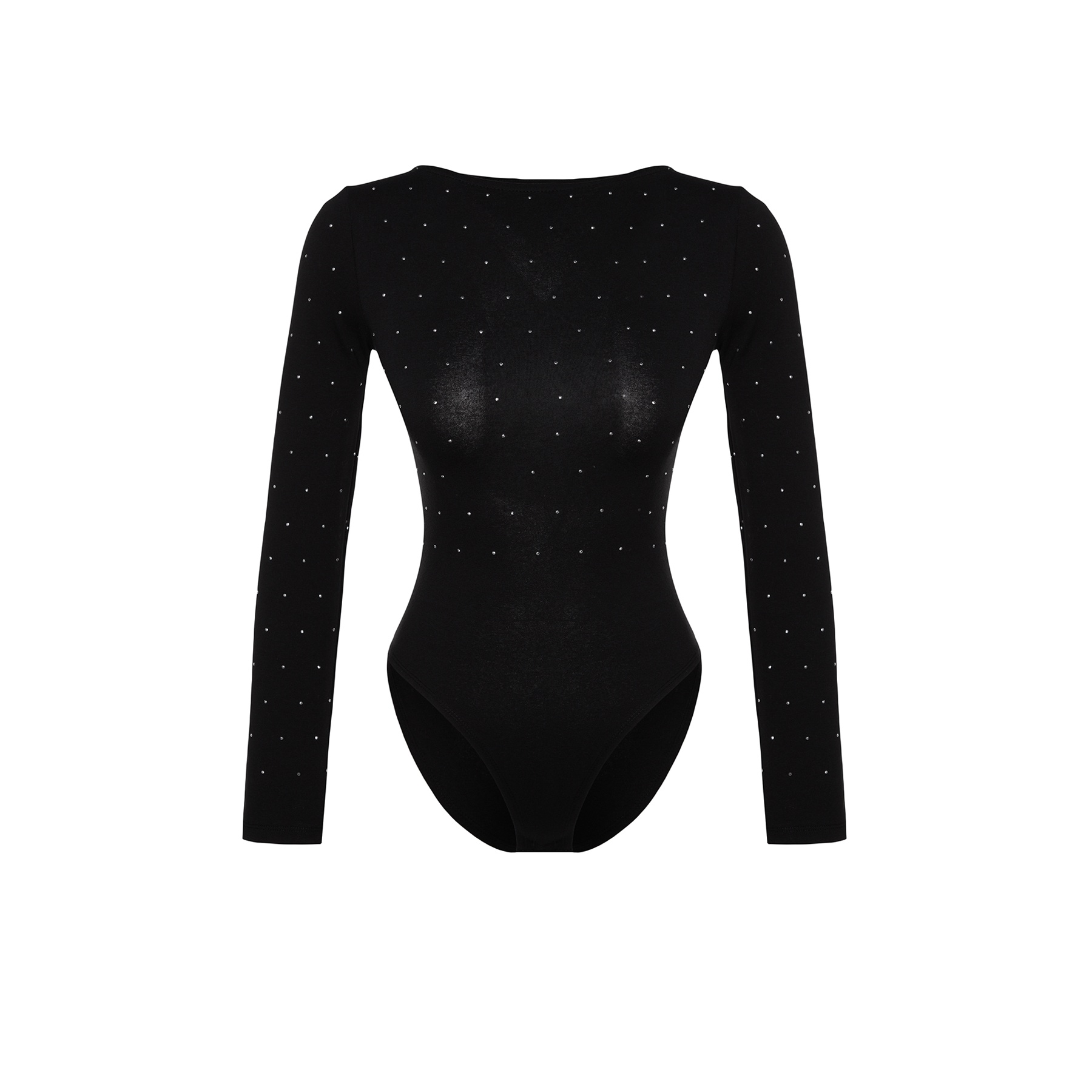بودي نسائي – أسود بتفاصيل أحجار لامعة وأكمام طويلة (تصميم أنيق بخامة قطنية مطاطية)