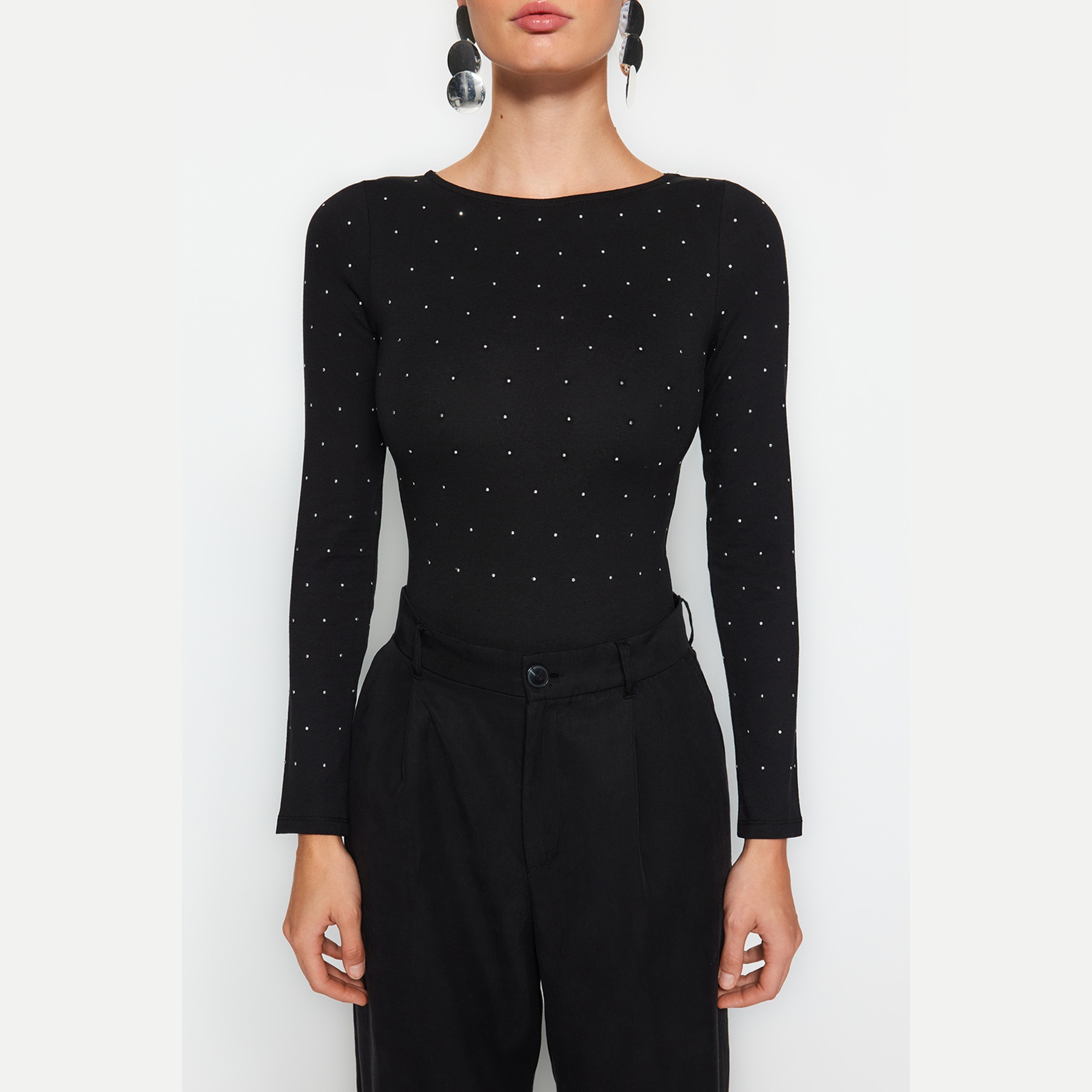 بودي نسائي بلون أسود، مصنوع من خامة تريكو مطاطية بتركيبة قطنية مريحة، يتميز بياقة دائرية كلاسيكية، وتفاصيل لامعة من الأحجار تضيف لمسة فاخرة، مع قصة Fitted تبرز القوام، وأكمام طويلة، وإغلاق سفلي بصَفّاطات عملية. تصميم مثالي للإطلالات اليومية أو المسائية المحتشمة.