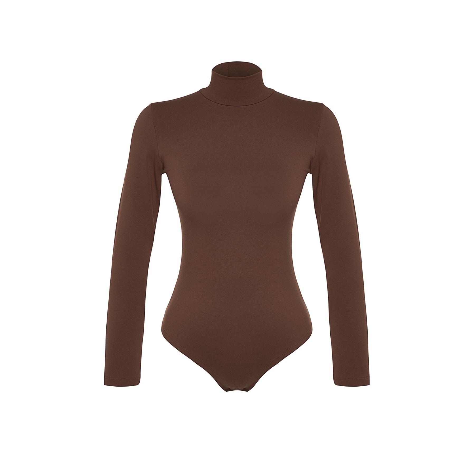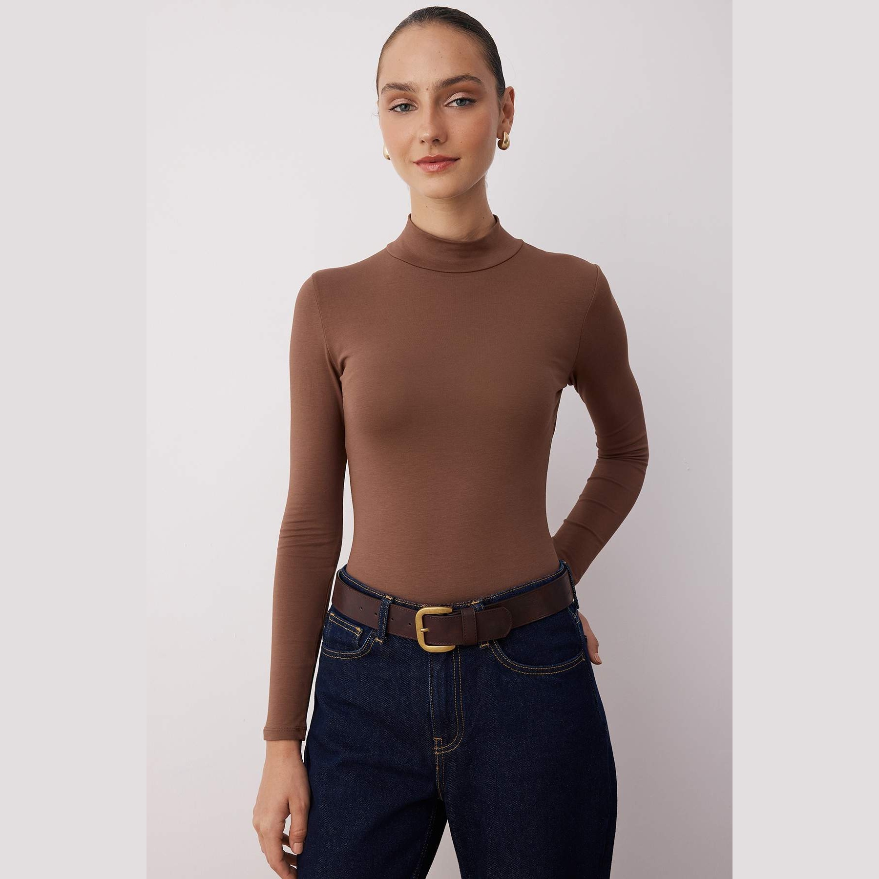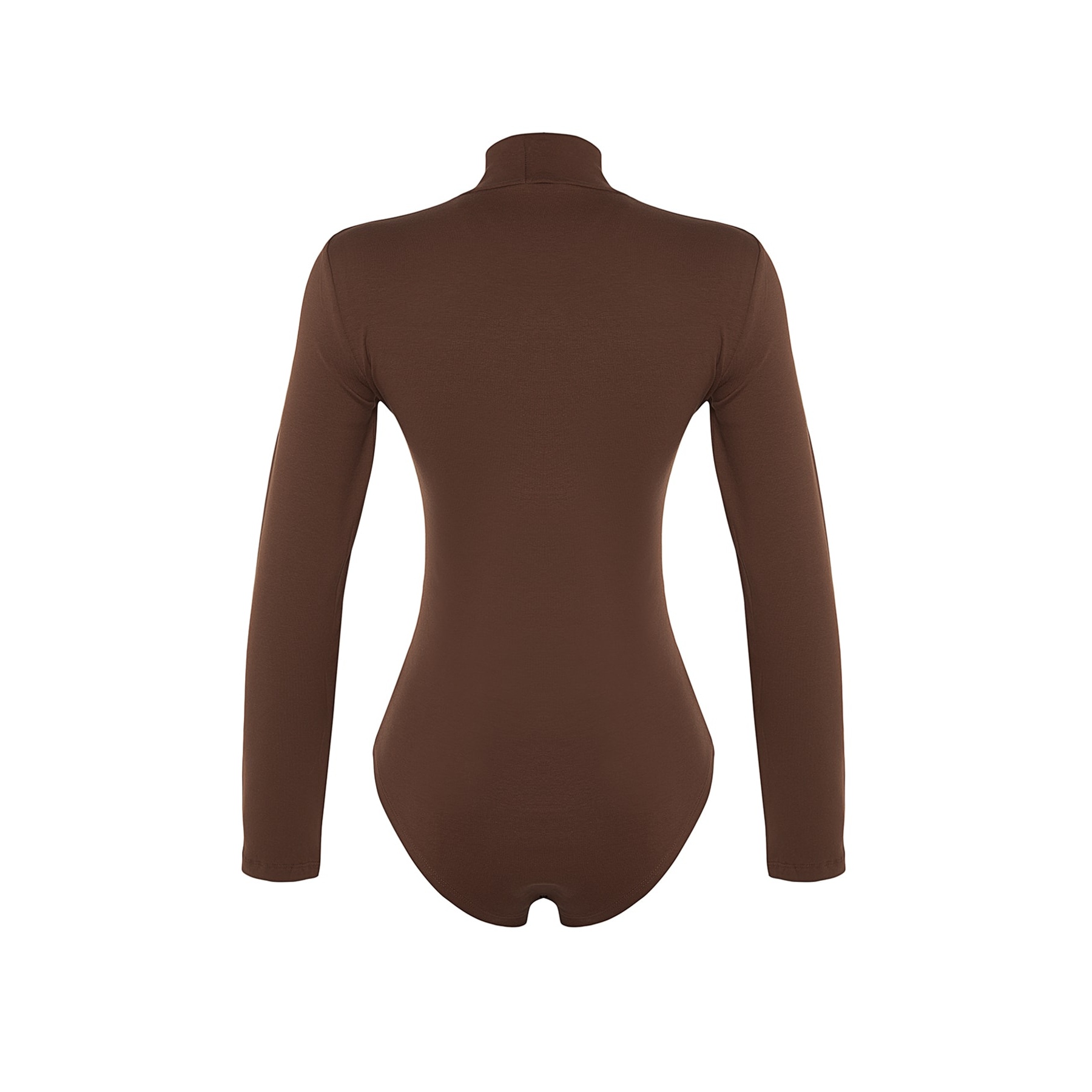 بودي نسائي بلون بني، مصنوع من خامة تريكو مطاطية بتركيبة قطنية مريحة، يتميز بياقة عالية أنيقة، مع قصة Fitted تبرز القوام، وأكمام طويلة، وإغلاق سفلي بصَفّاطات عملية. تصميم مثالي للإطلالات اليومية المحتشمة، ويُعتبر قطعة أساسية متعددة الاستخدامات.