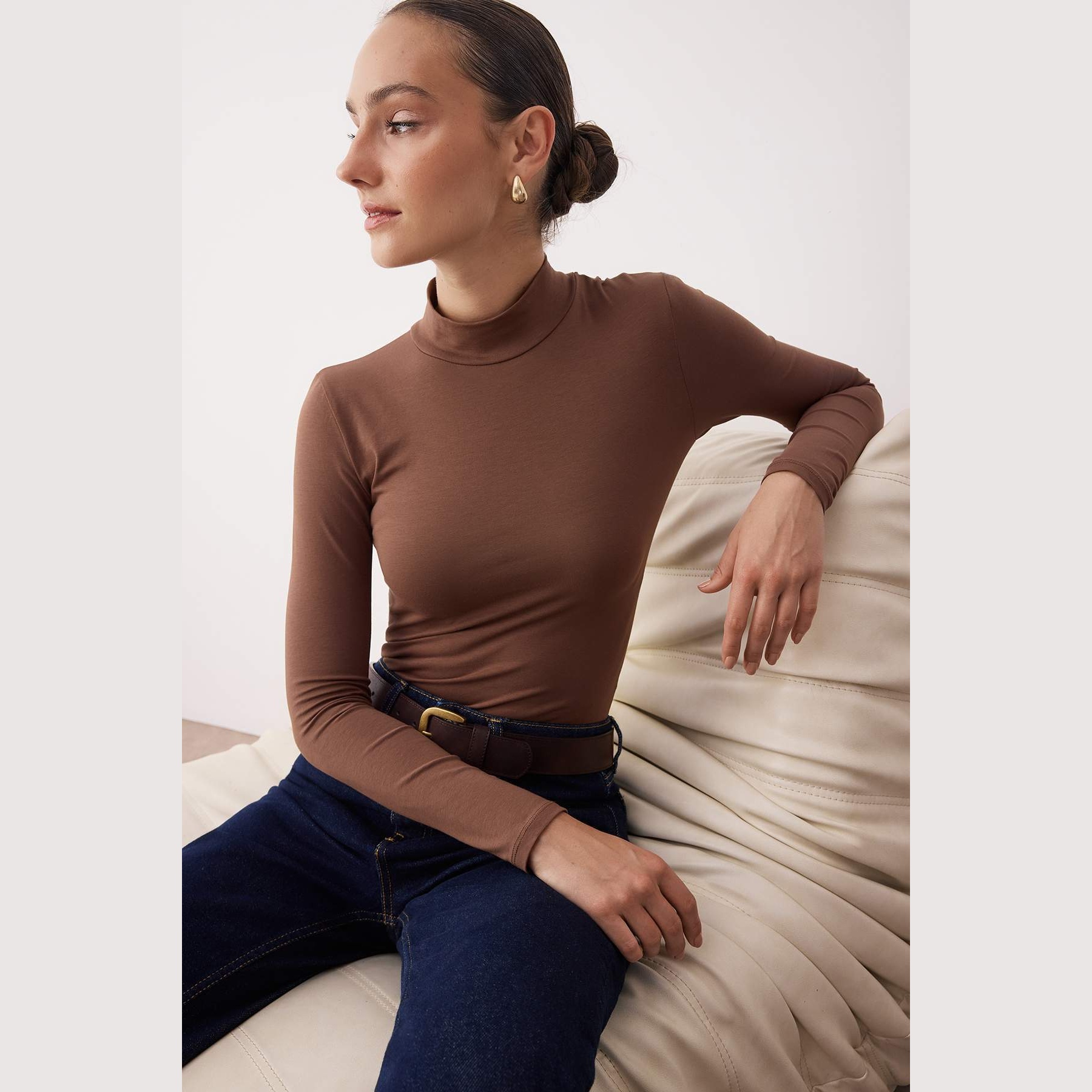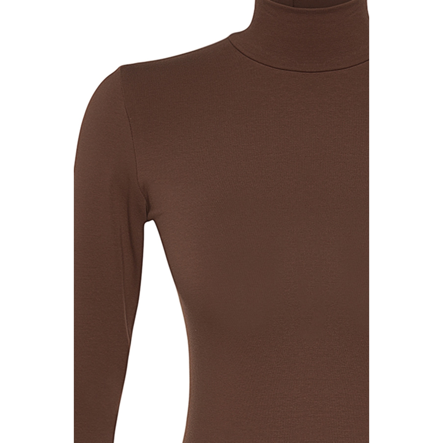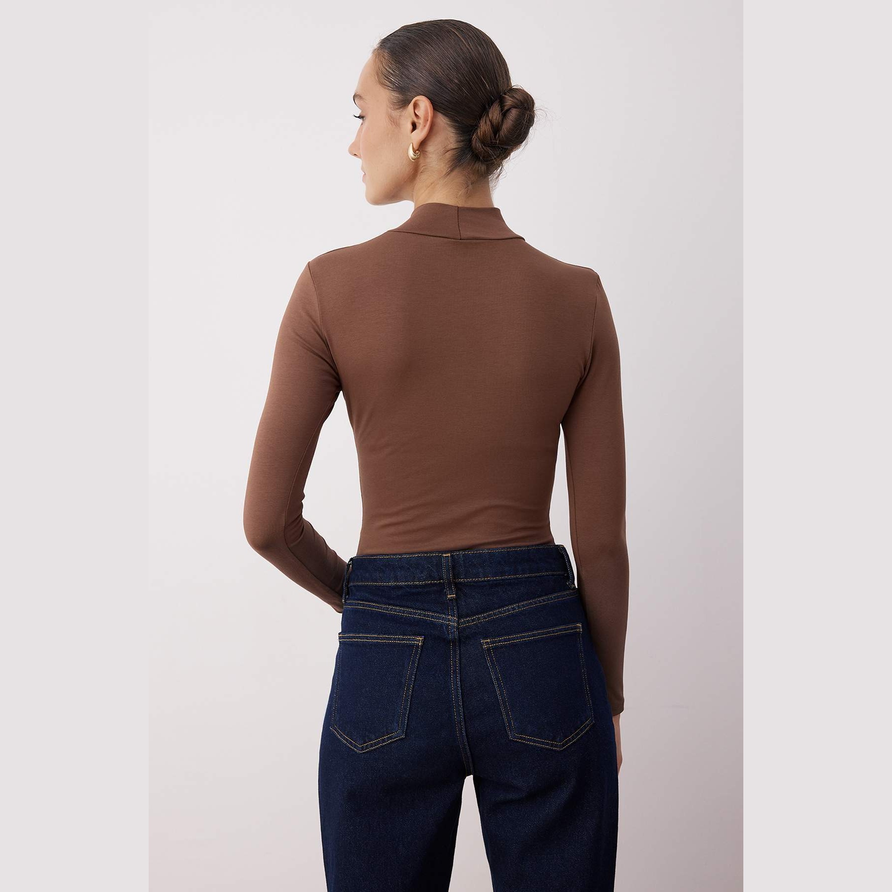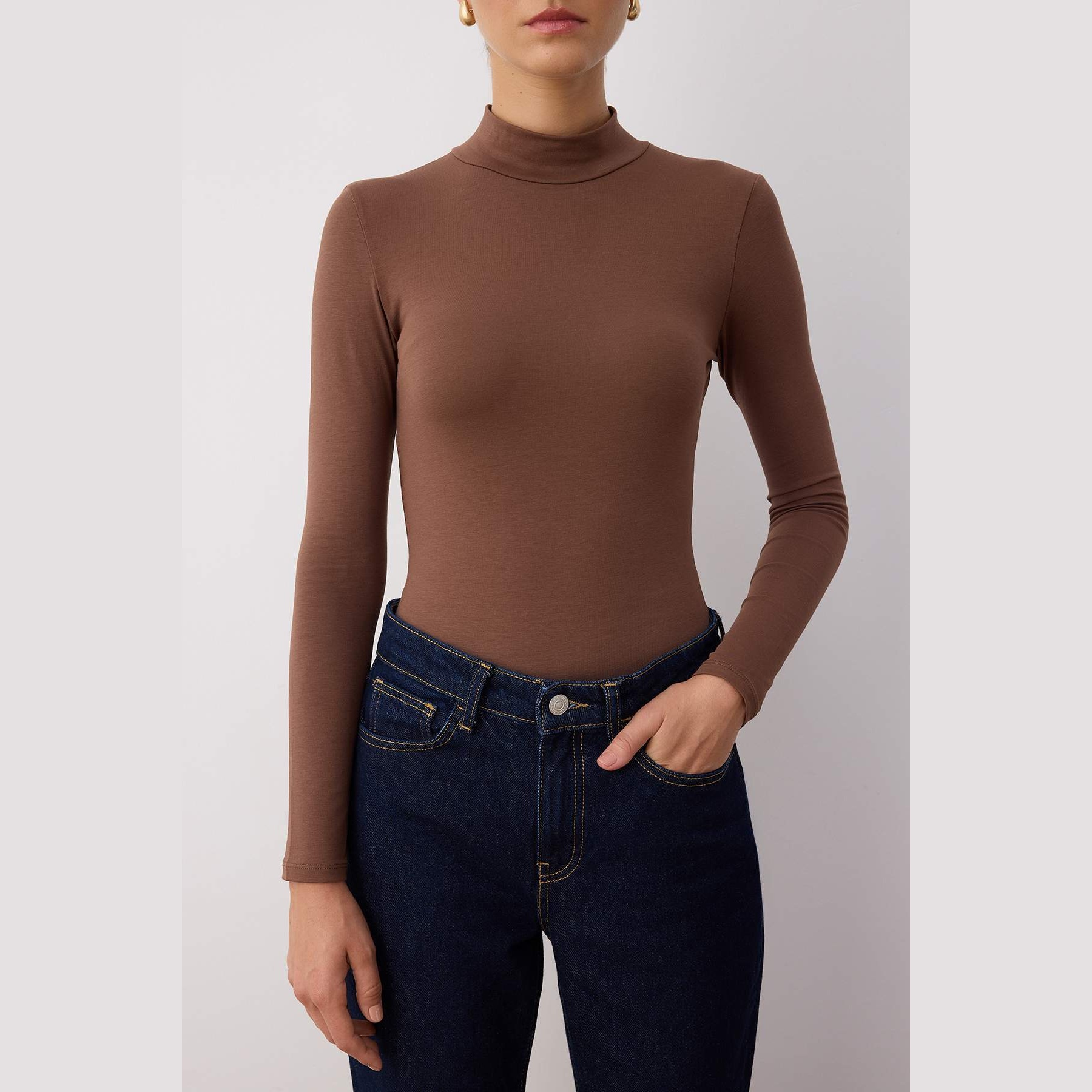 بودي نسائي بلون بني، مصنوع من خامة تريكو مطاطية بتركيبة قطنية مريحة، يتميز بياقة عالية أنيقة، مع قصة Fitted تبرز القوام، وأكمام طويلة، وإغلاق سفلي بصَفّاطات عملية. تصميم مثالي للإطلالات اليومية المحتشمة، ويُعتبر قطعة أساسية متعددة الاستخدامات.