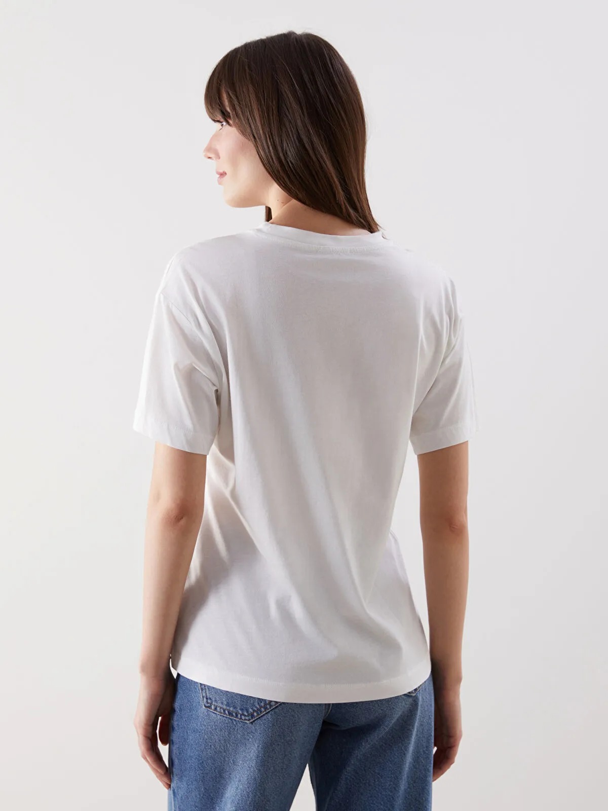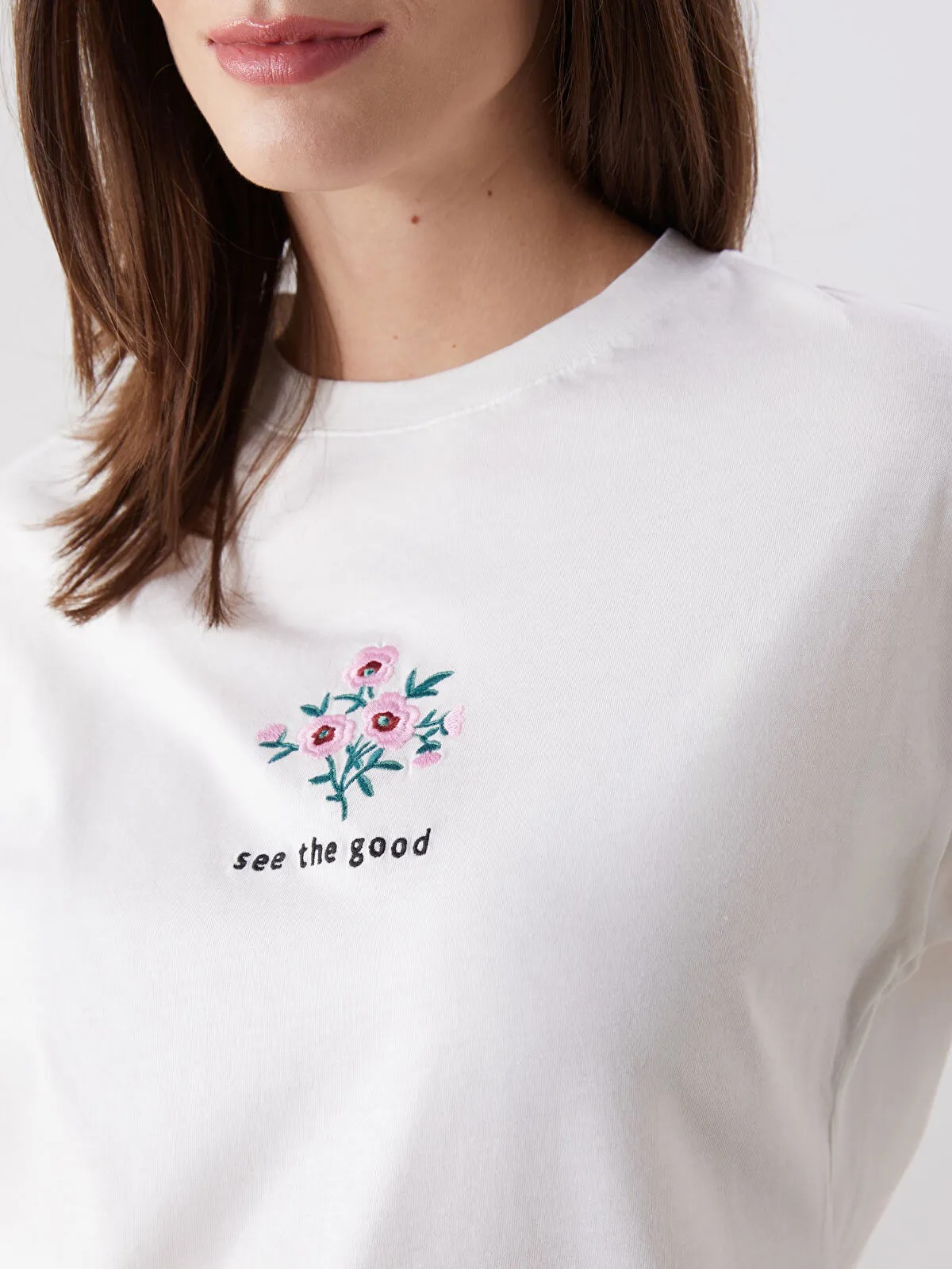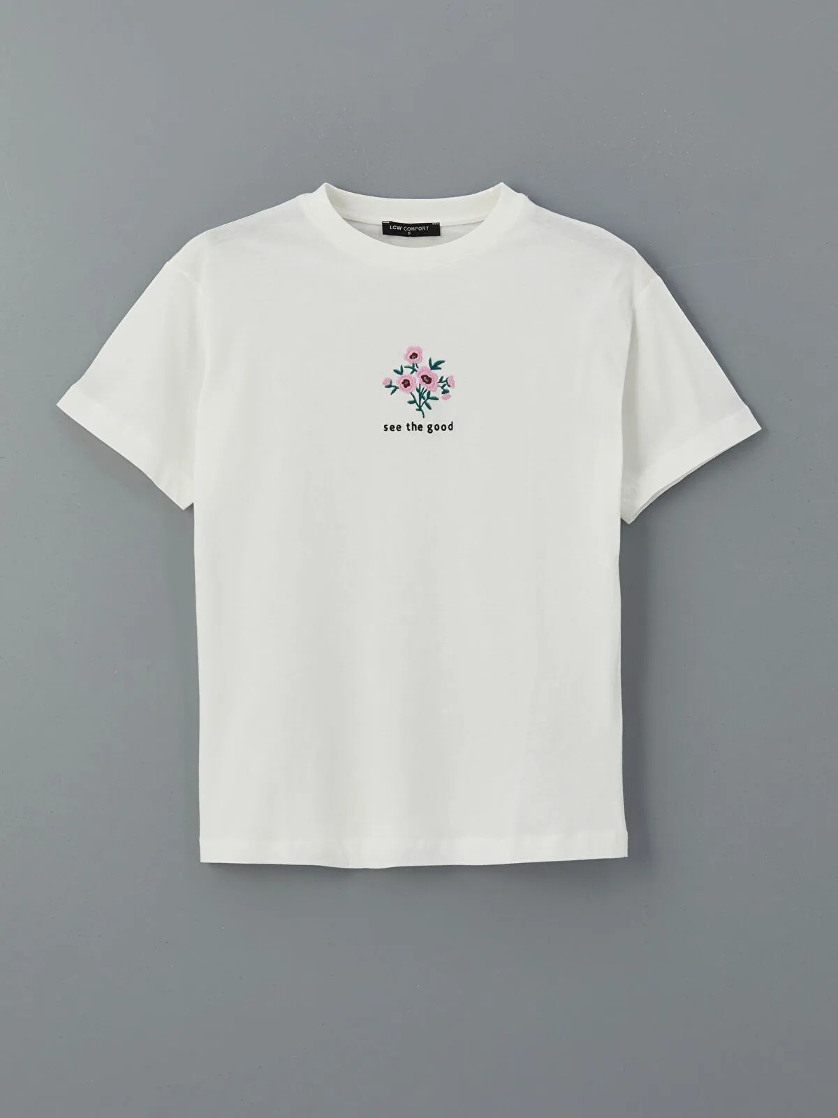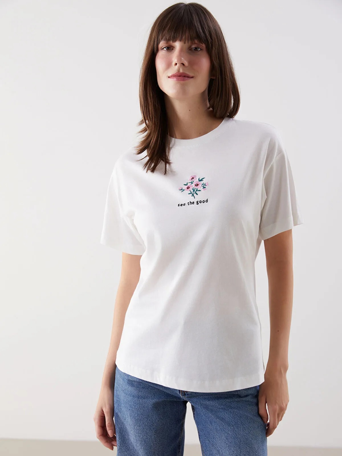 تيشيرت نسائي بلون بيج فاتح ناعم (Ekru)، بياقة دائرية قصيرة وأكمام قصيرة، مزين بتطريز زهري أنيق يعطي لمسة أنثوية رقيقة مبهجة. تصميم Regular Fit يمنح راحة وحرية حركة طوال اليوم، مثالي للإطلالة الكاجوال الأنيقة والمريحة.