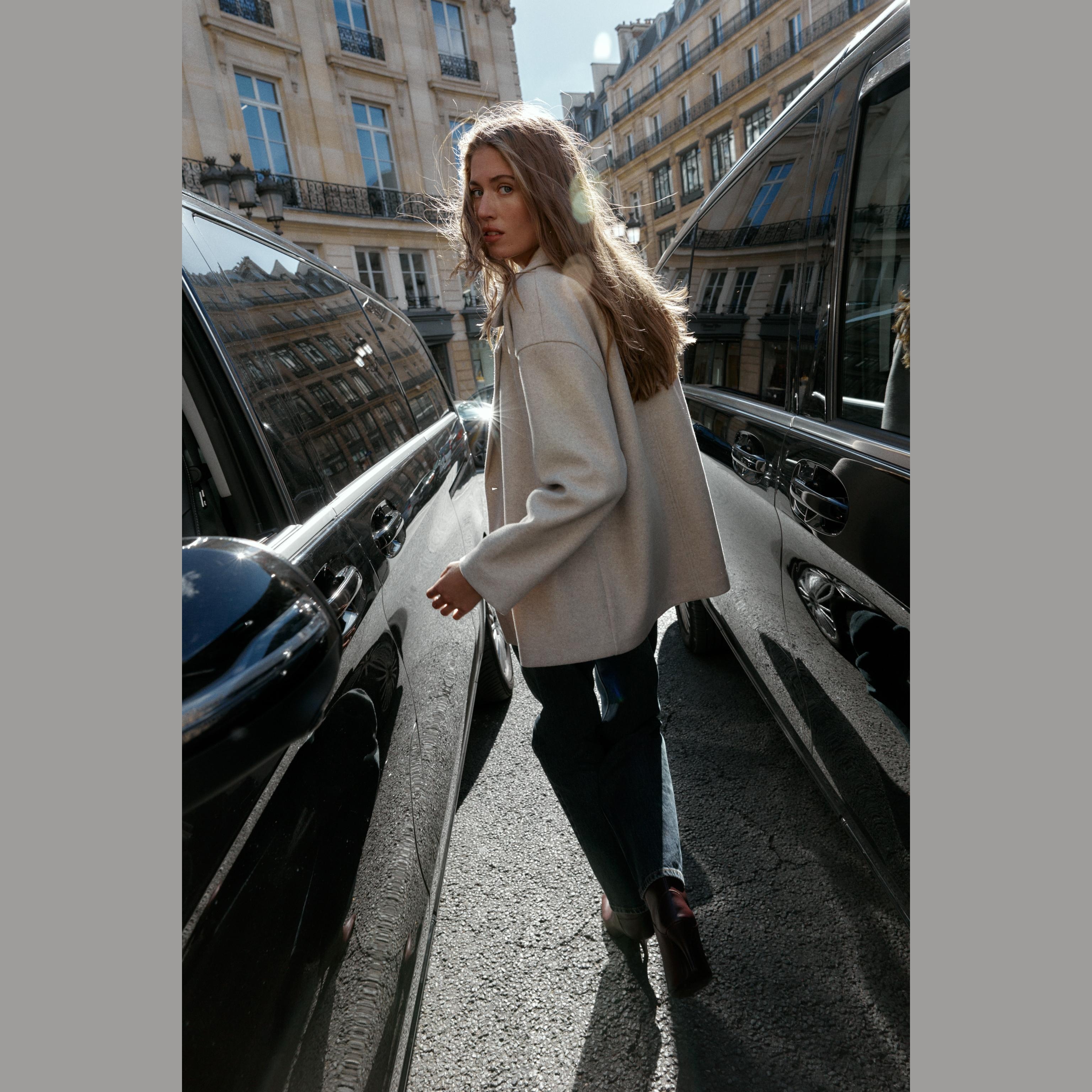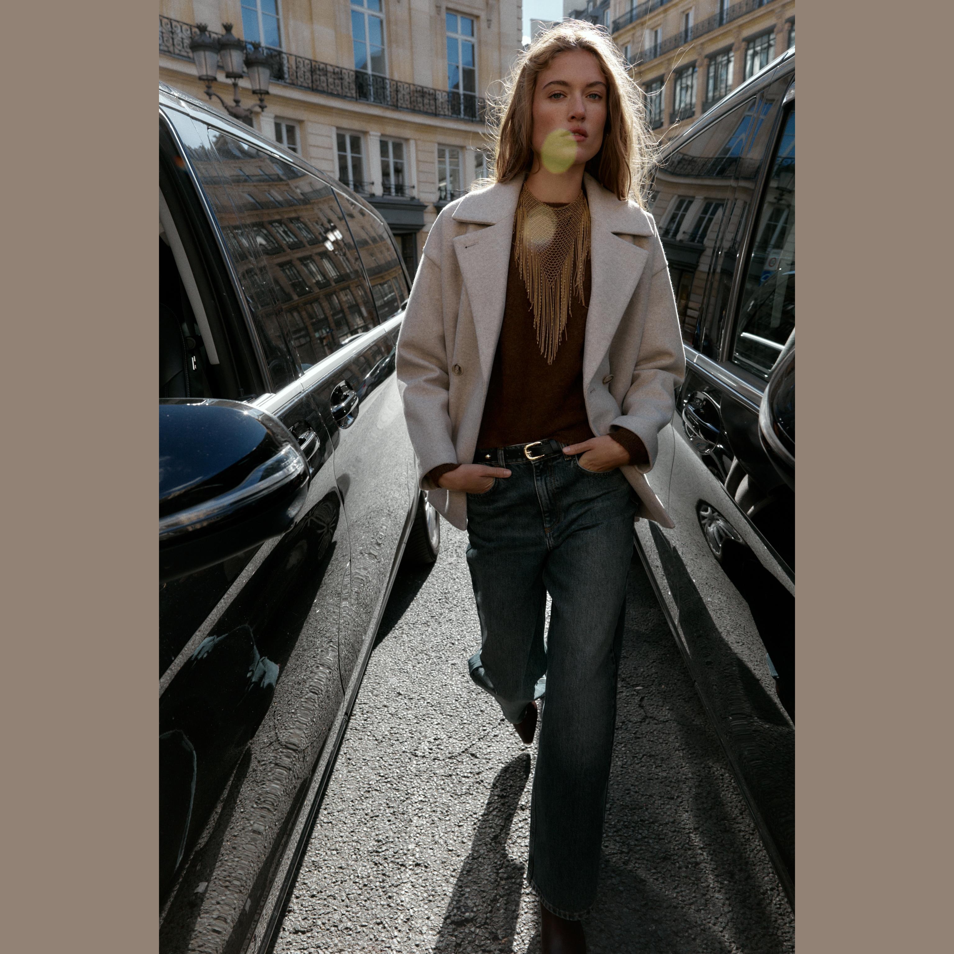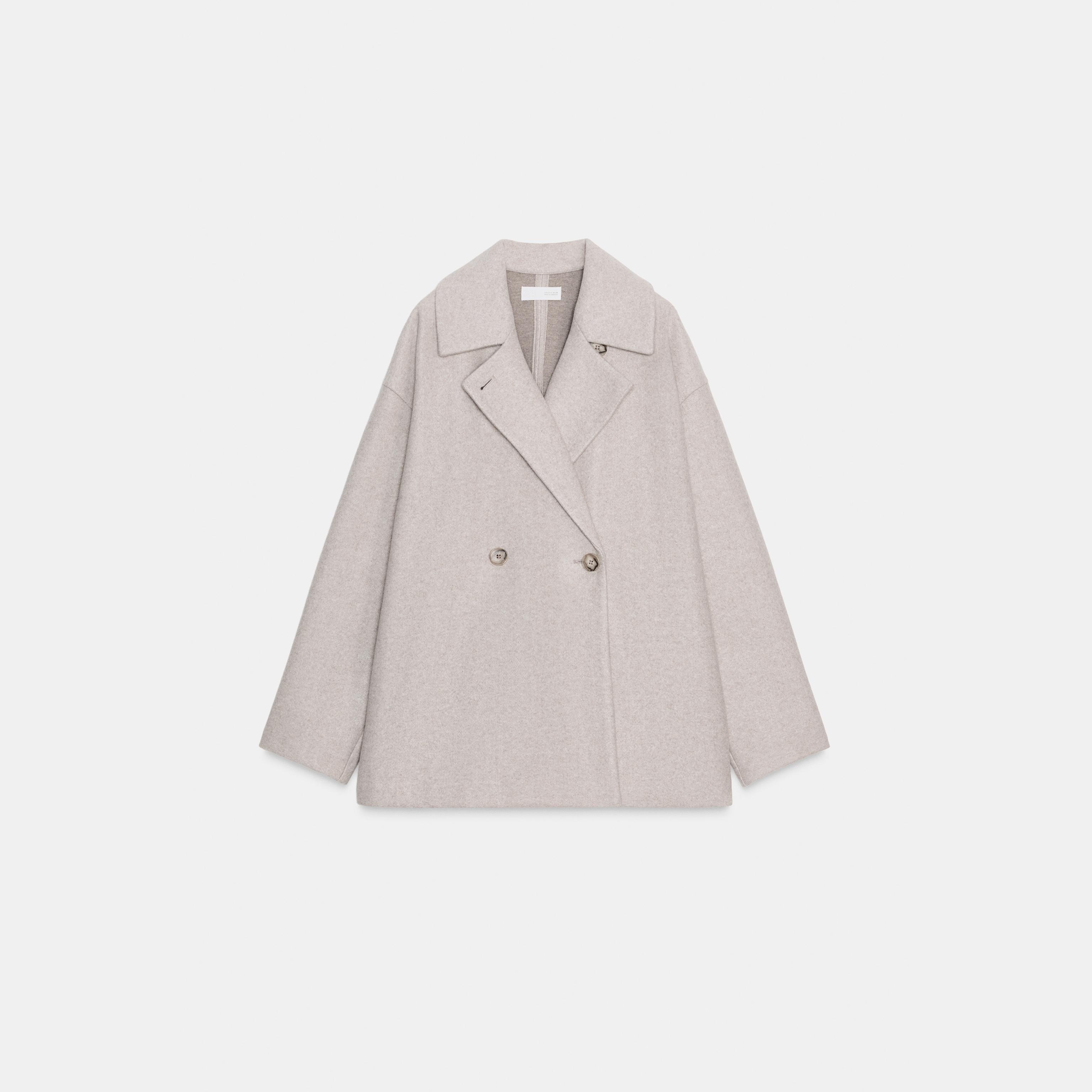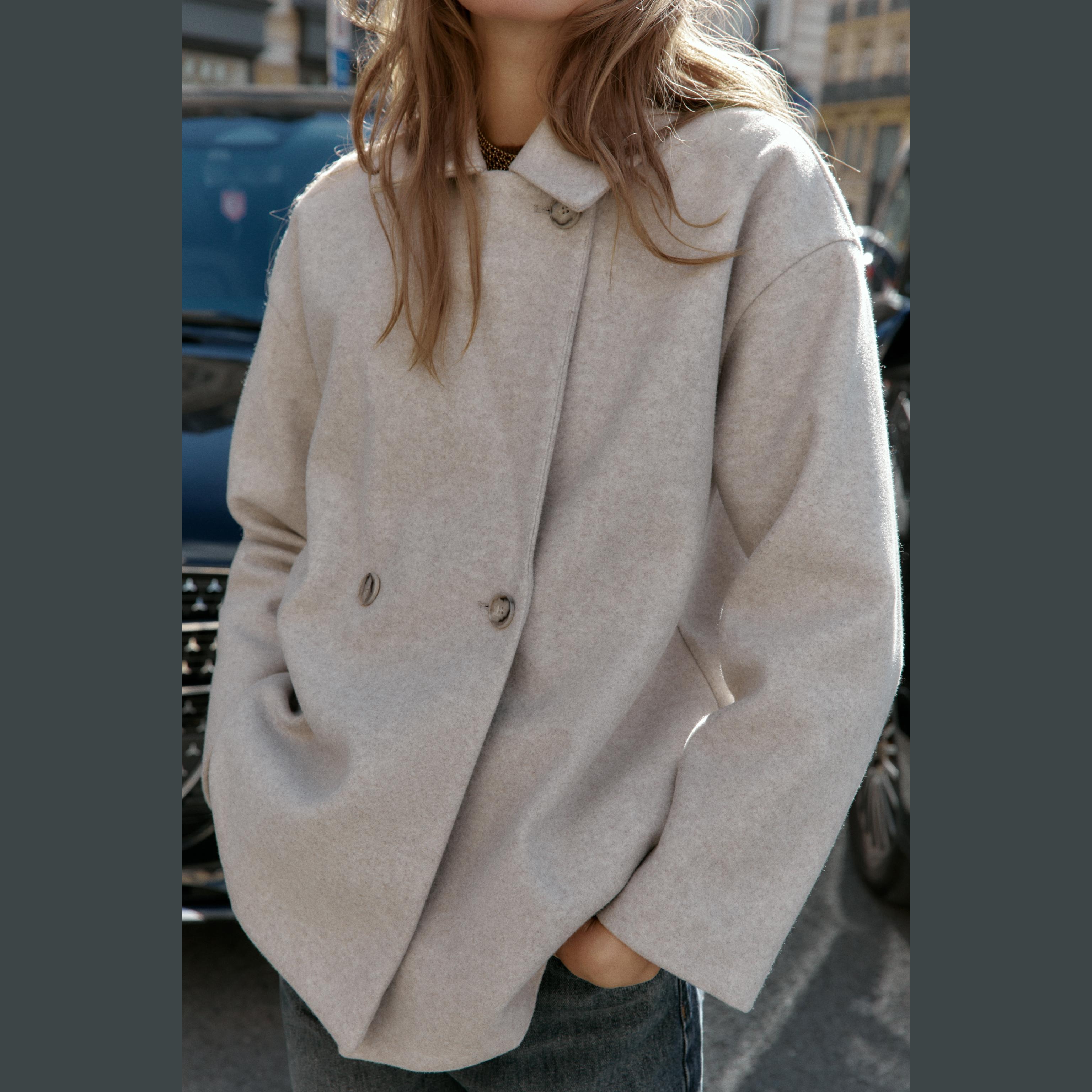 - التصميم: معطف مزدوج الصدر ناعم (Soft Double-Breasted Coat)