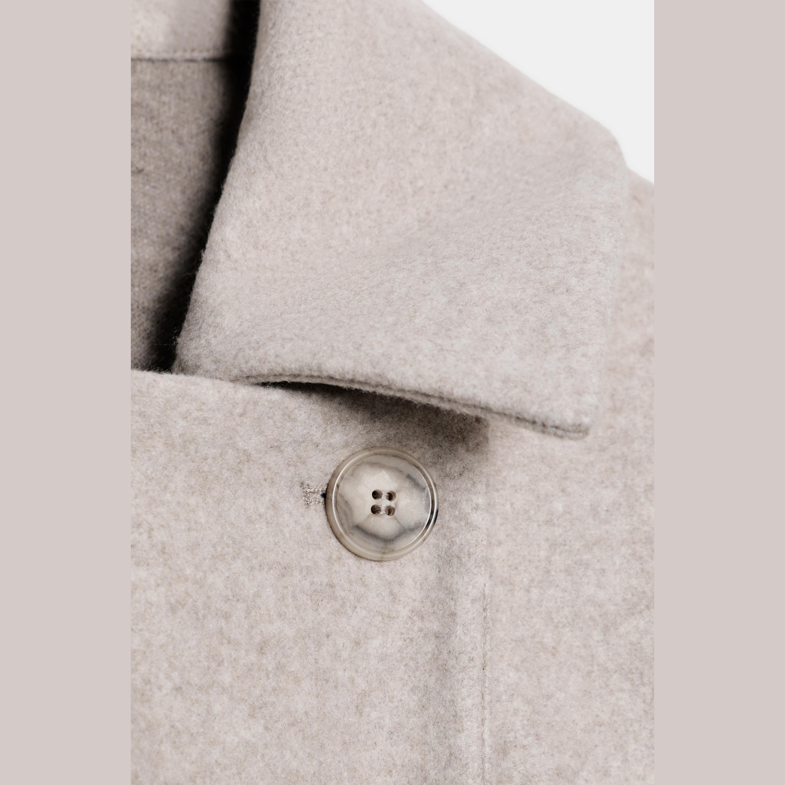 معطف أنيق بلون بيج فاتح حيادي، مصنوع من خامة صناعية ناعمة تمنح مظهرًا عمليًا وراحة في الارتداء. يتميز بياقة نوتش كلاسيكية وأكمام طويلة مع إغلاق أمامي مزدوج بالأزرار. تصميم مستقيم مع حافة سفلية ناعمة، مثالي للإطلالات اليومية أو الرسمية في المواسم الباردة.