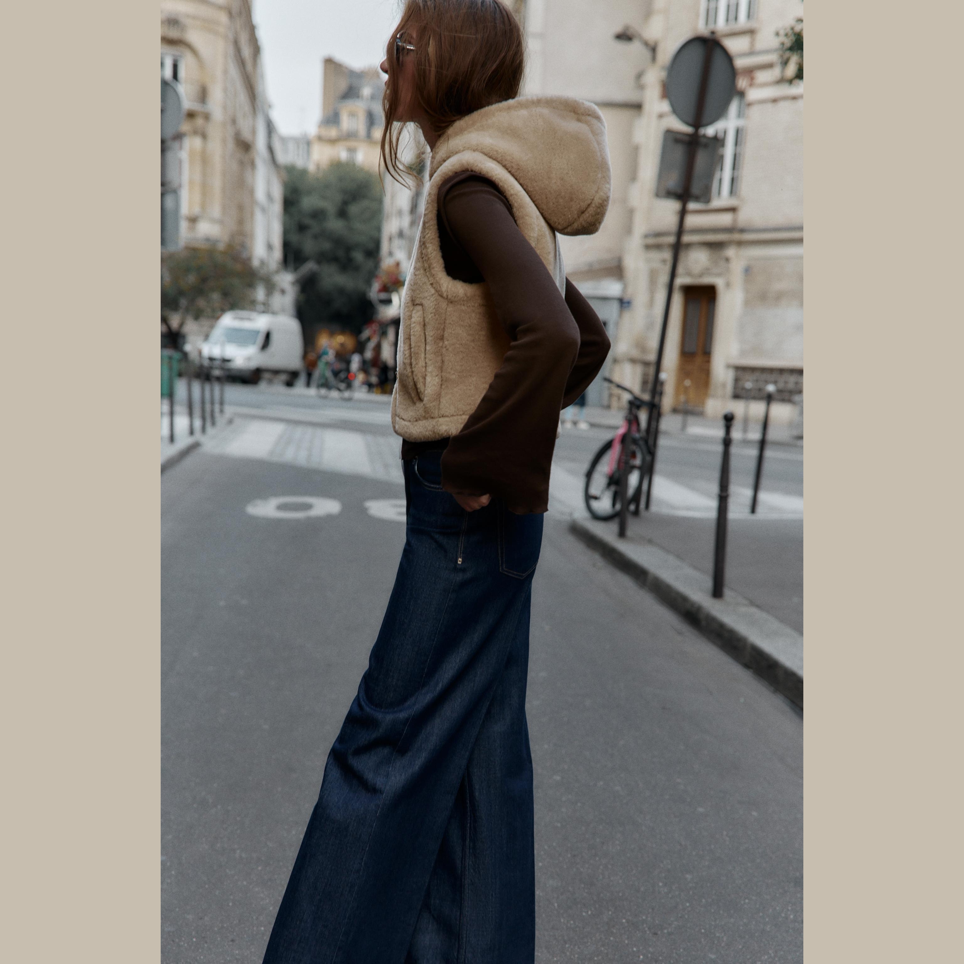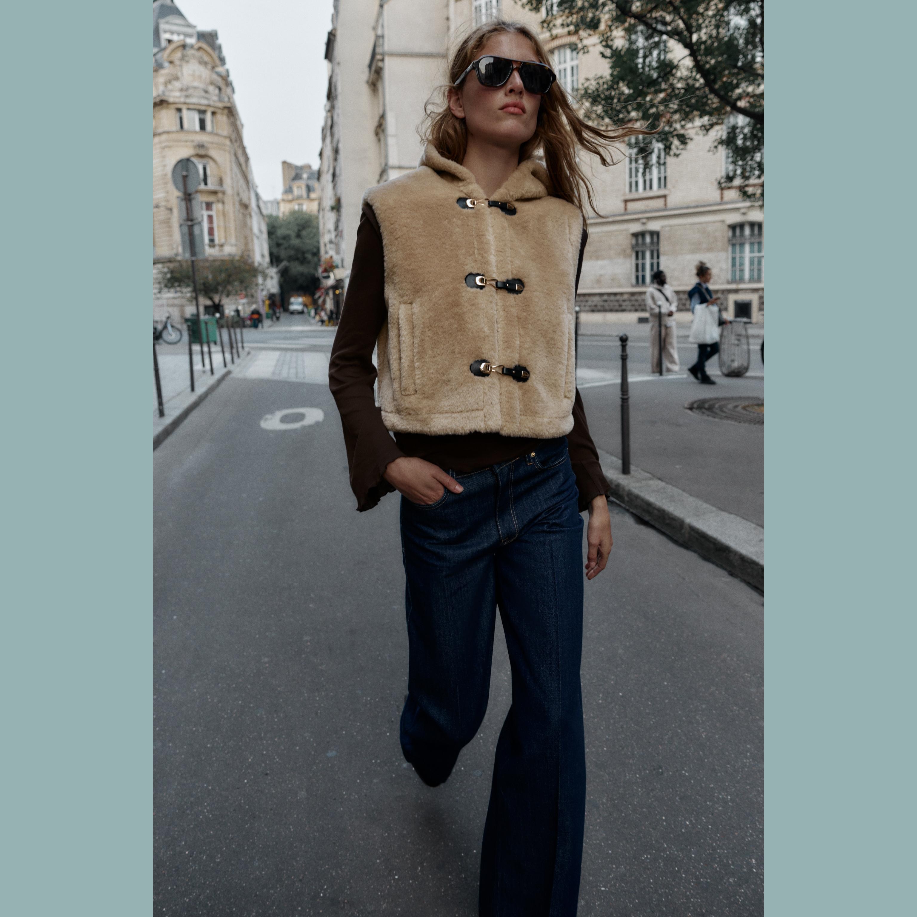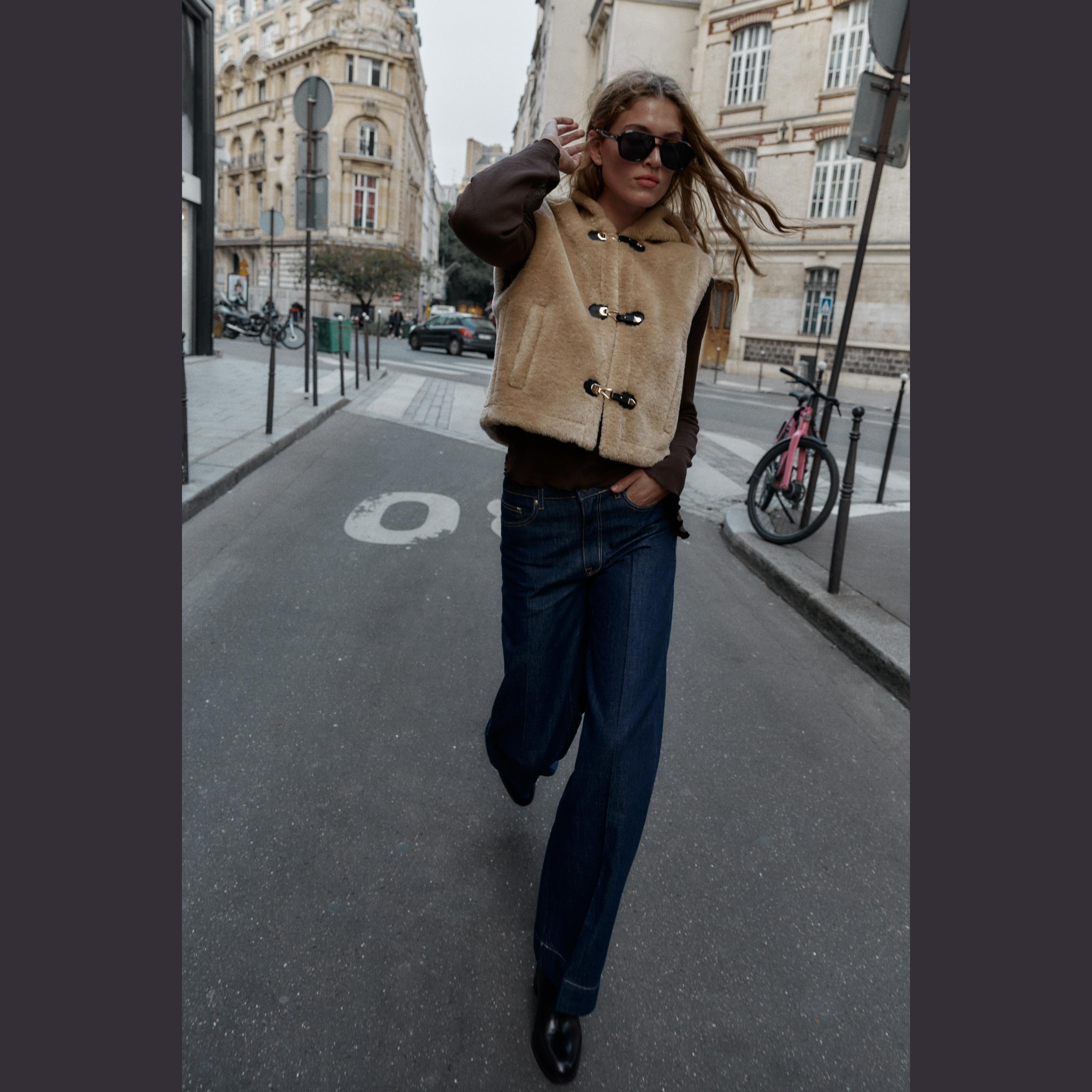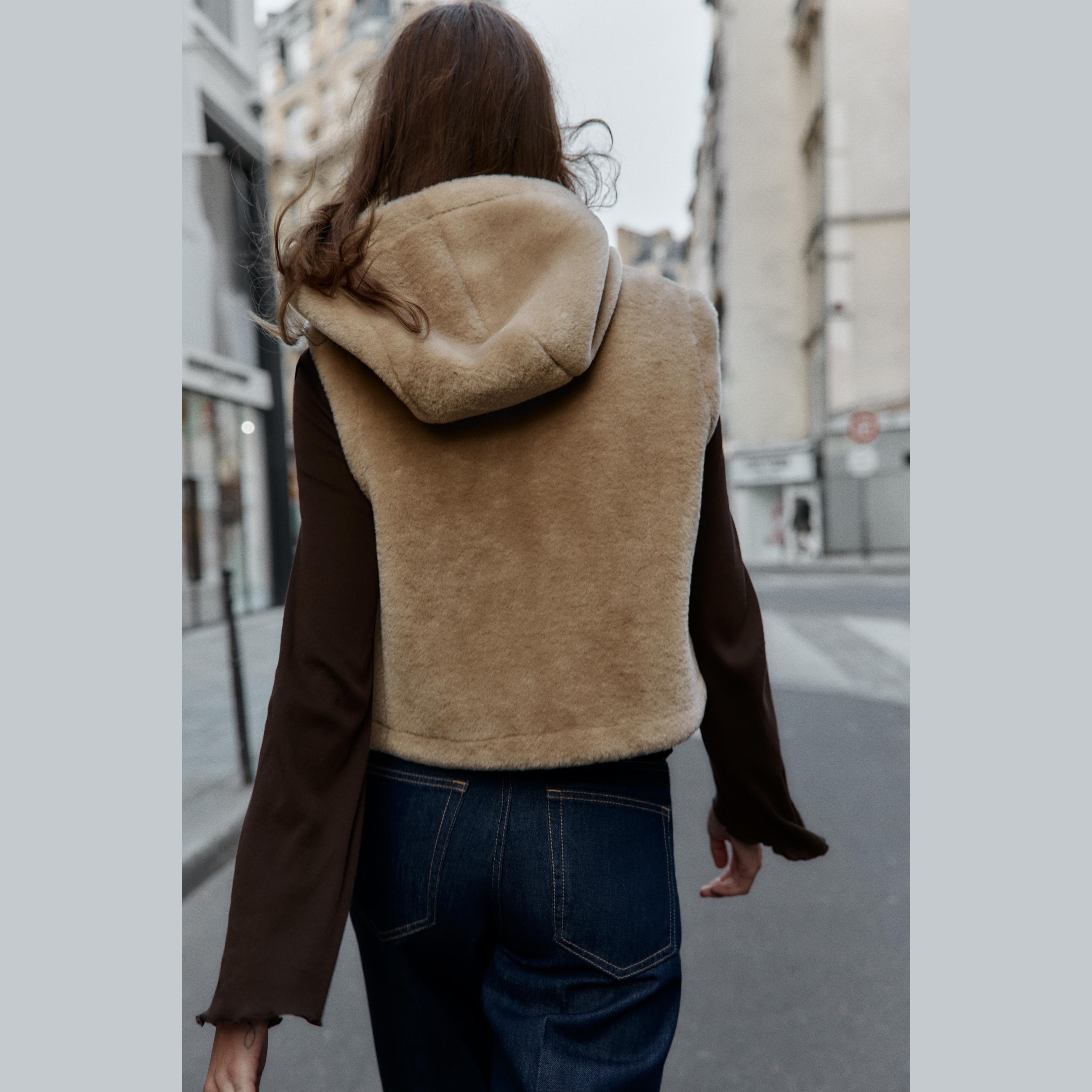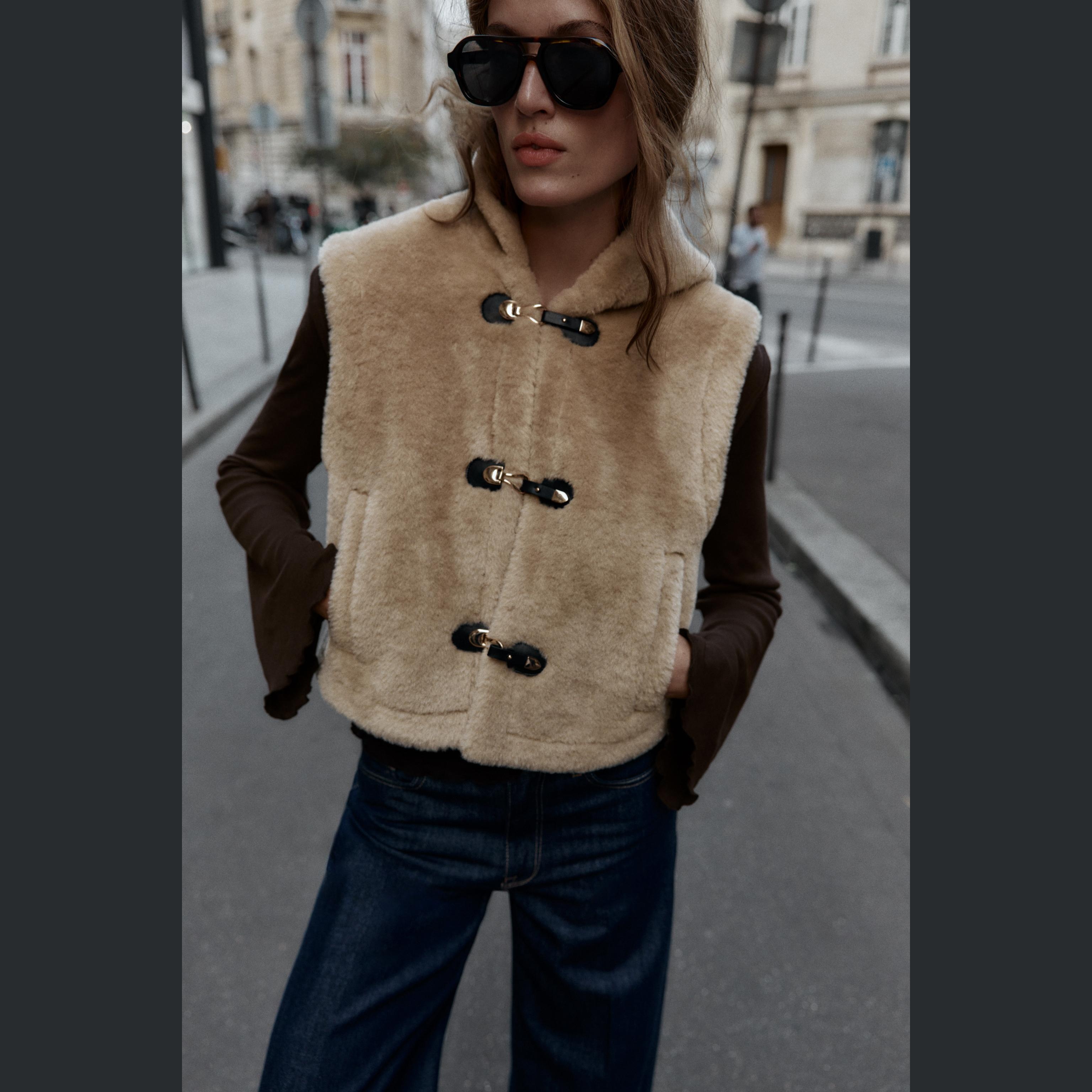 جيليه أنيق بدون أكمام بلون كاميل حيادي دافئ، مصنوع من فرو صناعي ناعم يمنح مظهرًا عصريًا وراحة في الارتداء. يتميز بقبعة عملية وجيوب أمامية جانبية، مع إغلاق أمامي بتوغلز خشبية أنيقة. مثالي للإطلالات الكاجوال في المواسم الباردة.